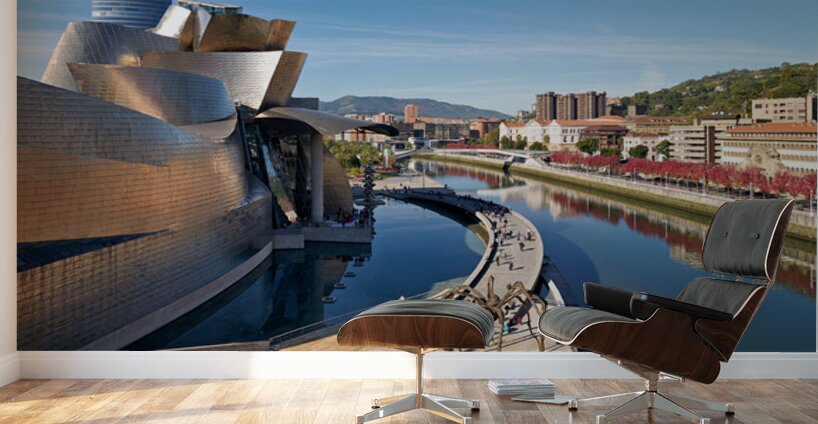 Visitors walk along the riverbank in Bilbao by the Guggenheim Museum. The buildings reflect modern design under a clear blue sky.