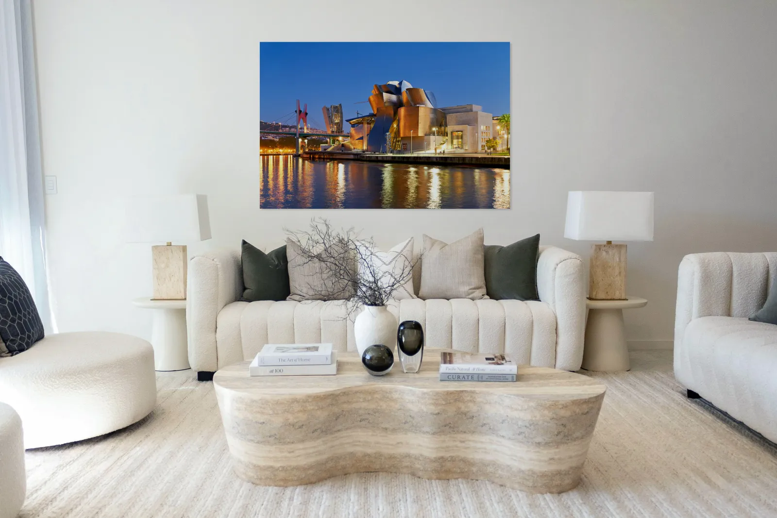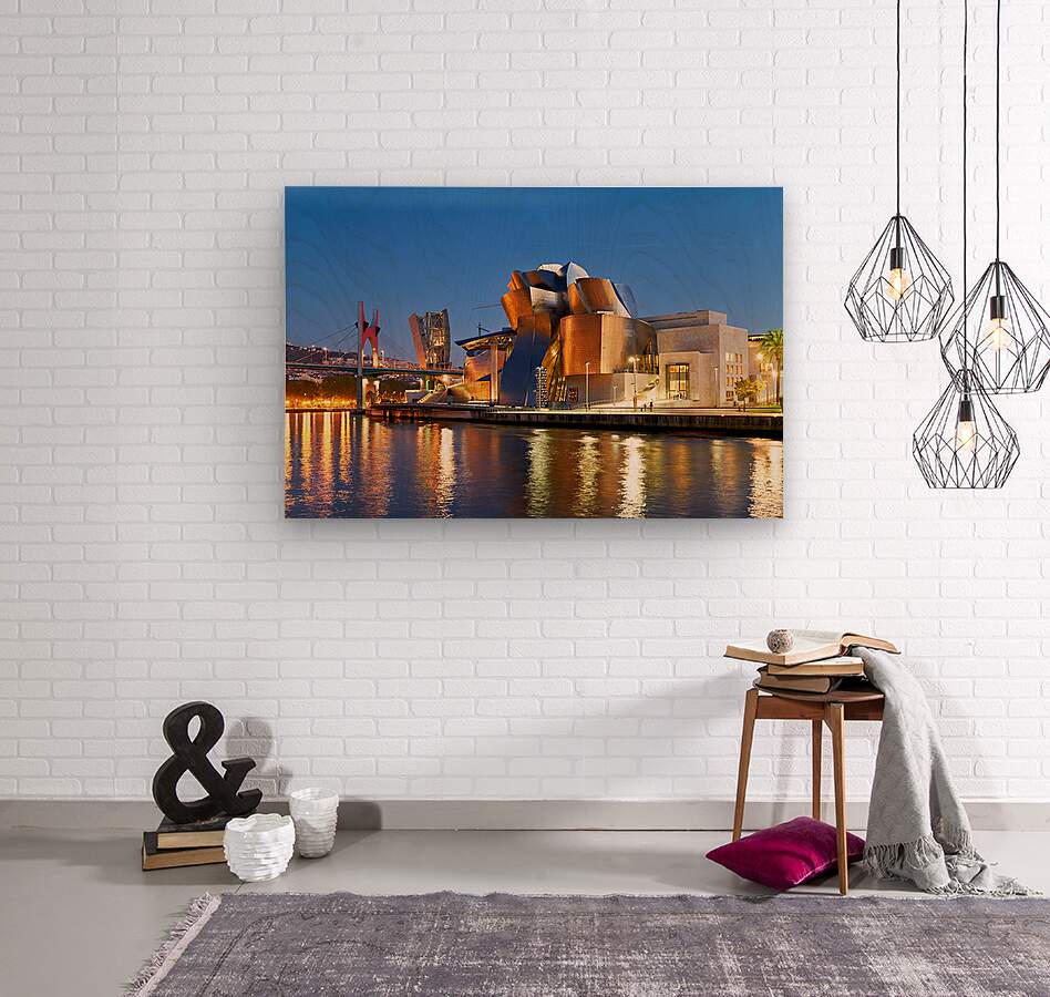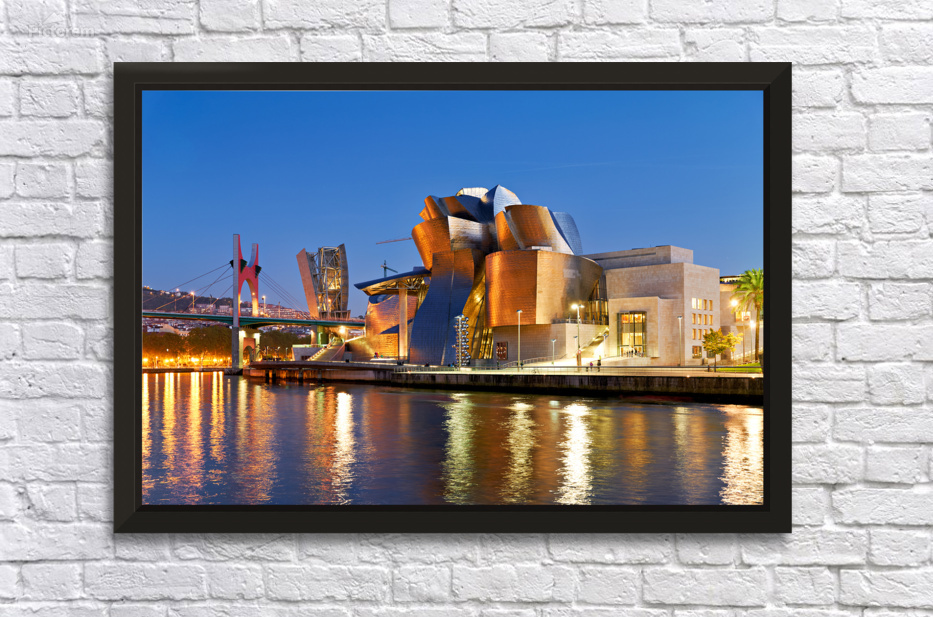 Visitors walk near the Guggenheim Museum in Bilbao as the sun sets on the river. Lights reflect on the water creating a lively scene.