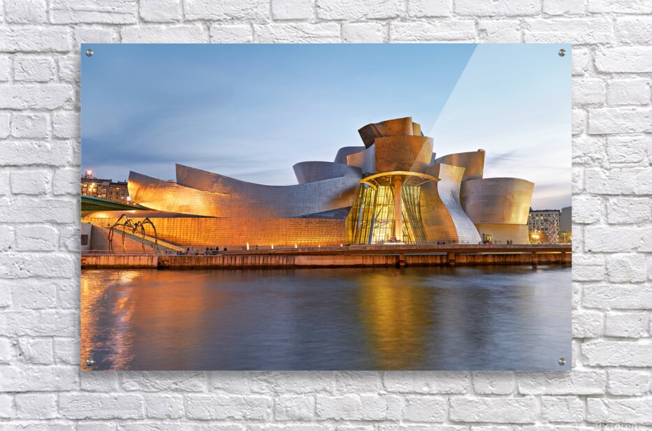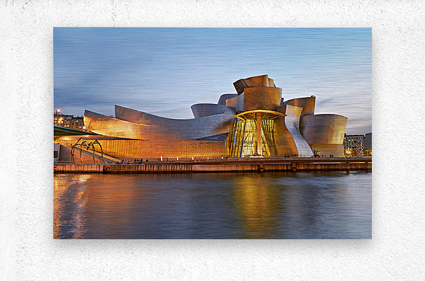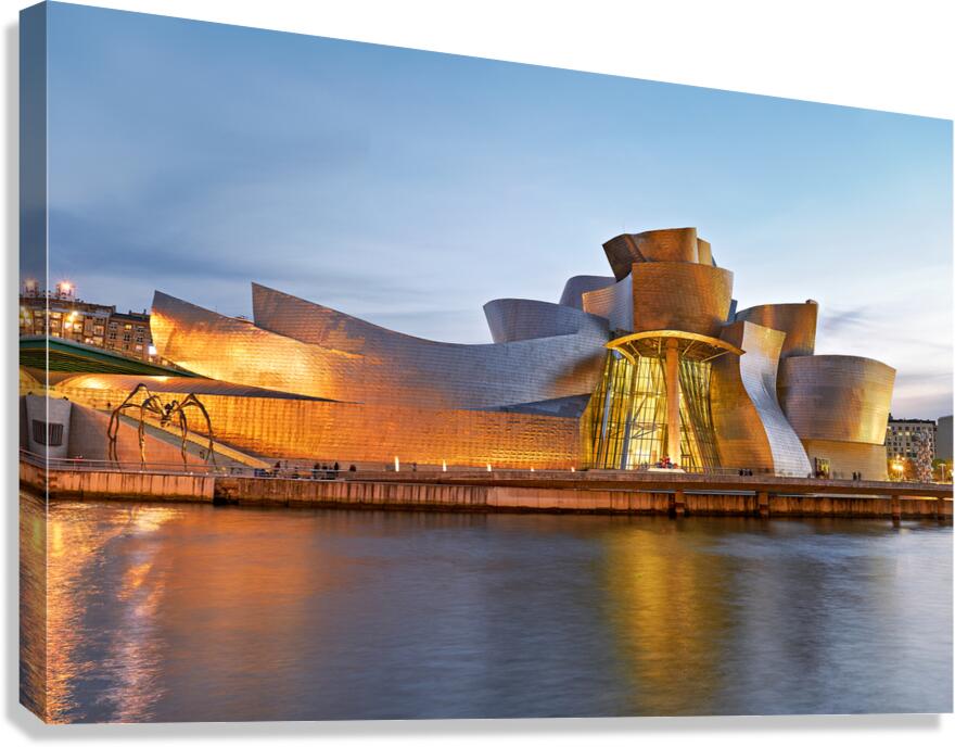 SUR CETTE OEUVRE: GUGGENHEIM MUSEUM SHINES AT NIGHT IN BILBAO SPAIN