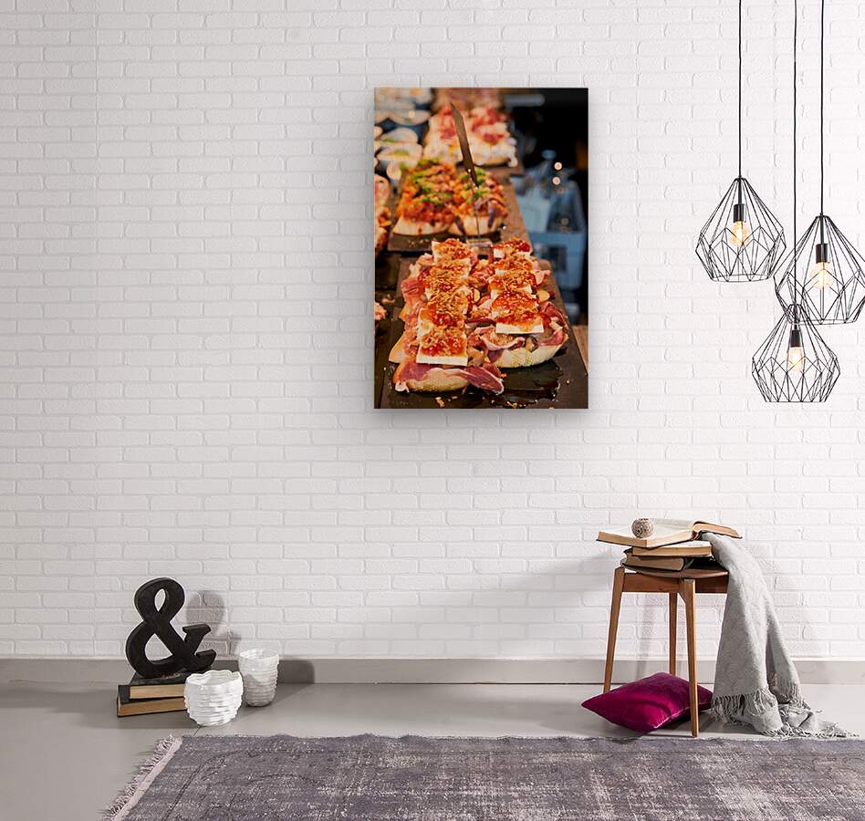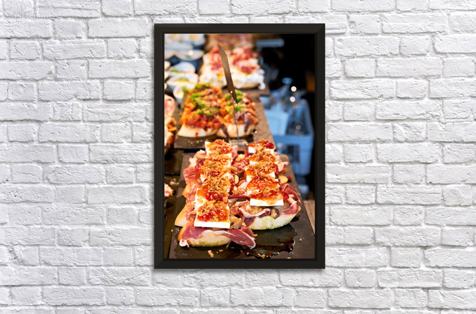 A variety of pintxos are displayed on a table in Bilbao Spain. These snacks showcase traditional Basque cuisine and local ingredients.
