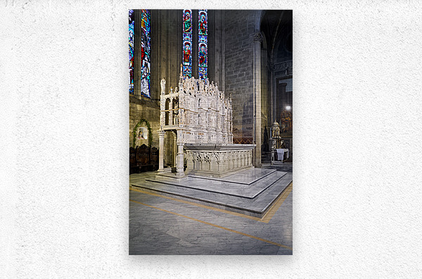 Inside the Cathedral of Saints Peter and Donatus a detailed altar stands. Colorful stained glass windows fill the space with light.