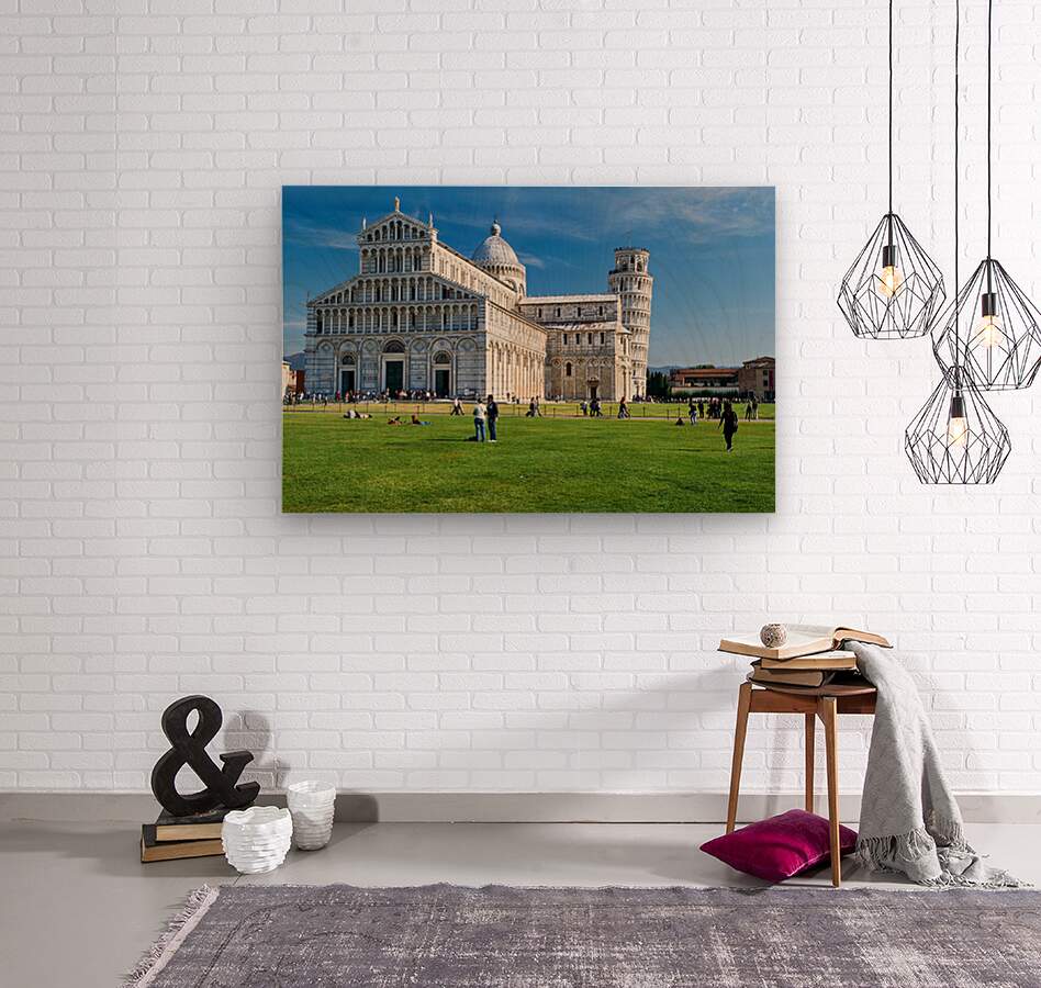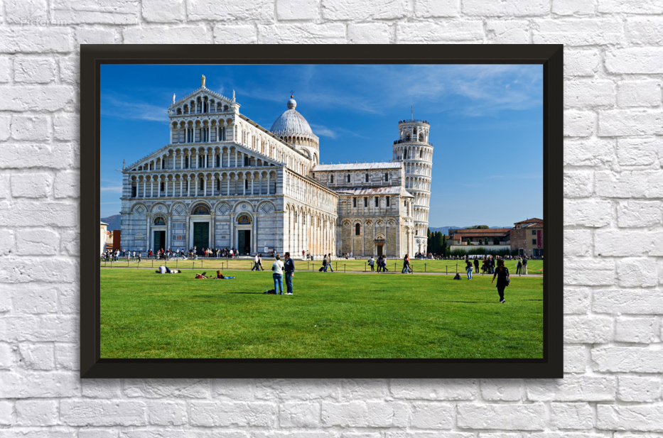 People walk around Piazza dei Miracoli in Pisa enjoying the view of the Cathedral and the Leaning Tower under clear blue skies.