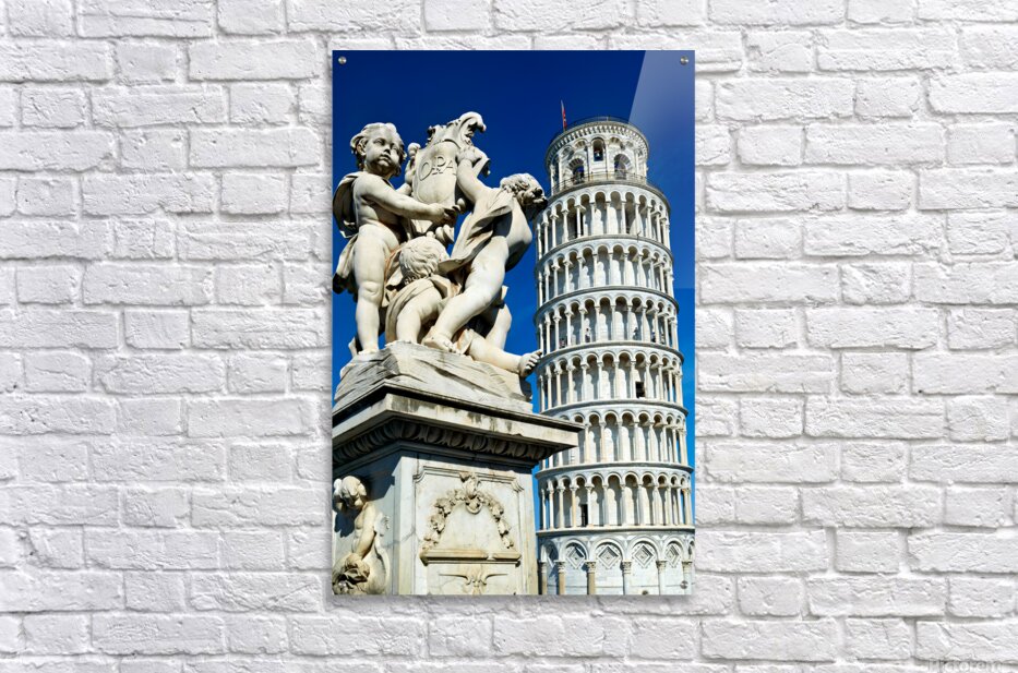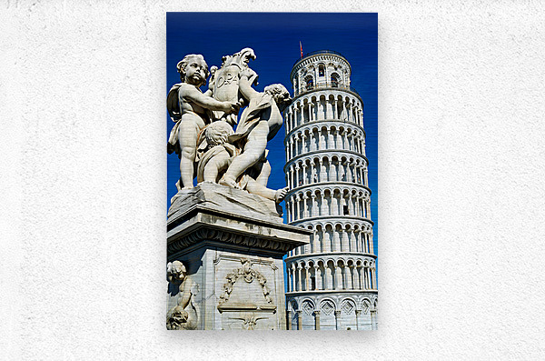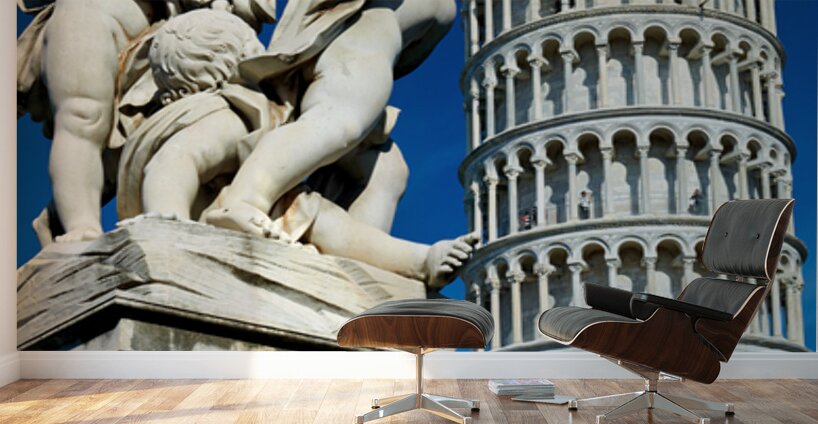 People admire the Leaning Tower of Pisa and the fountain with angels in Piazza dei Miracoli on a bright sunny day.