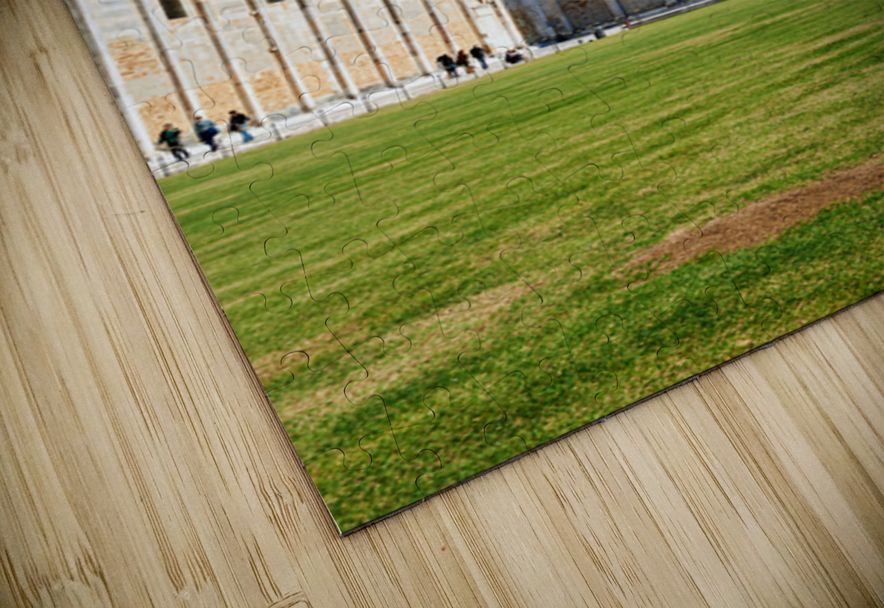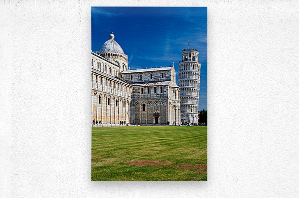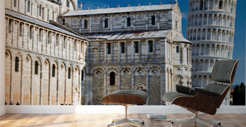 Visitors gather in Piazza dei Miracoli to see the Leaning Tower and Cathedral in Pisa Tuscany under a clear blue sky.