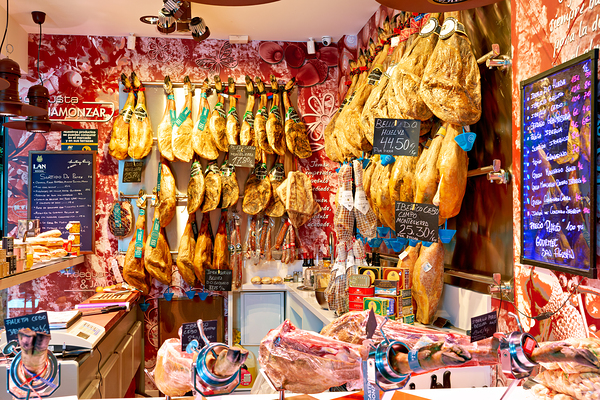 Visitors explore a shop in Granada Spain featuring Jamon Iberico bellota pata negra hanging on display.