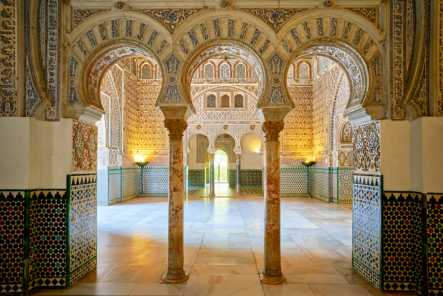 Visitors enter the Alcazar in Seville exploring the unique architecture and patterns inside the historic site in Andalusia.