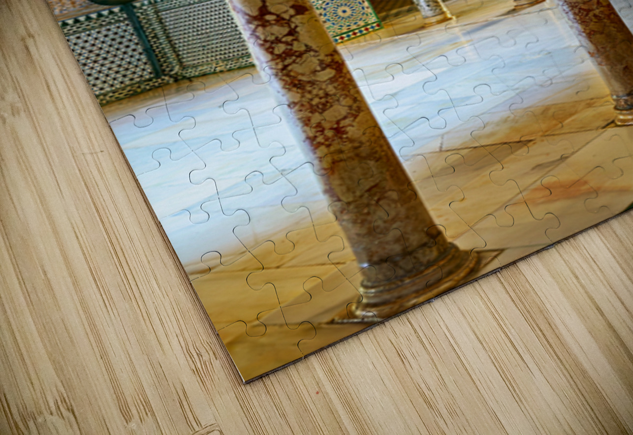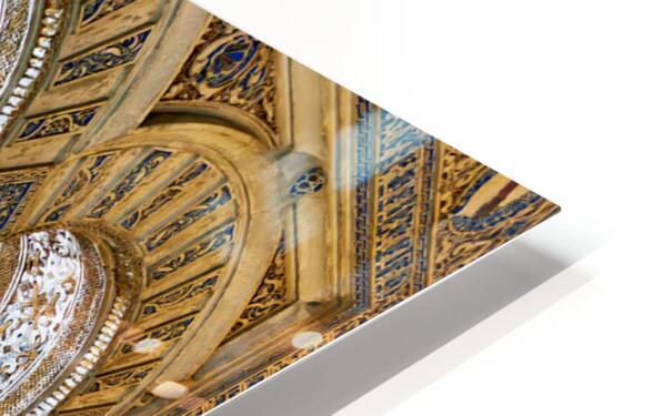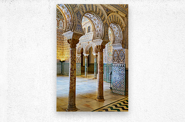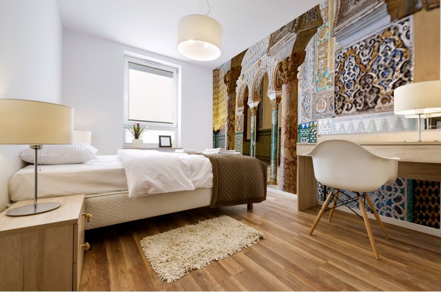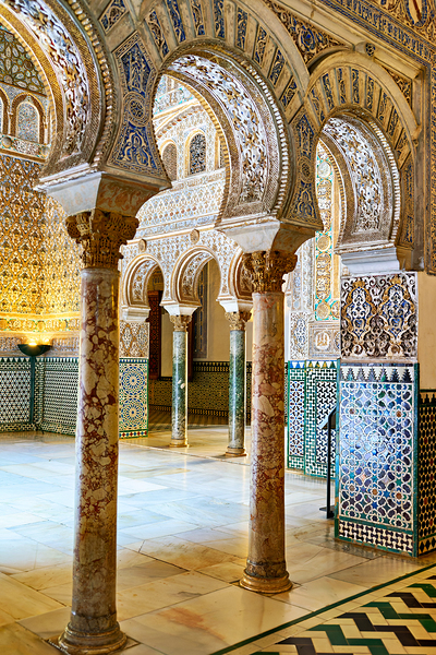 Visitors walk through the grand halls of the Alcazar admiring the intricate designs and columns of this historic site in Seville Spain.