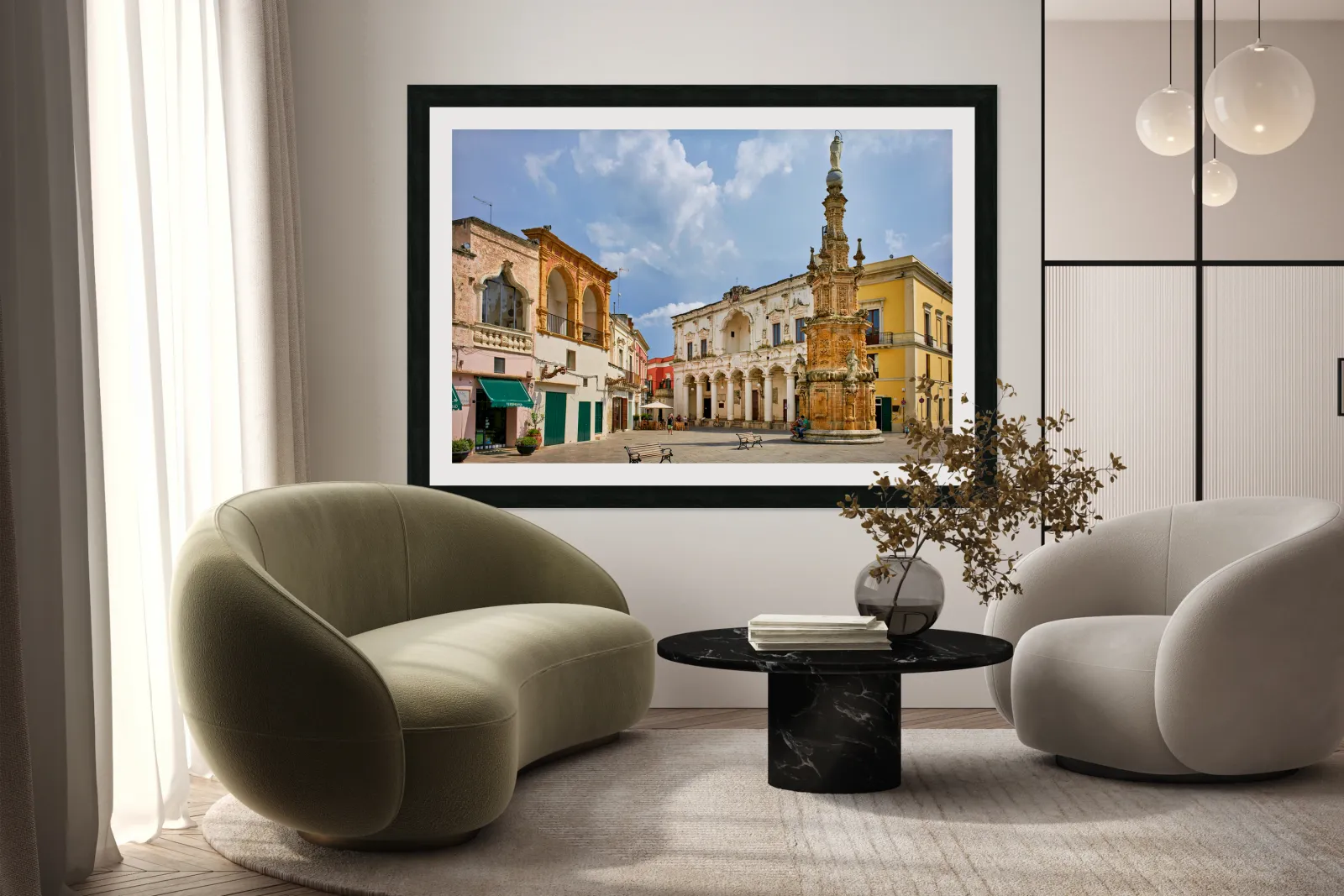 "Salento. Apulia Puglia Italy. Nardò. Salandra square. 18th century column" in a framed print.