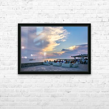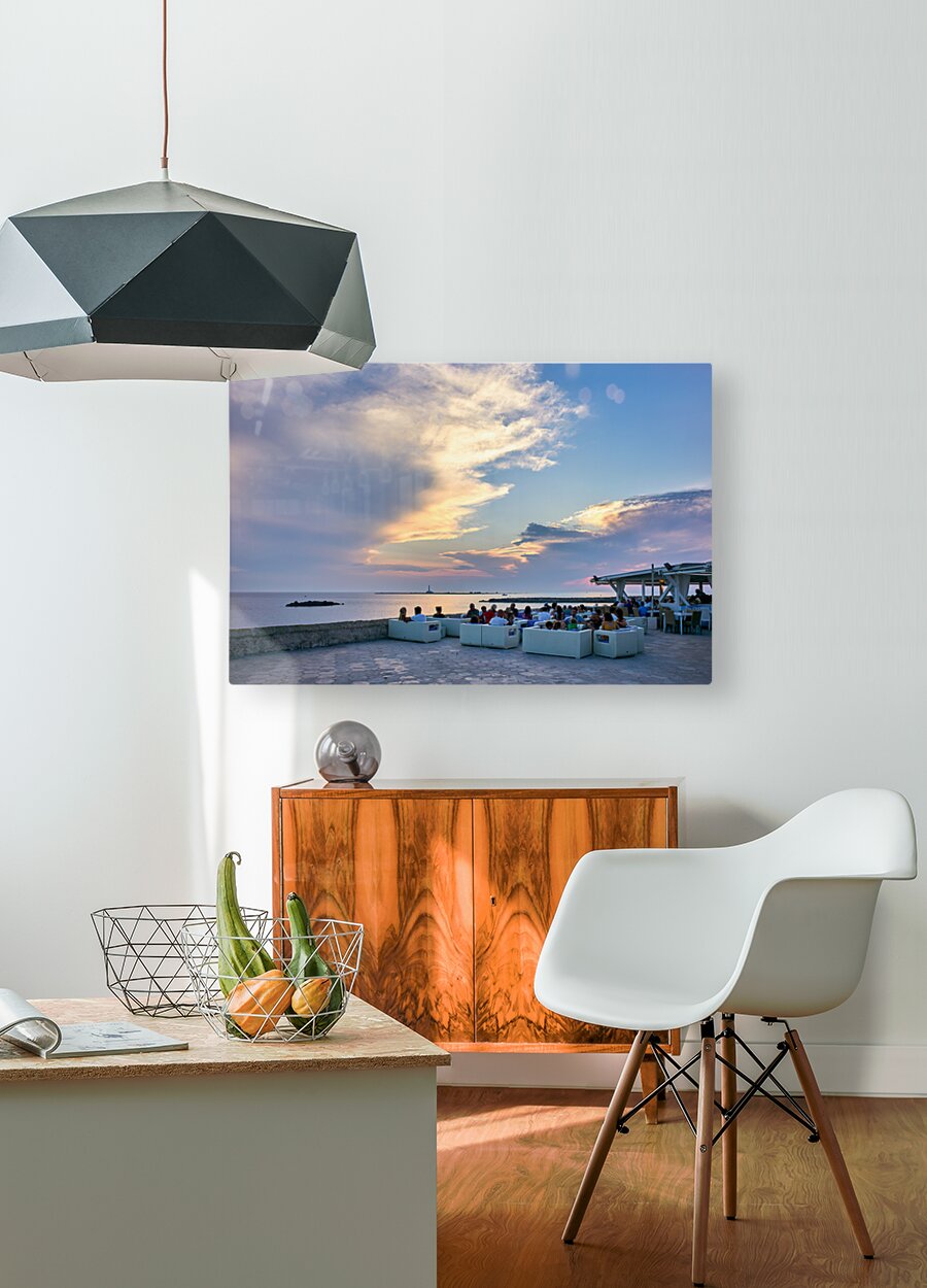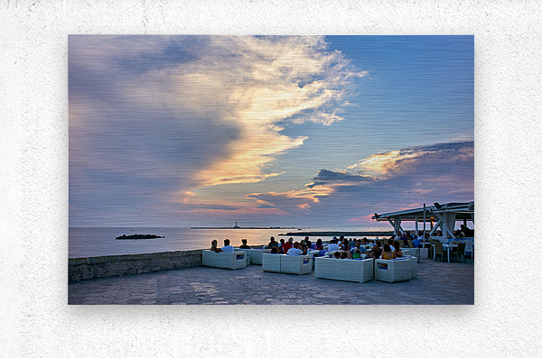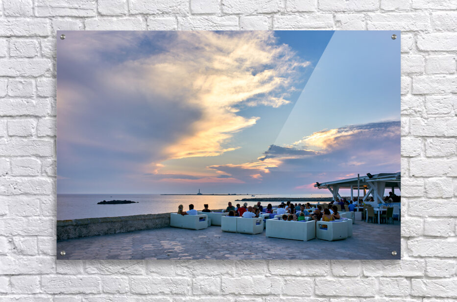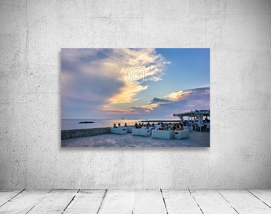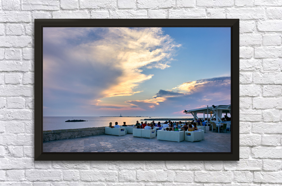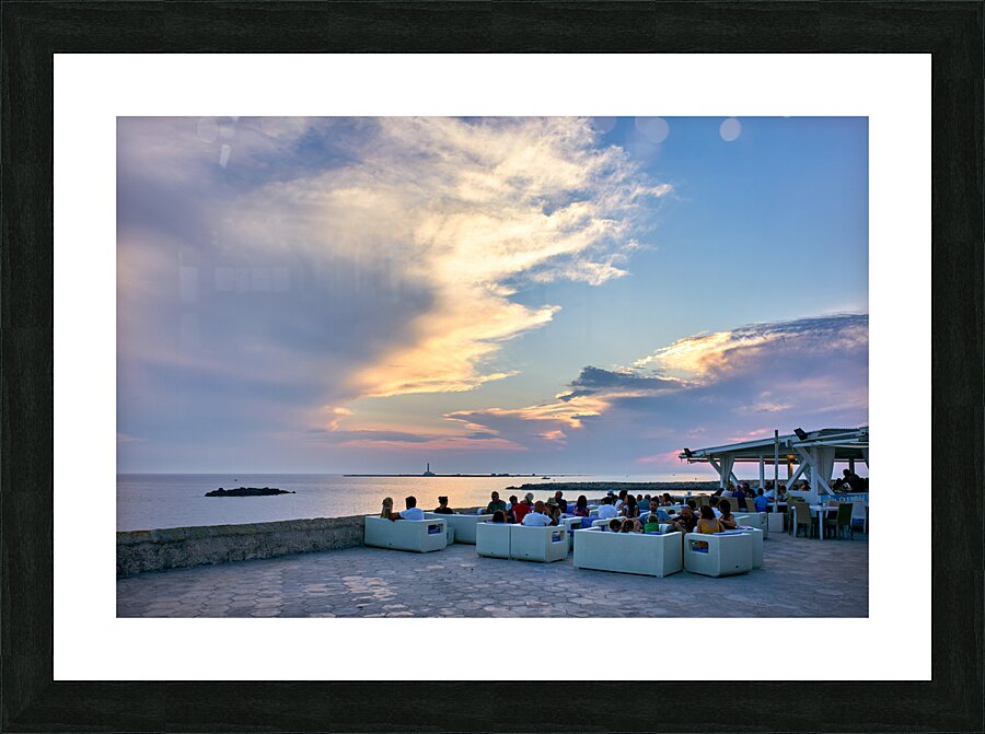 "Salento. Apulia Puglia Italy. Gallipoli. Aperitif on the seafront at sunset" in a framed print.