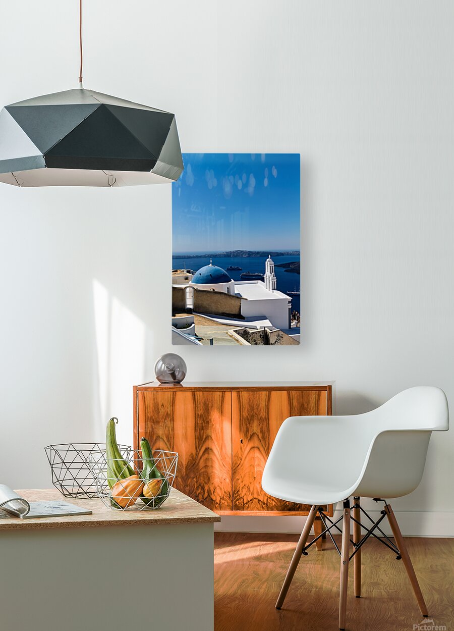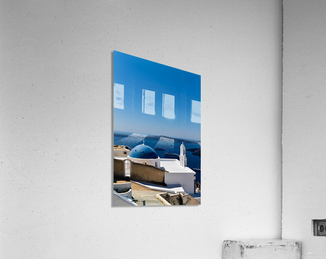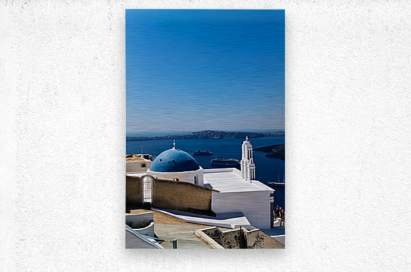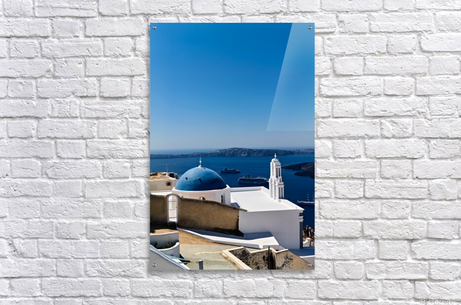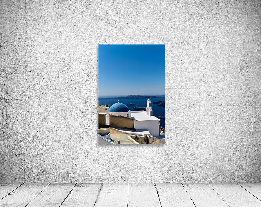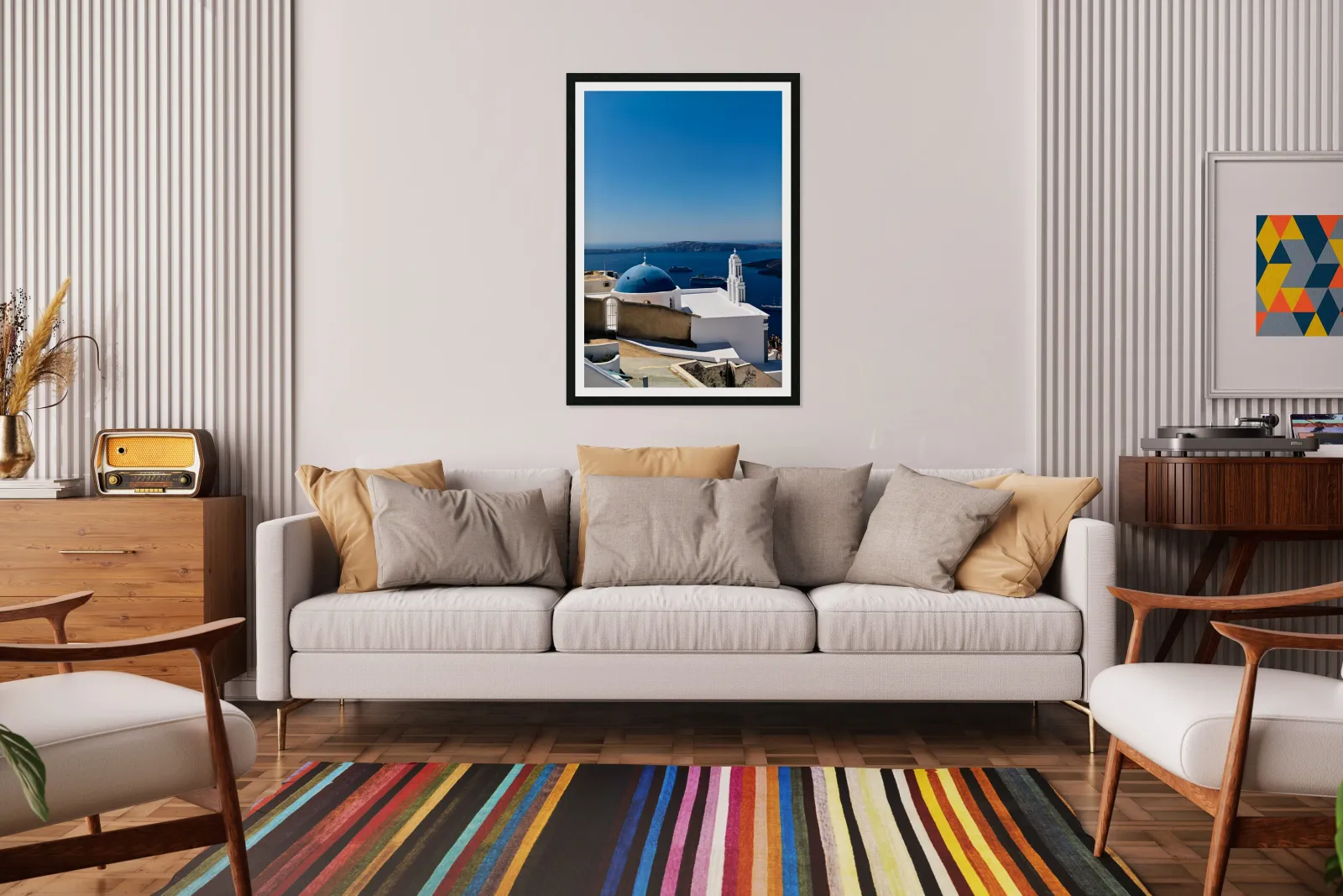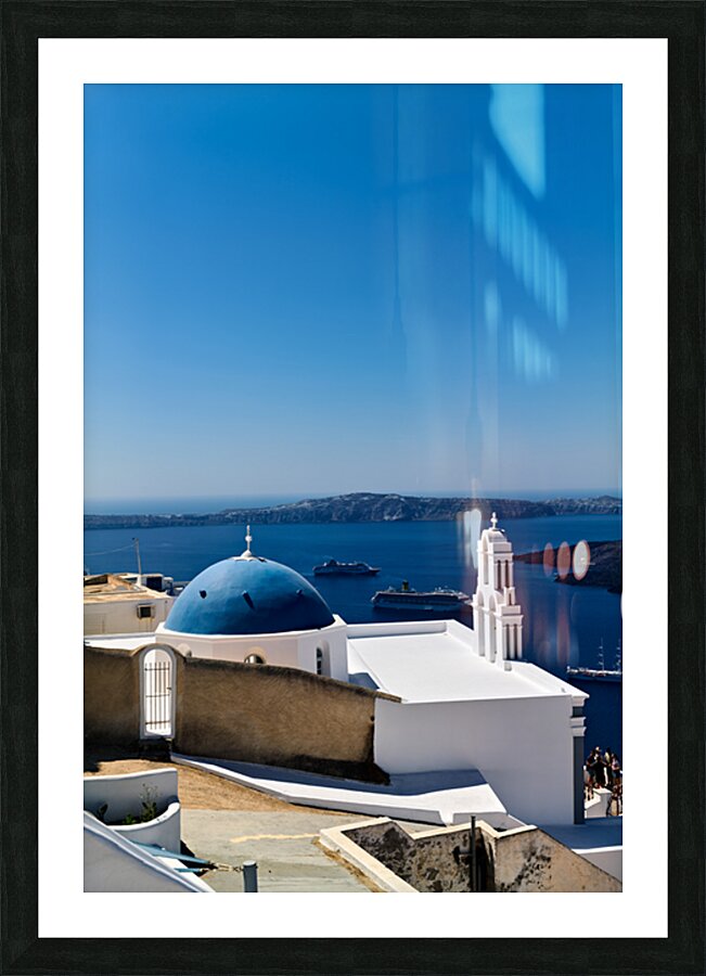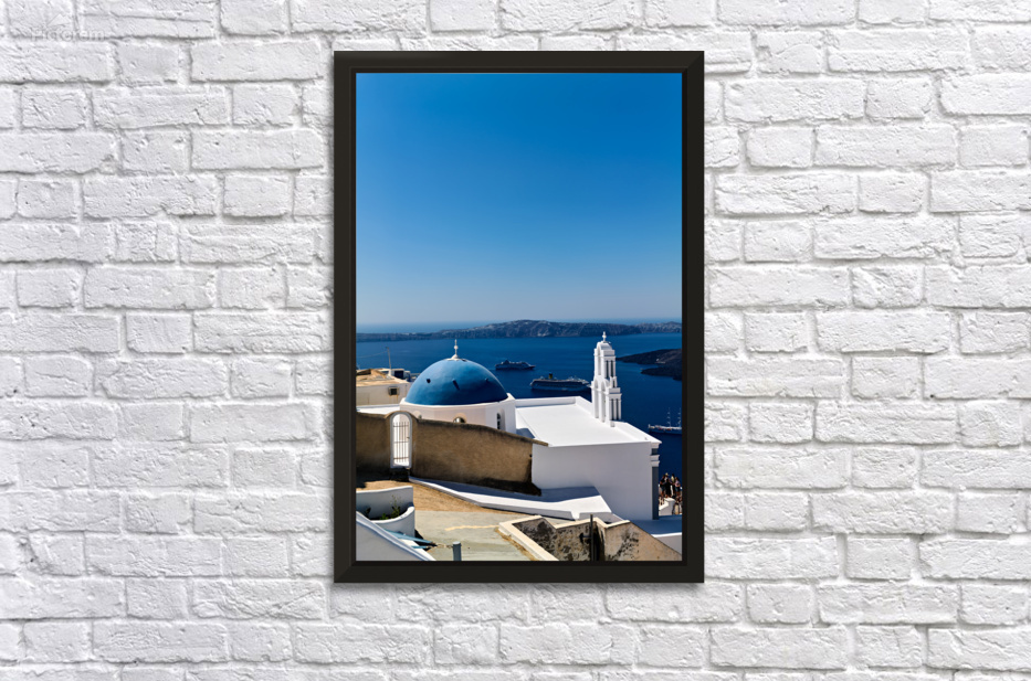 "Santorinis blue domed church and bell tower overlooking the Aeg" in a framed print.