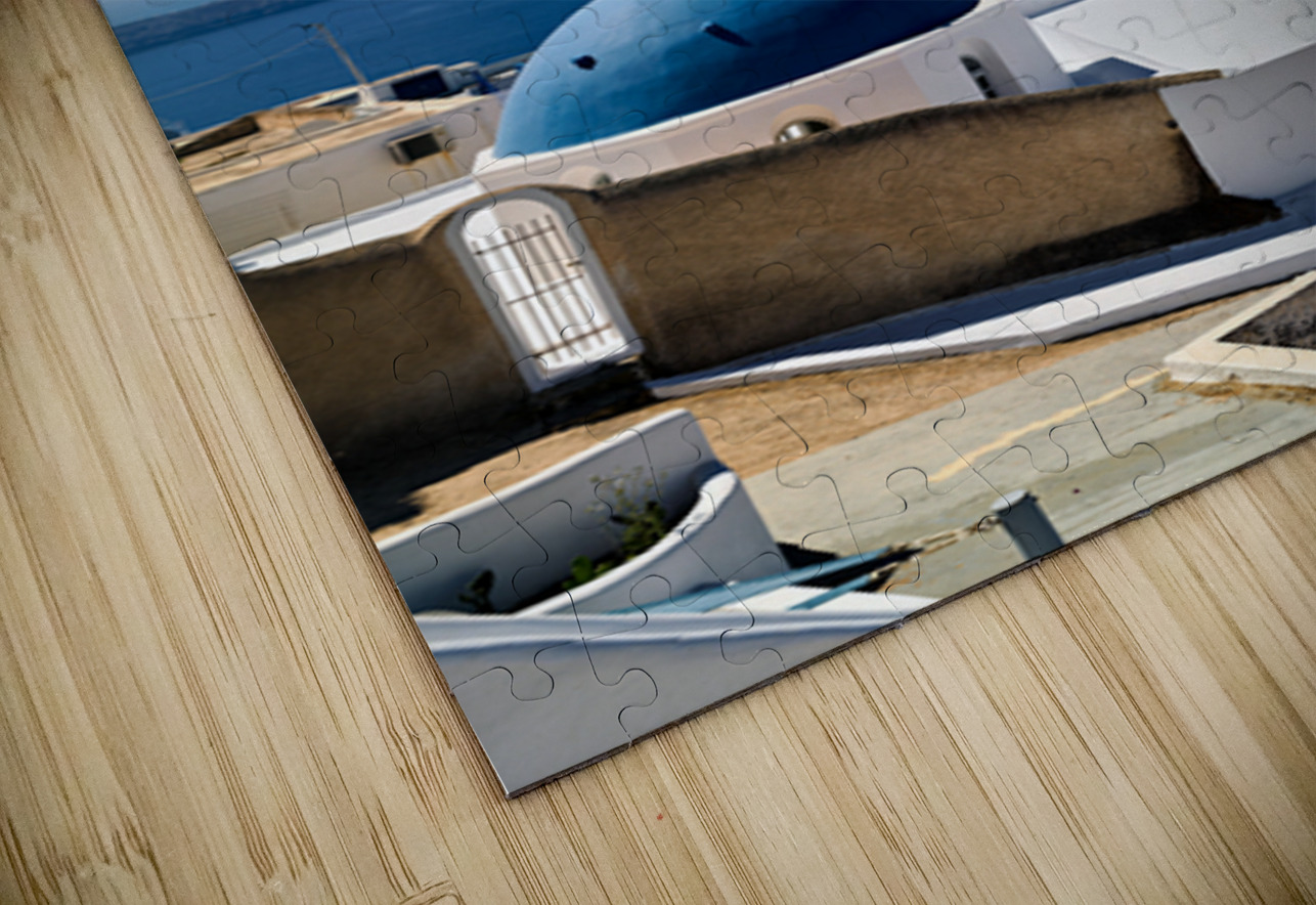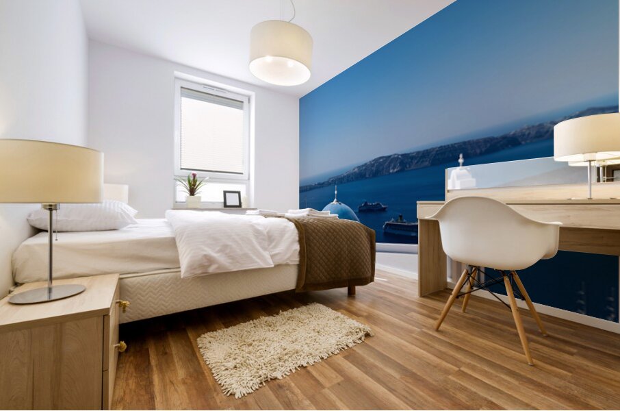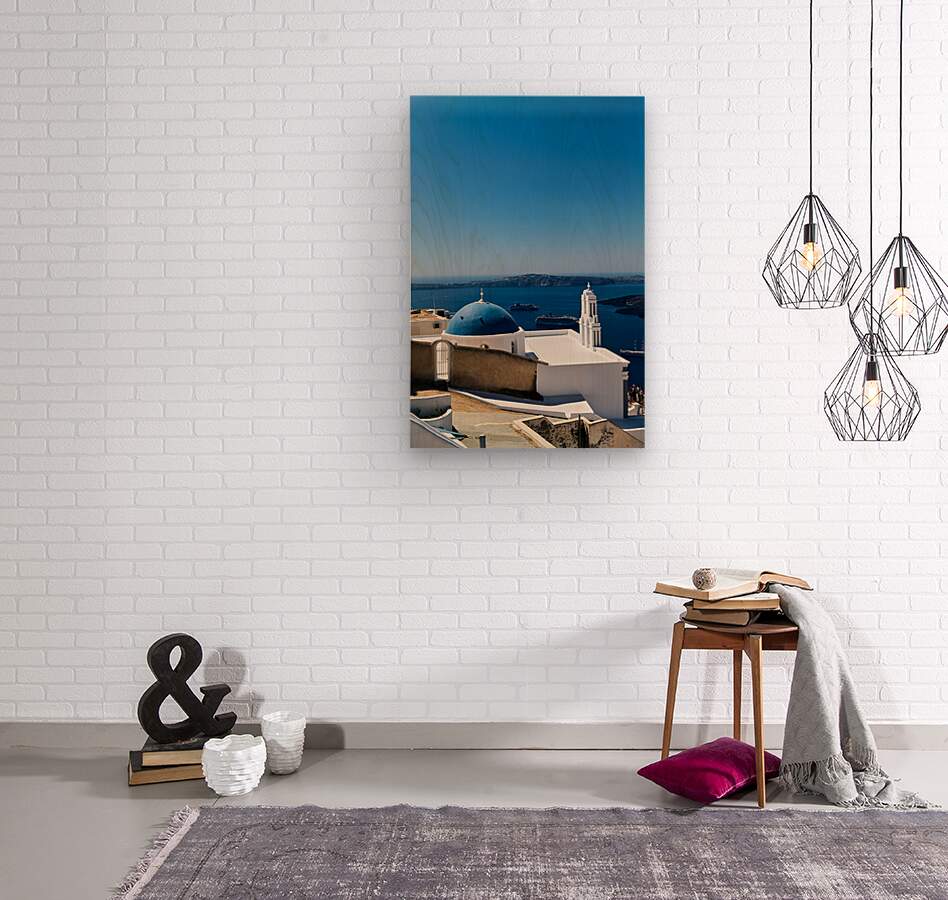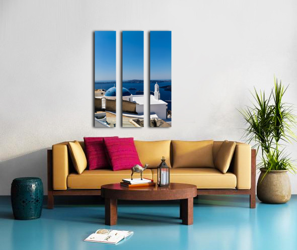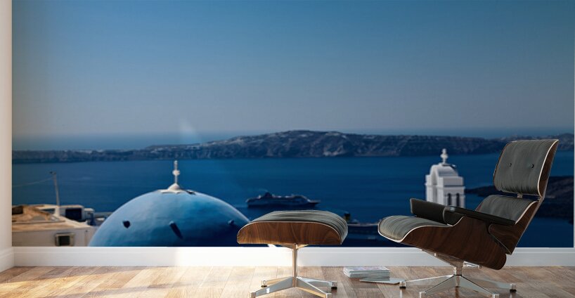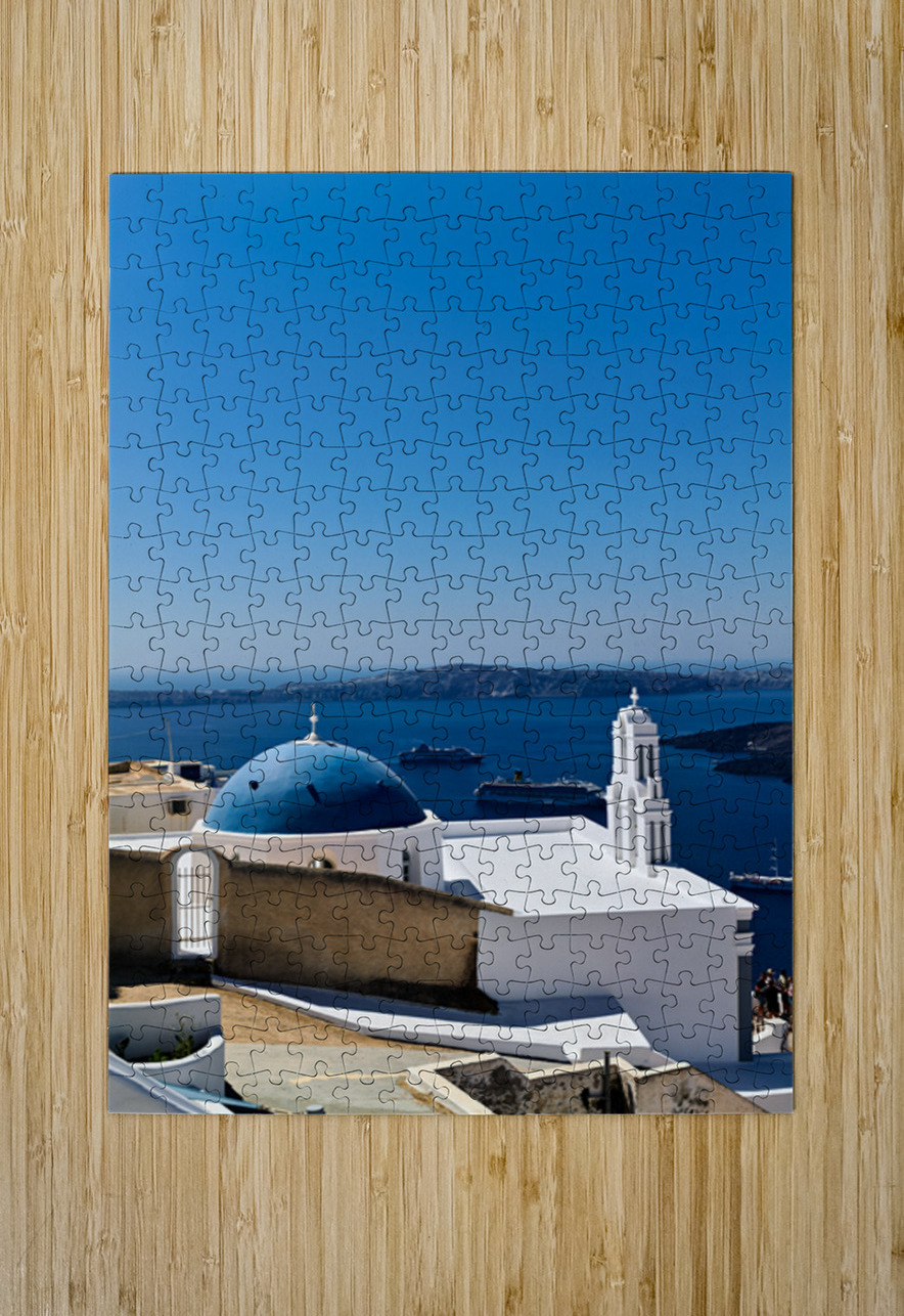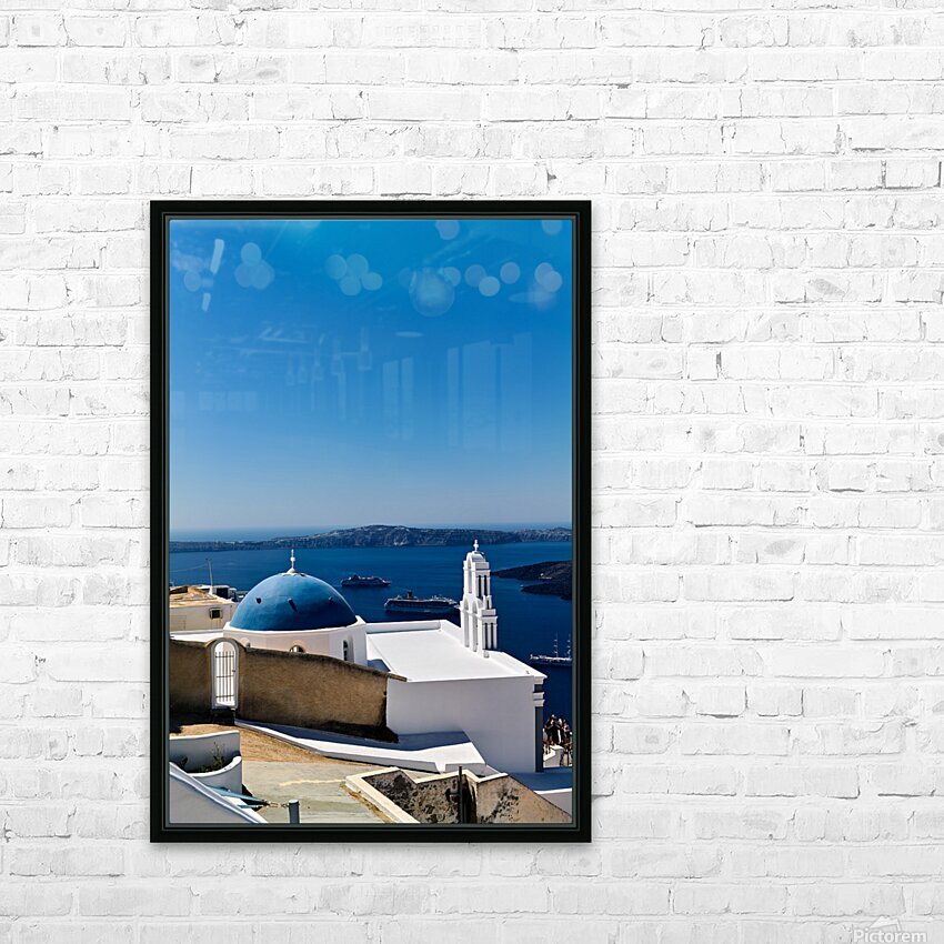 "Santorinis blue domed church and bell tower overlooking the Aeg" in a framed print.