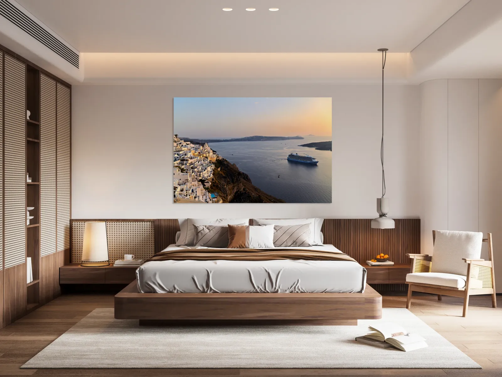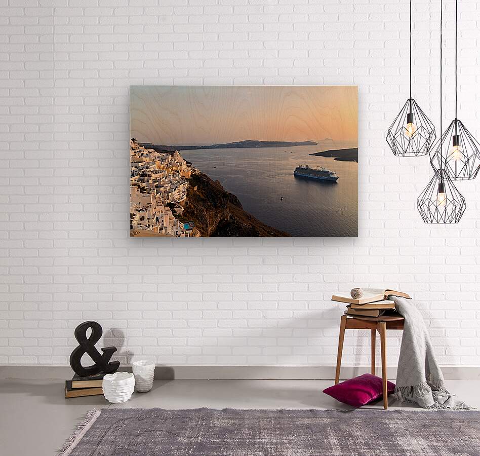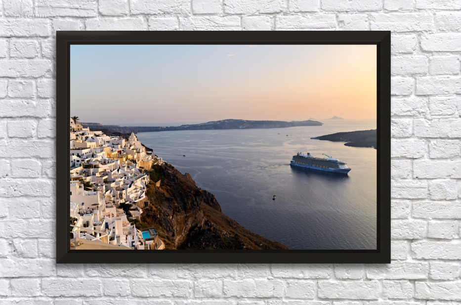 "Santorini village and cruise ship at sunset." in a framed print.