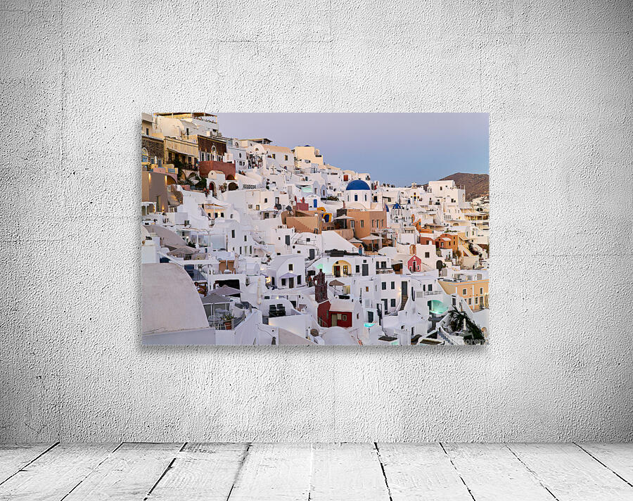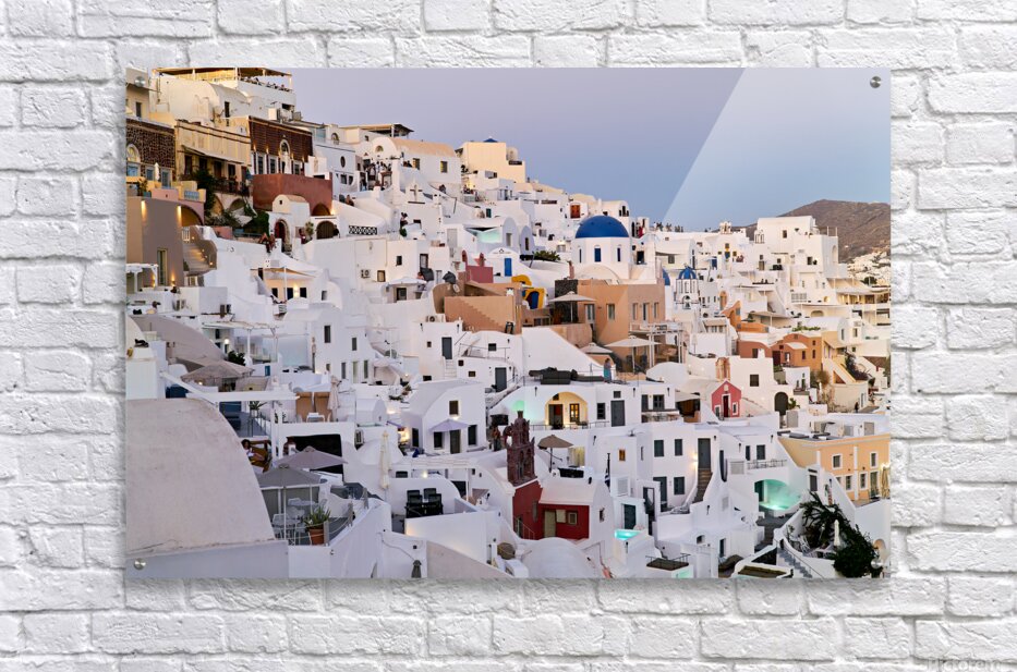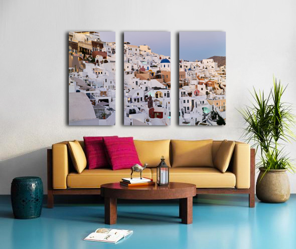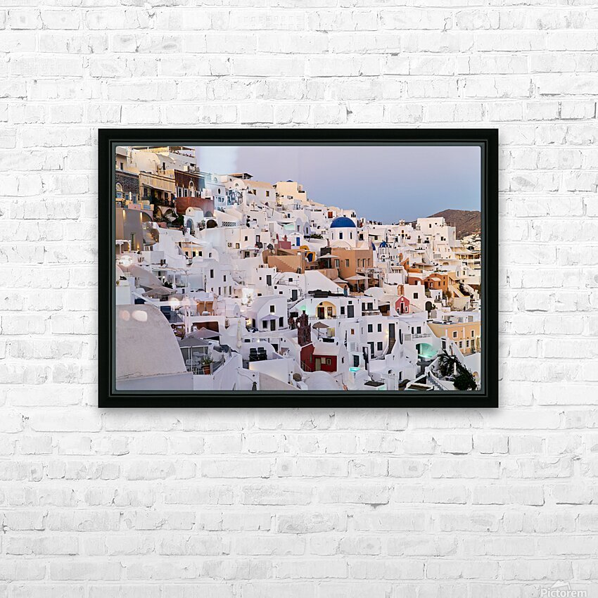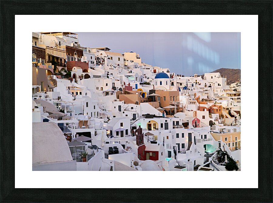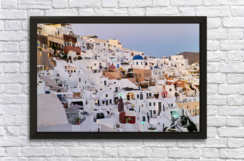 "Santorinis iconic white buildings and blue domes on a hillside." in a framed print.