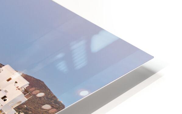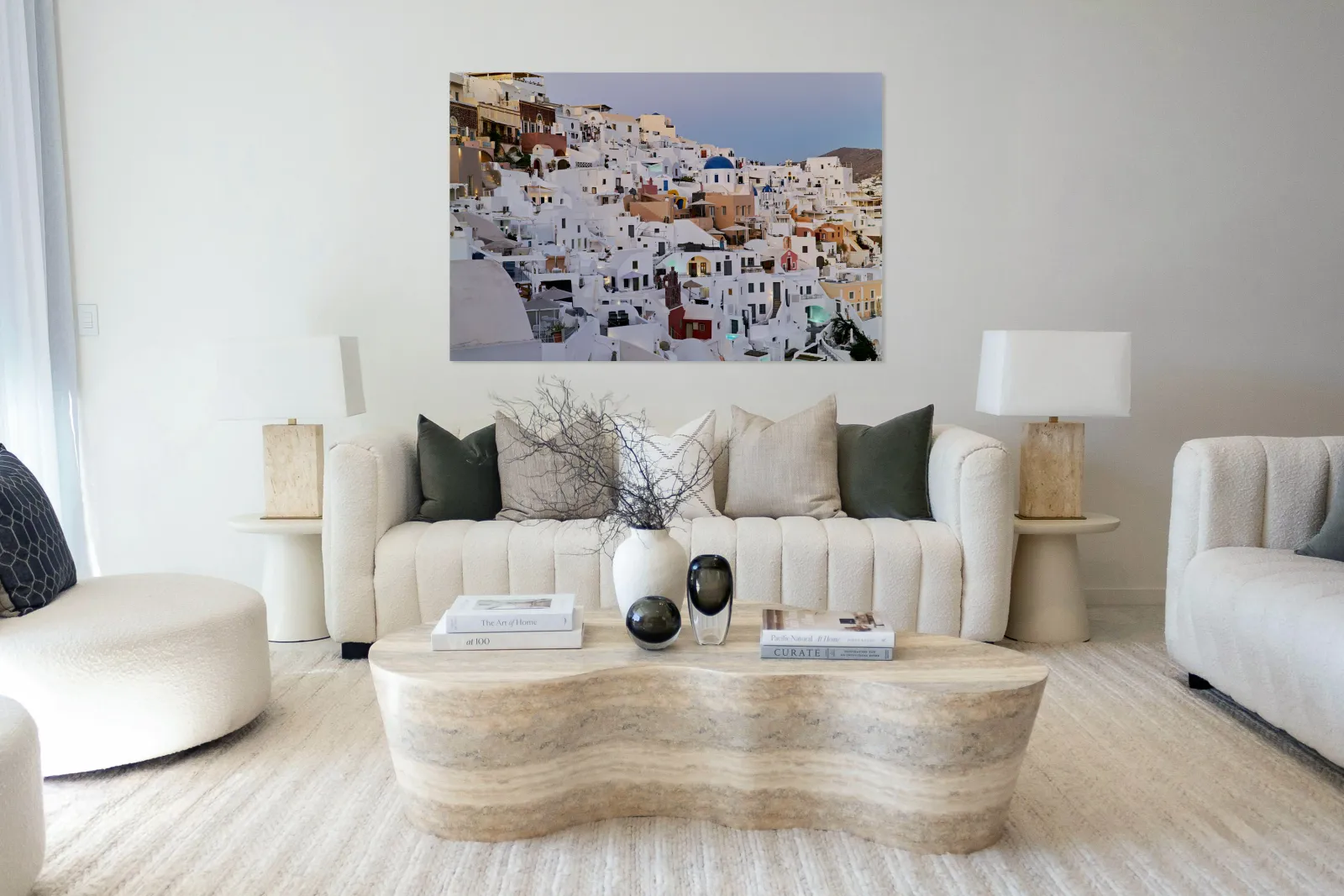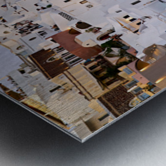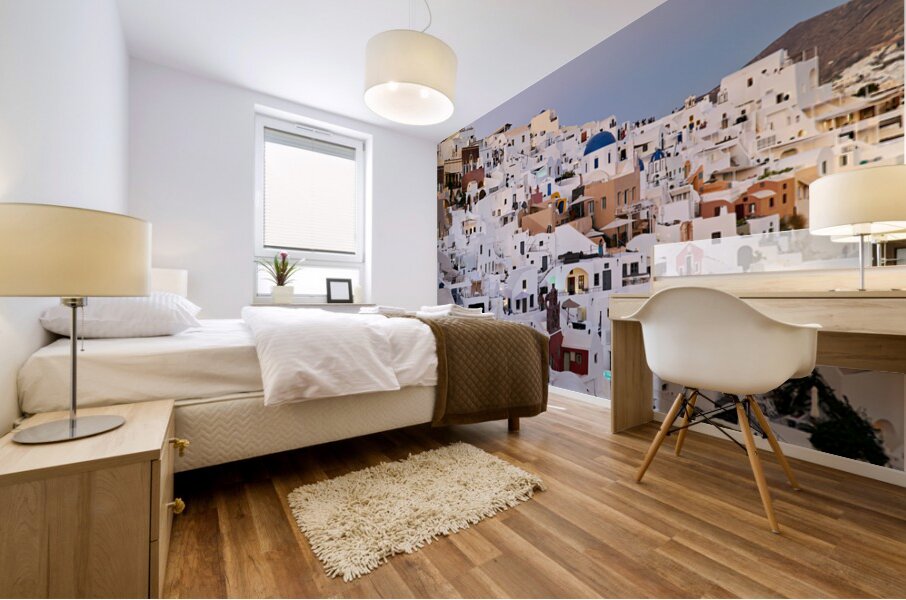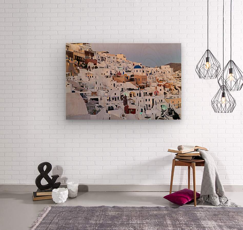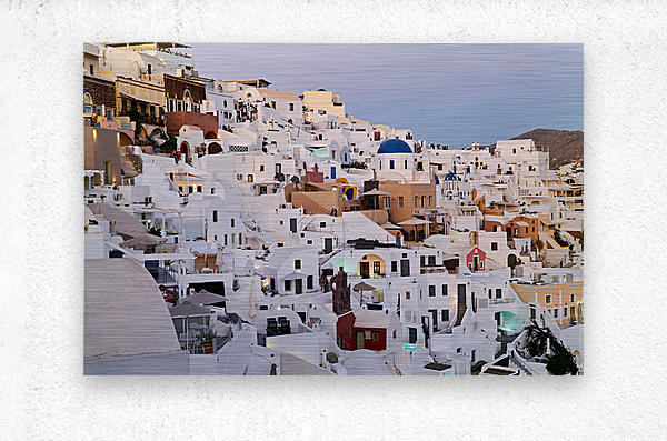 "Santorinis iconic white buildings and blue domes on a hillside." in a framed print.