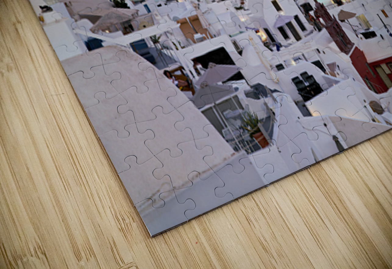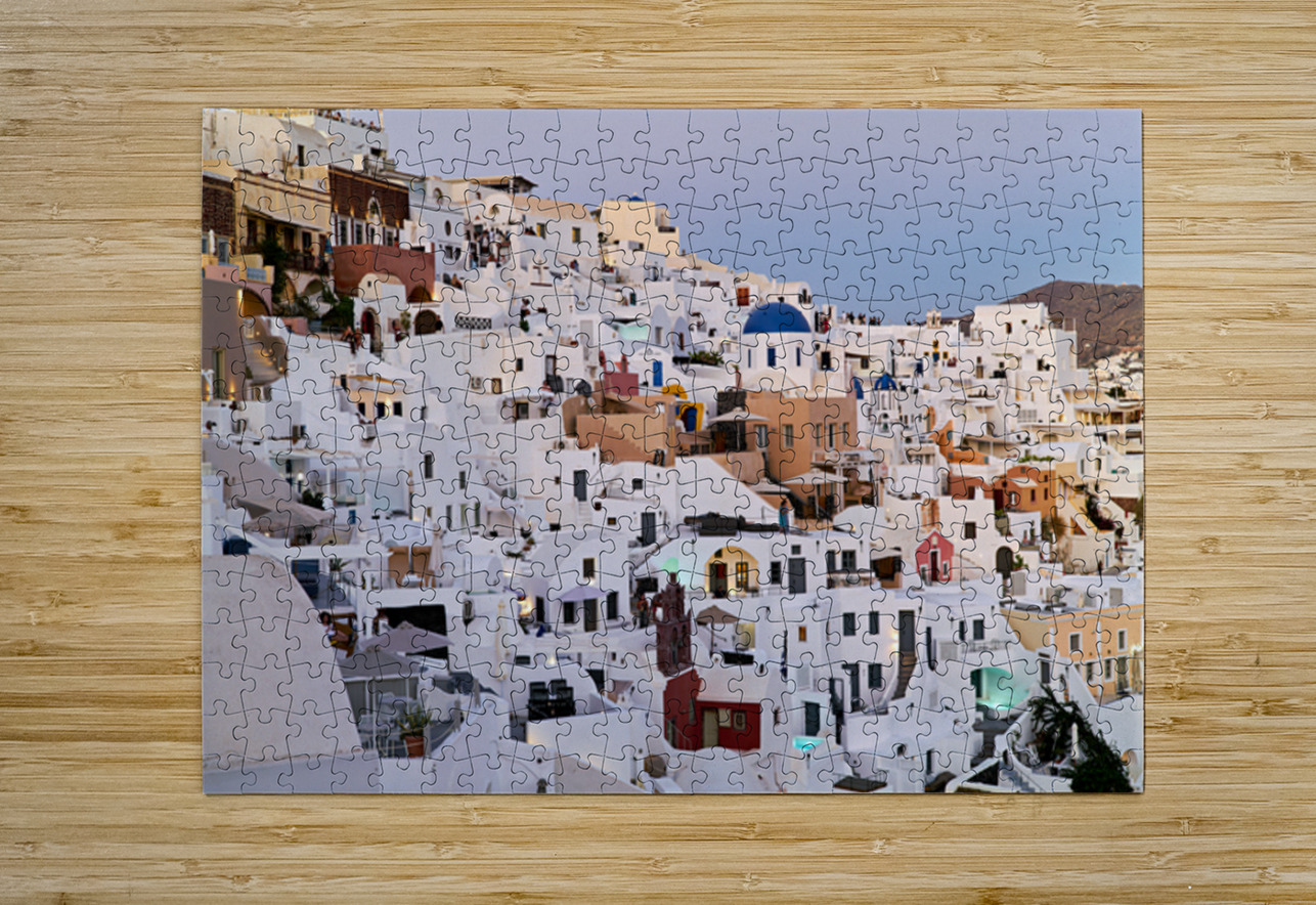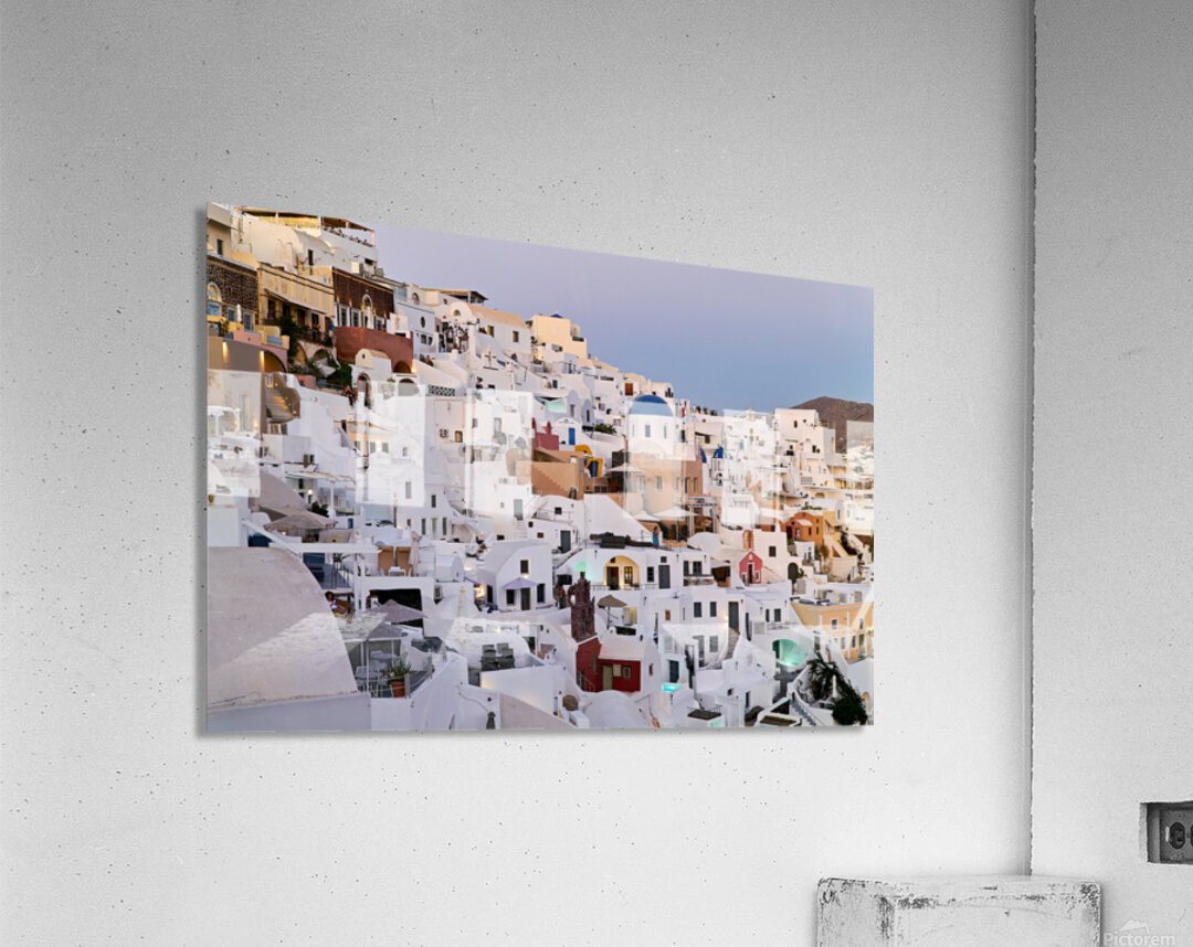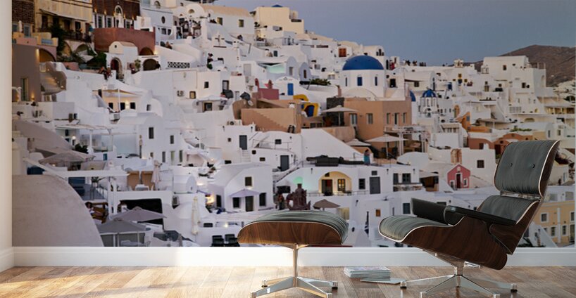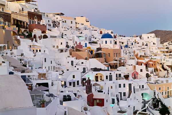Tourists and residents enjoy the iconic whitewashed buildings and blue domes of Oia Santorini Greece at dusk showcasing its unique architecture.