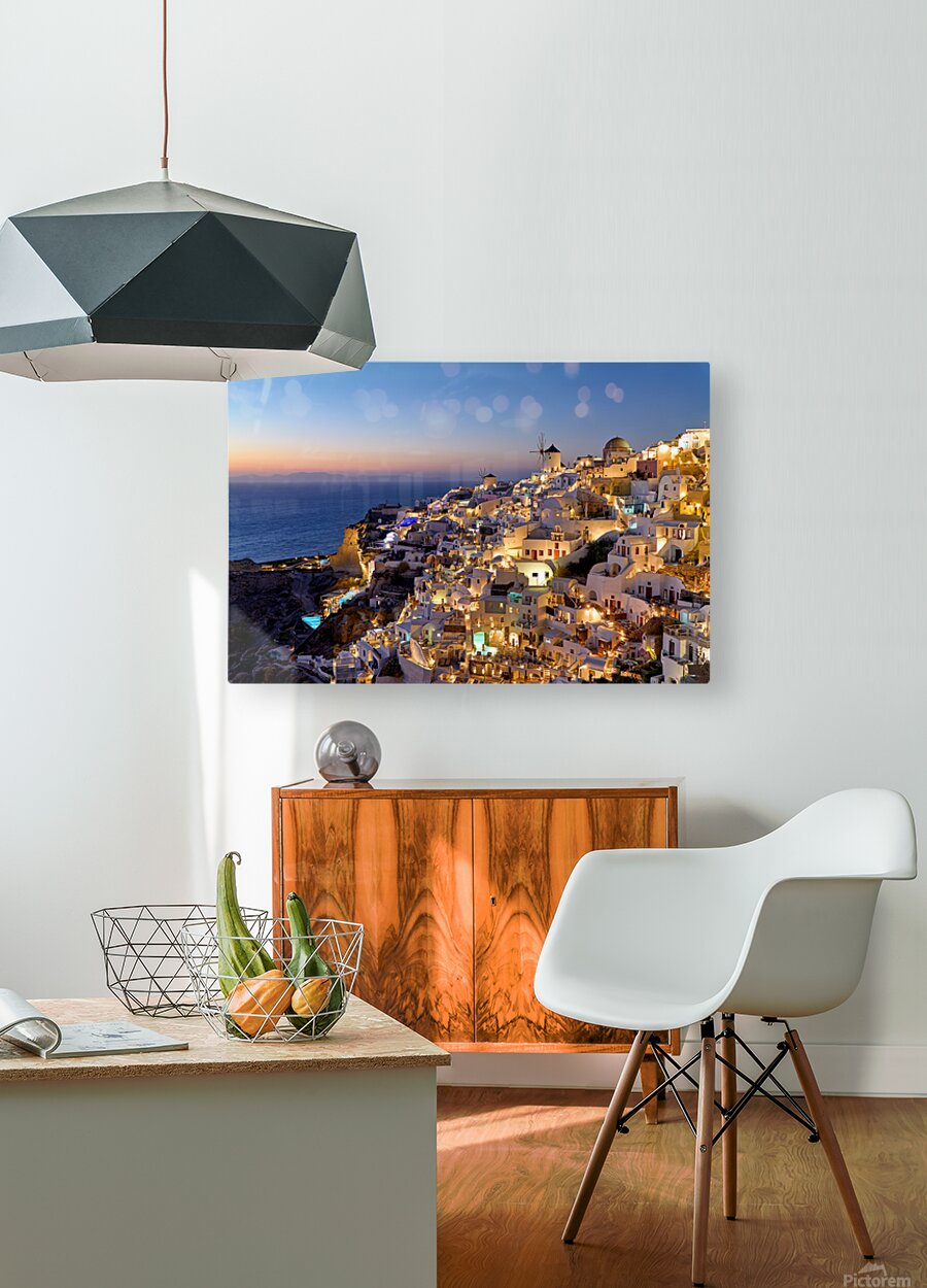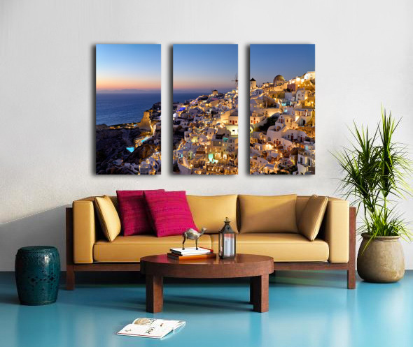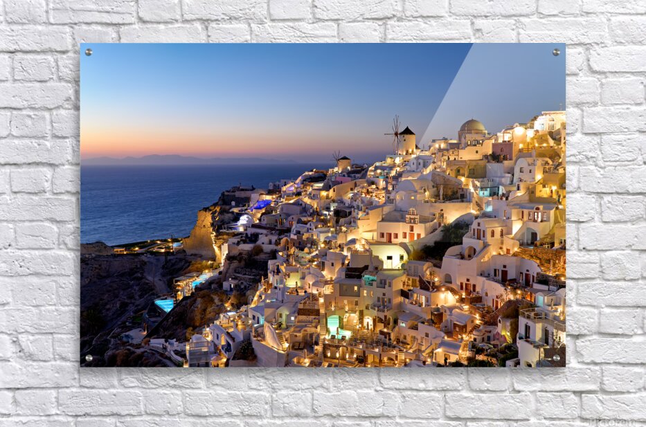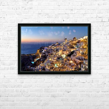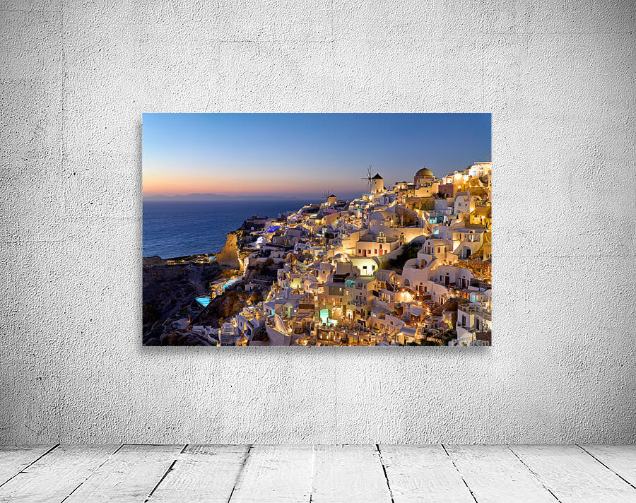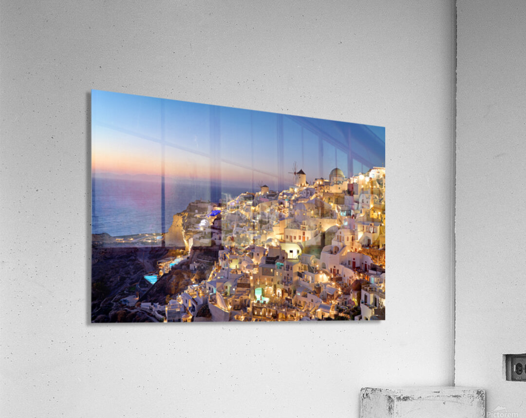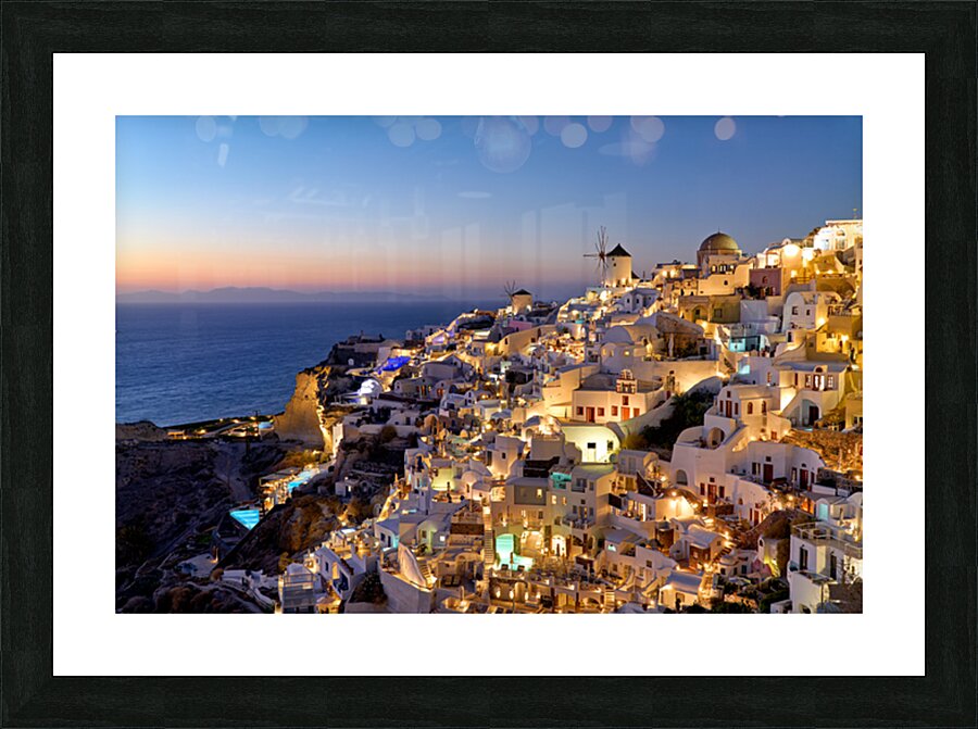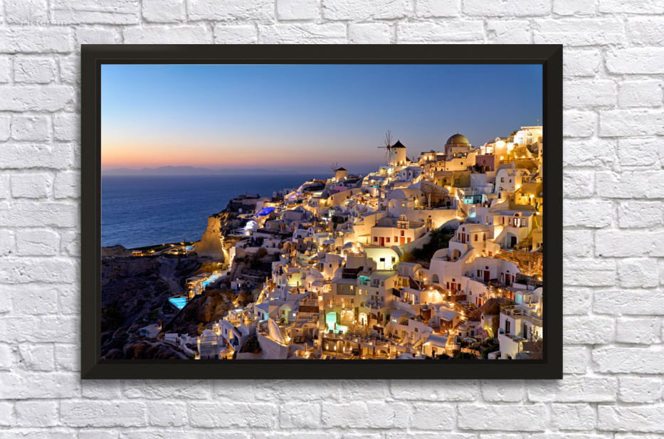 "Santorinis Oia village illuminated at dusk overlooking the se" in a framed print.