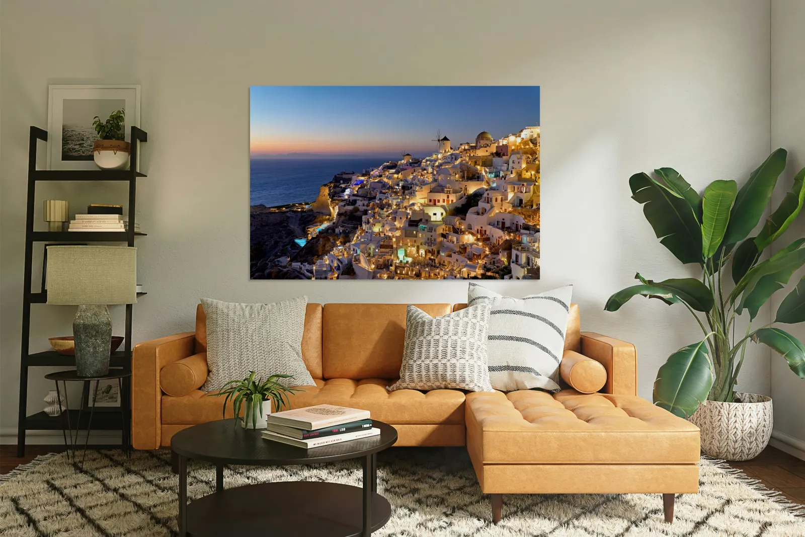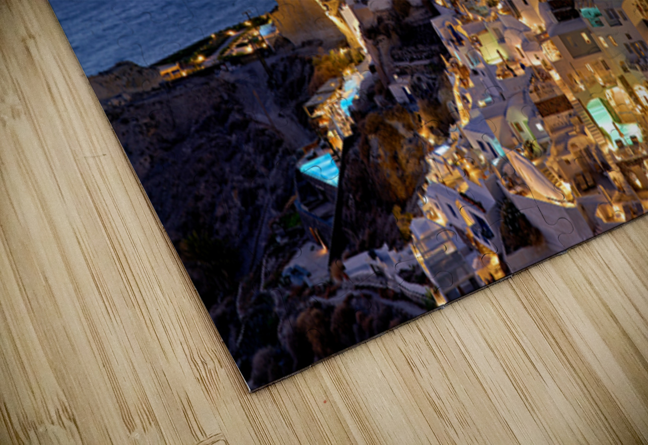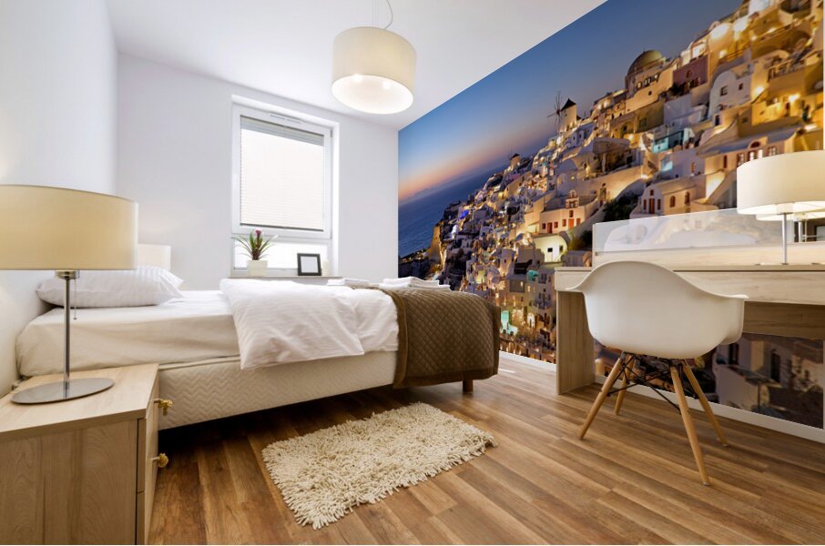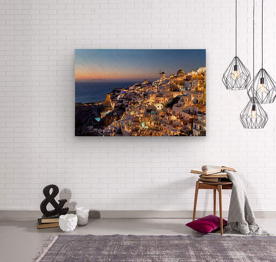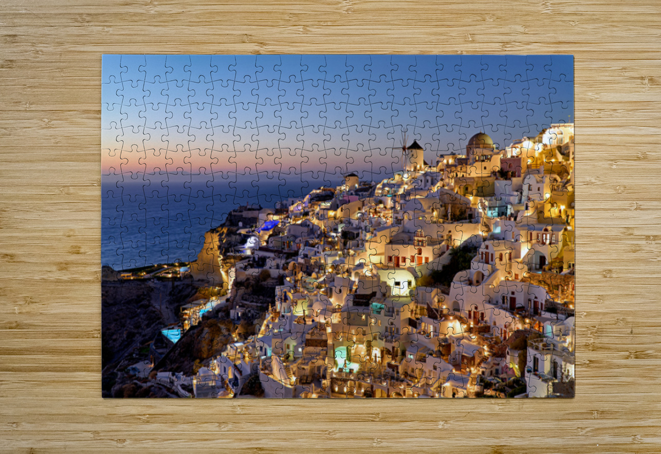 "Santorinis Oia village illuminated at dusk overlooking the se" in a framed print.