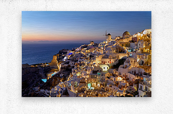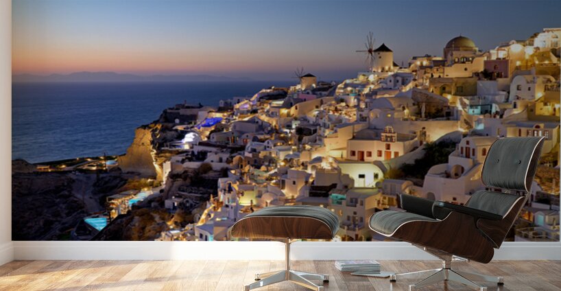 Oia village in Santorini Greece glows with lights at dusk showcasing its iconic white buildings and windmills overlooking the Aegean Sea.