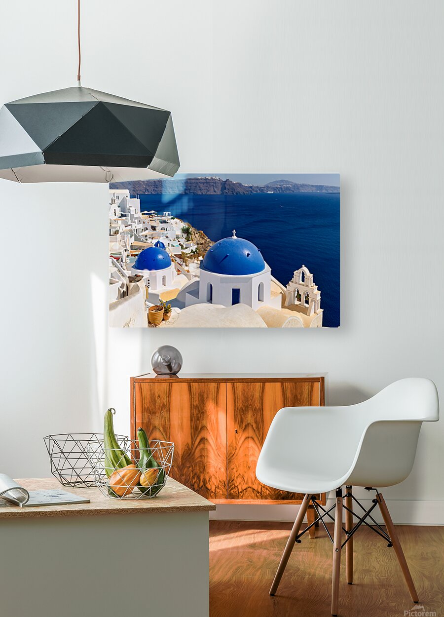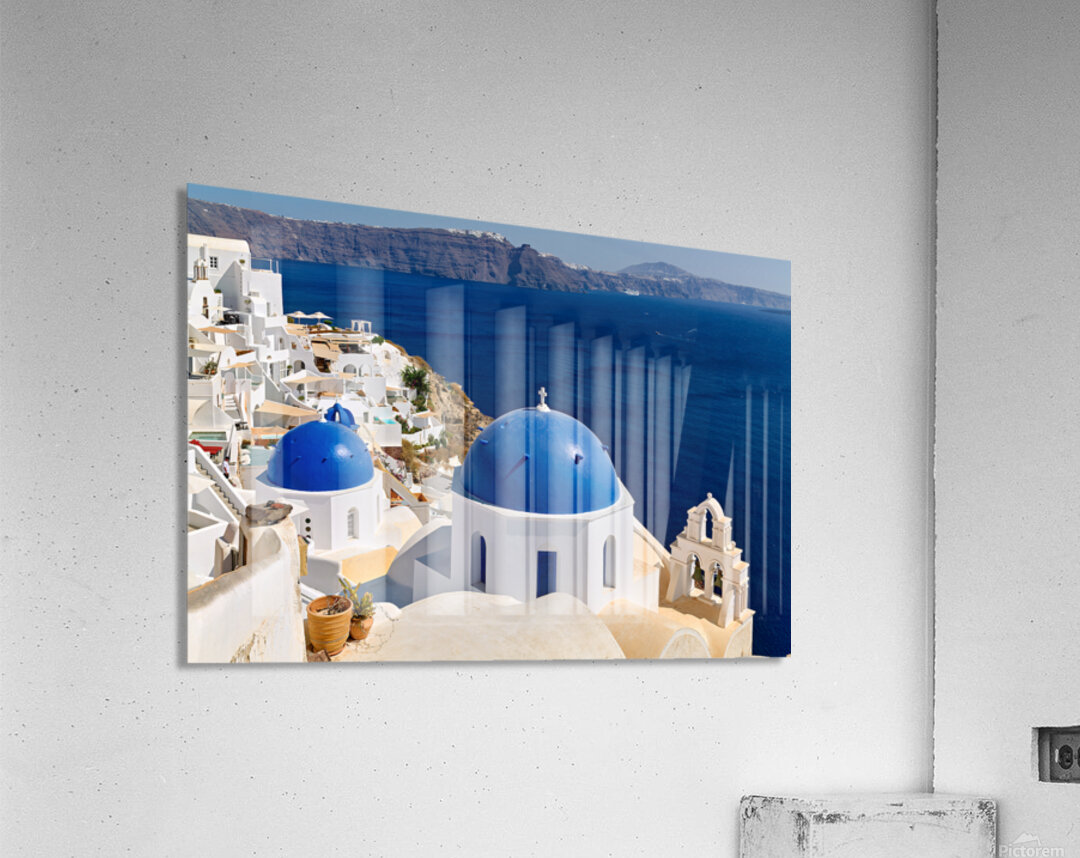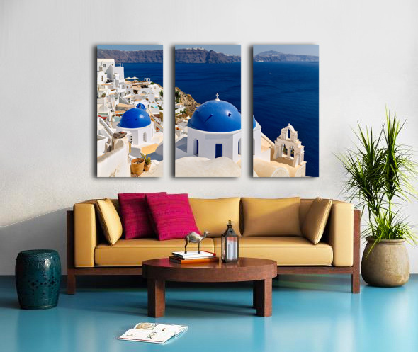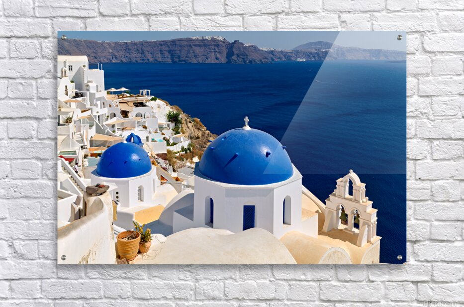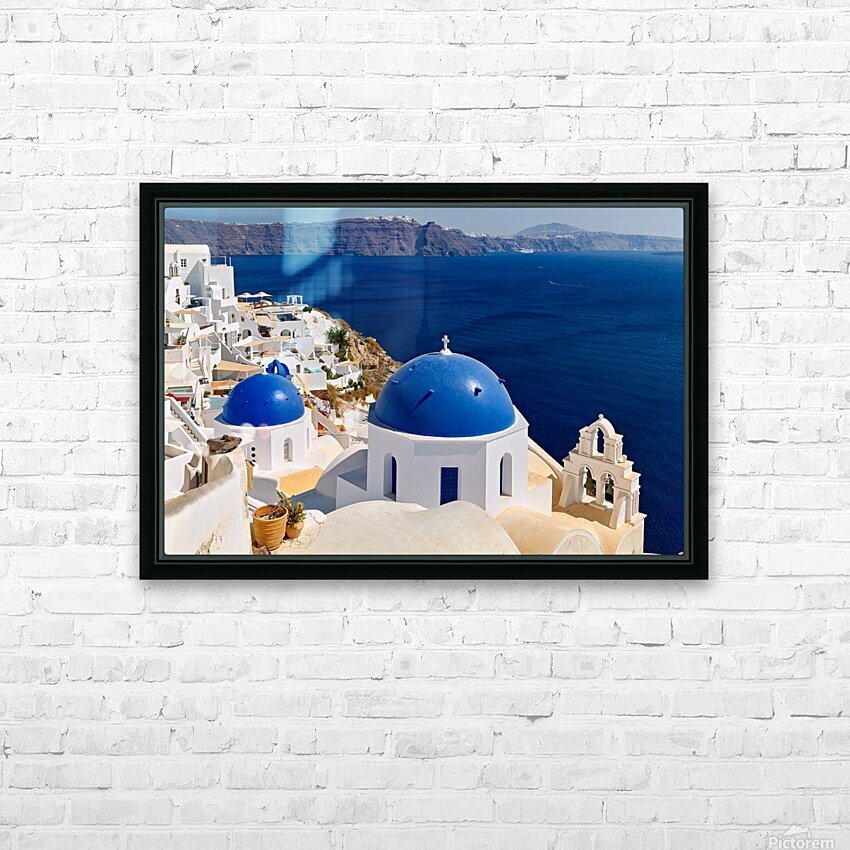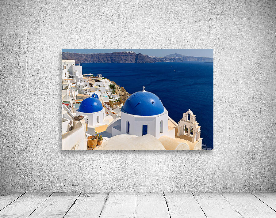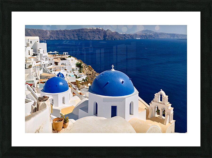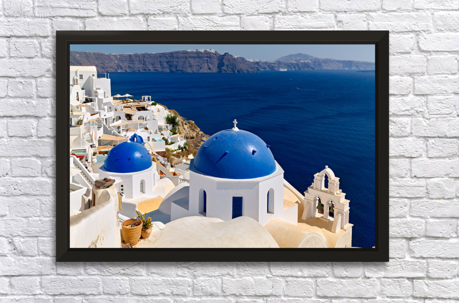 "Beautiful Santorini: White buildings blue domes and deep blue " in a framed print.