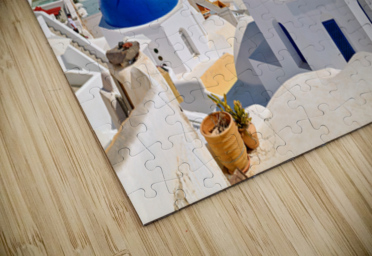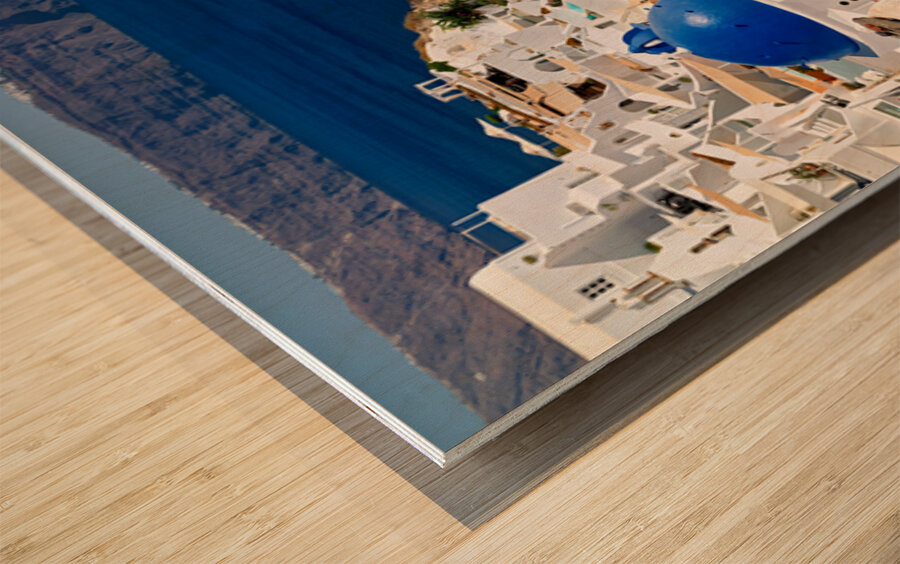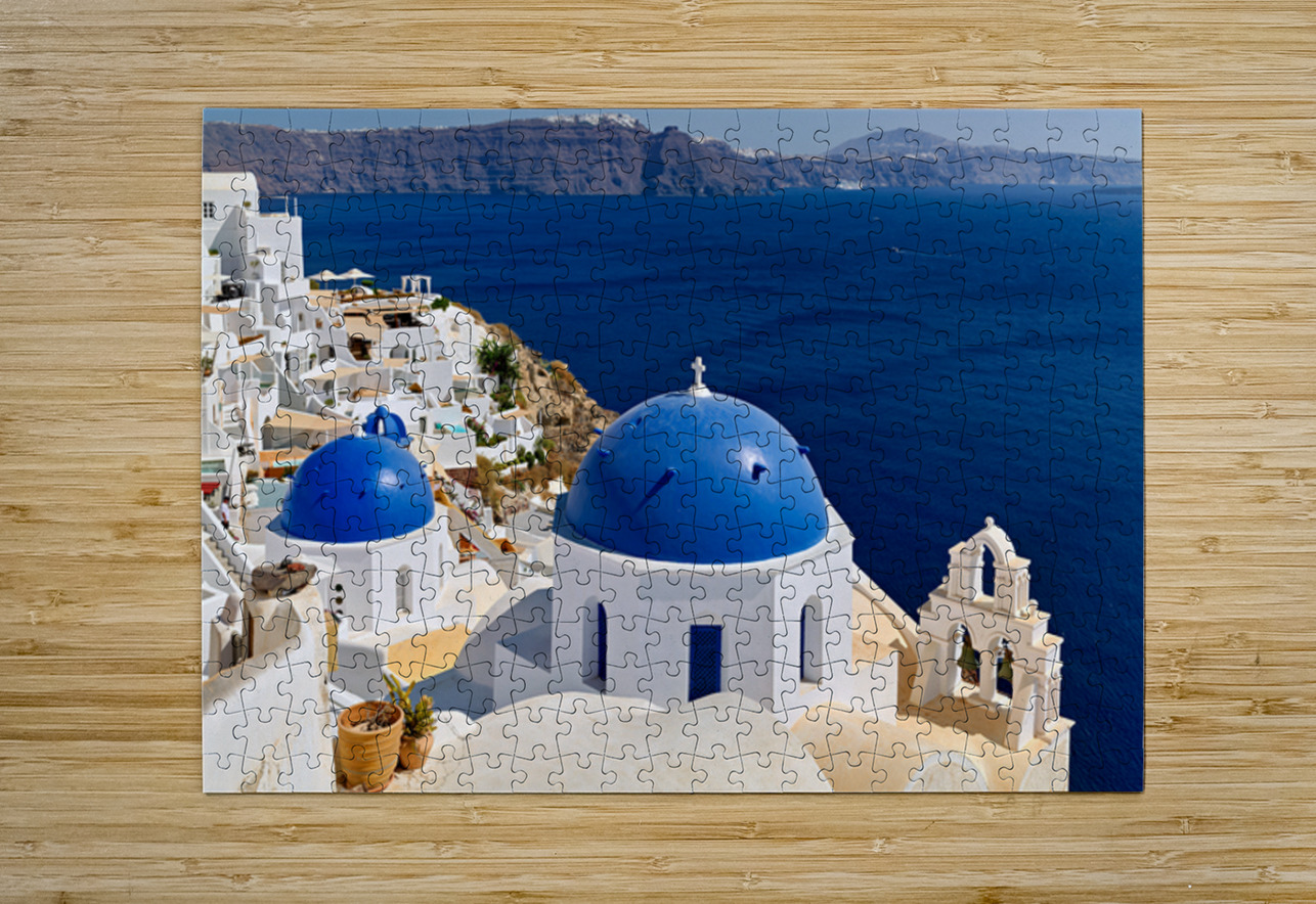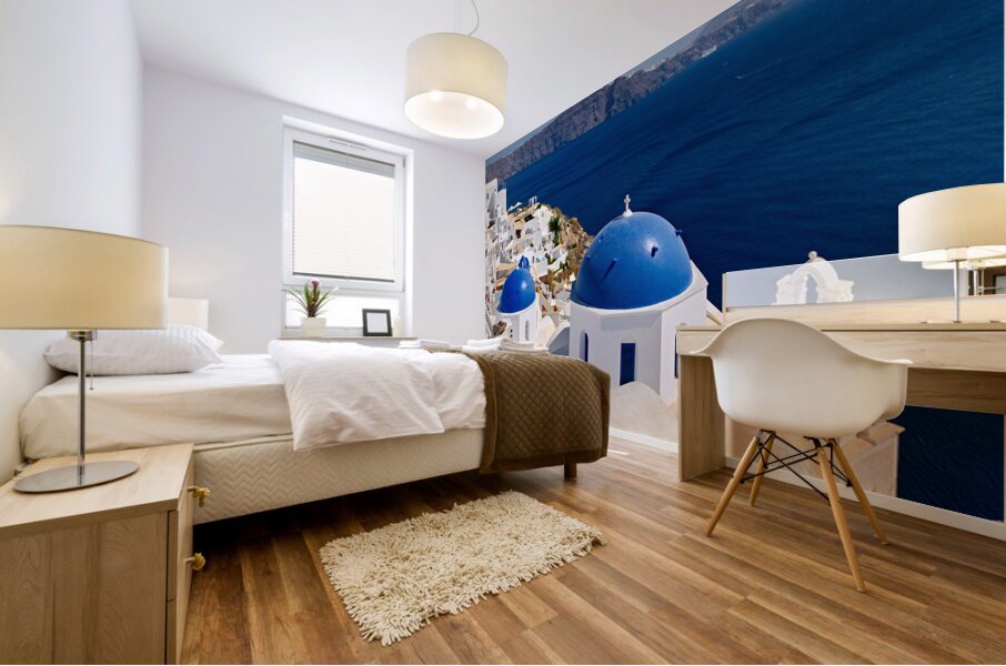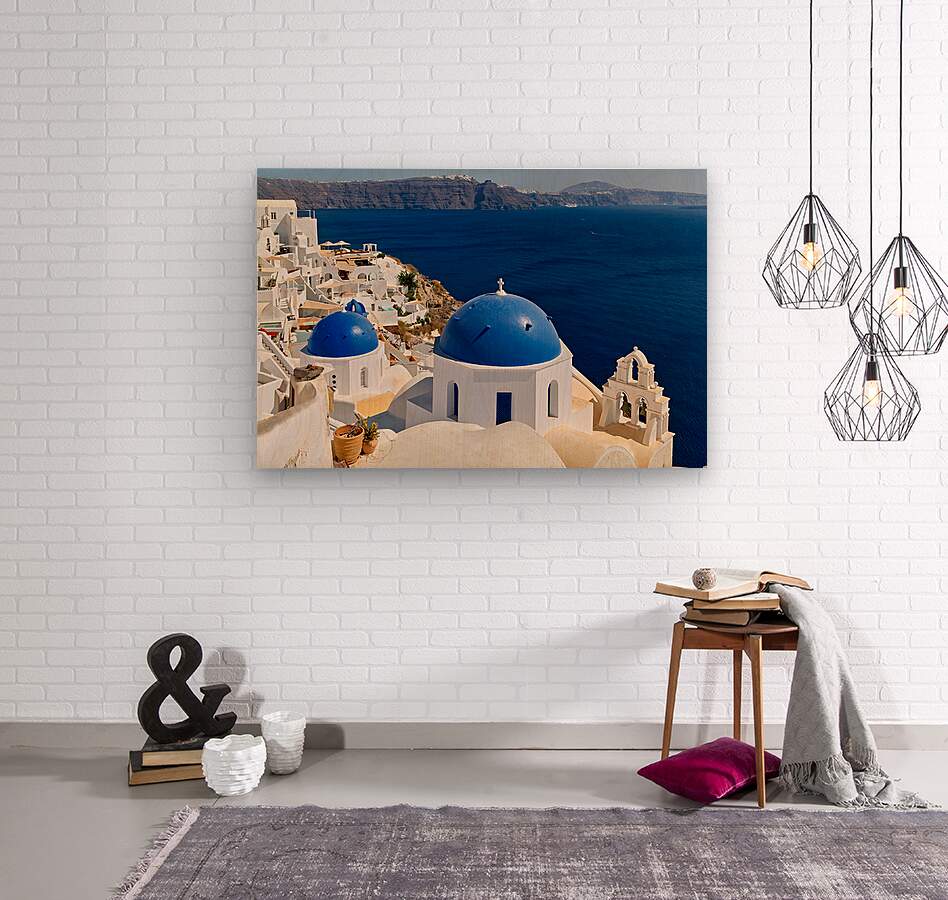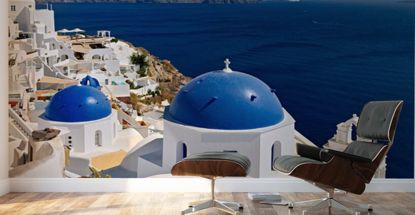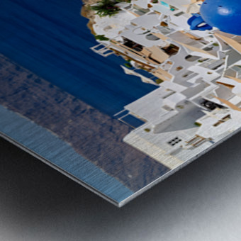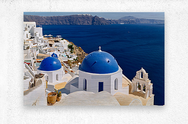 "Beautiful Santorini: White buildings blue domes and deep blue " in a framed print.
