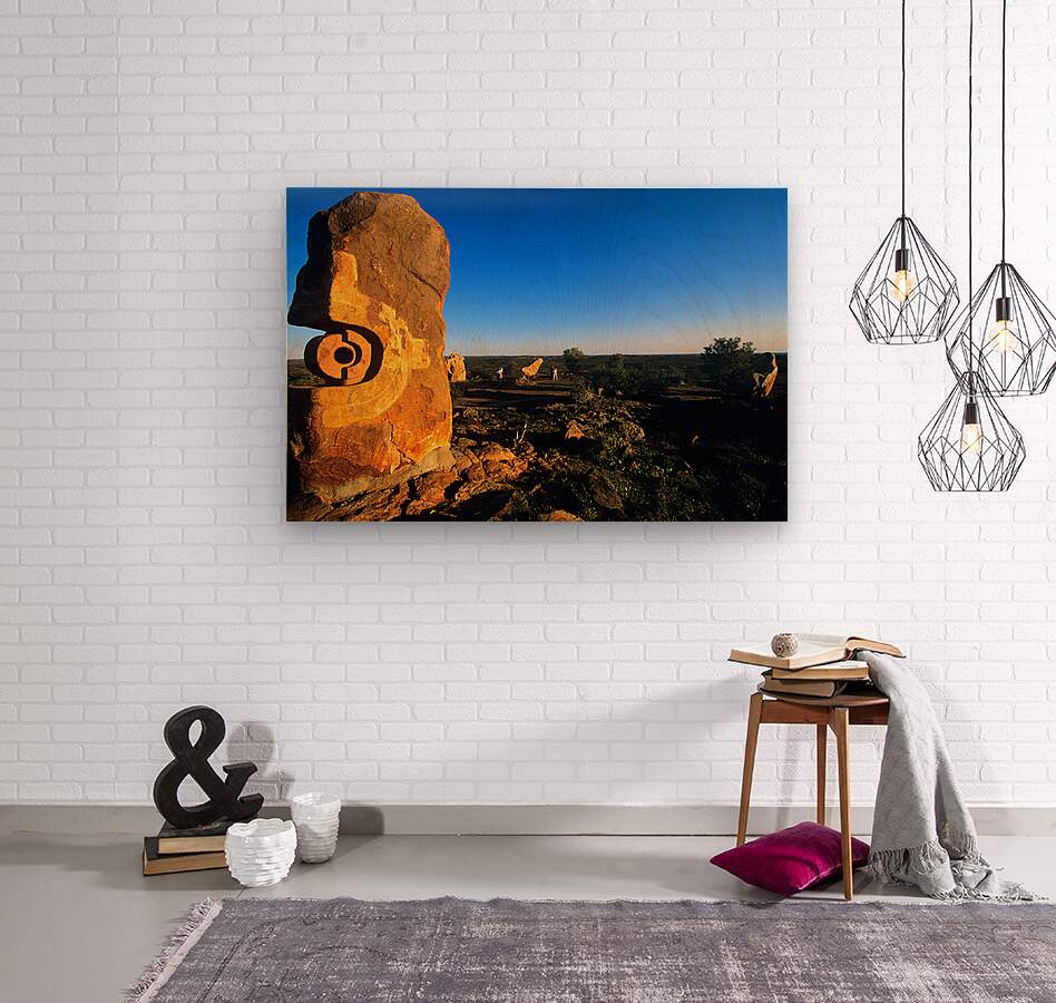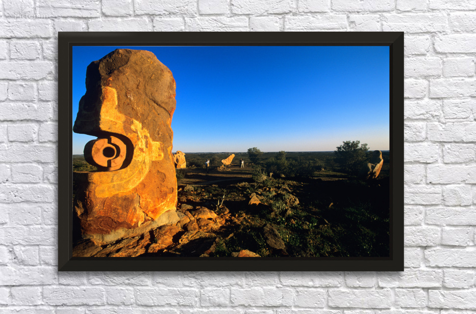 "Sandstone sculptures glow at sunset in the Australian outback." in a framed print.