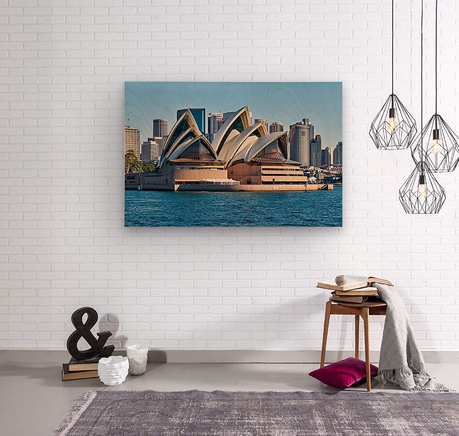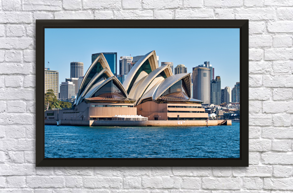 "Sydney Opera House and city skyline on a clear day." in a framed print.