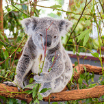 A koala sits on a tree branch eating eucalyptus leaves. Koalas are marsupials native to Australia and are known for their diet of eucalyptus.