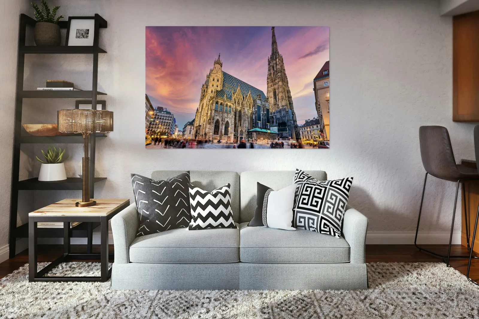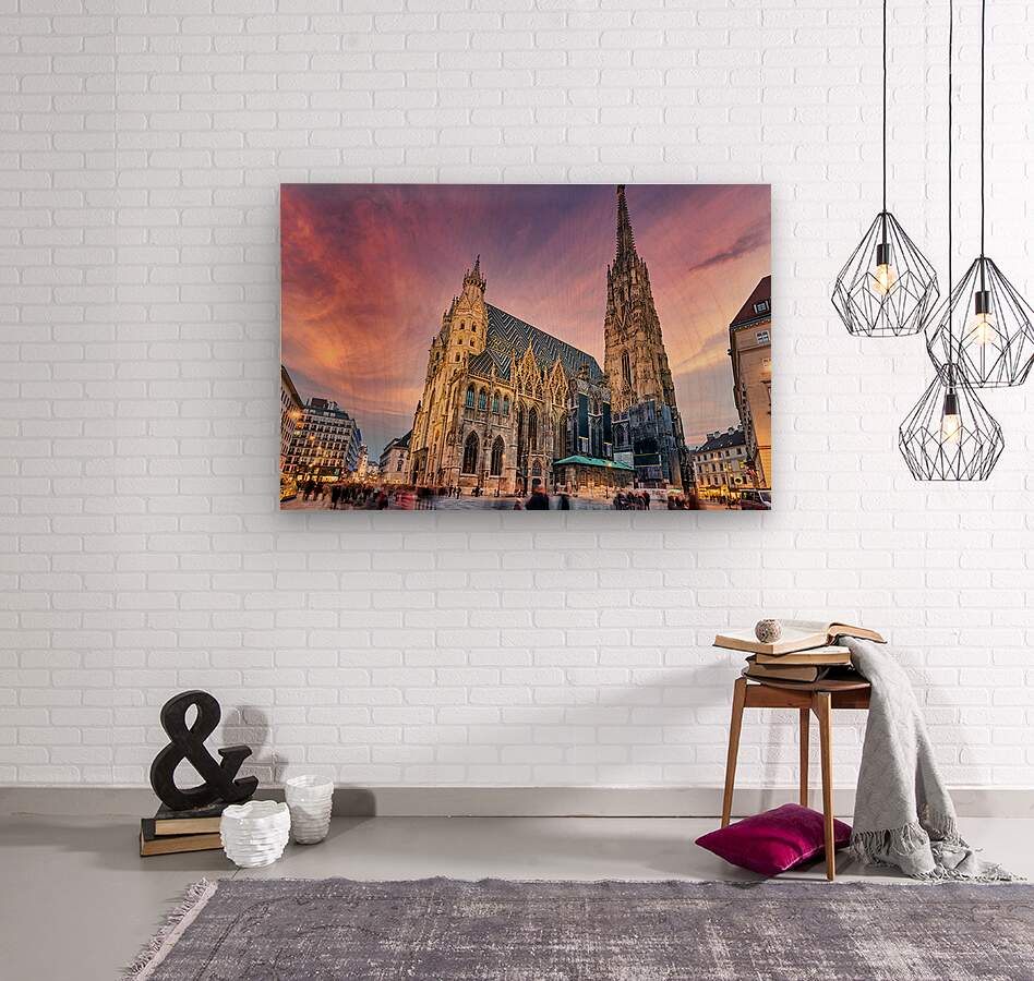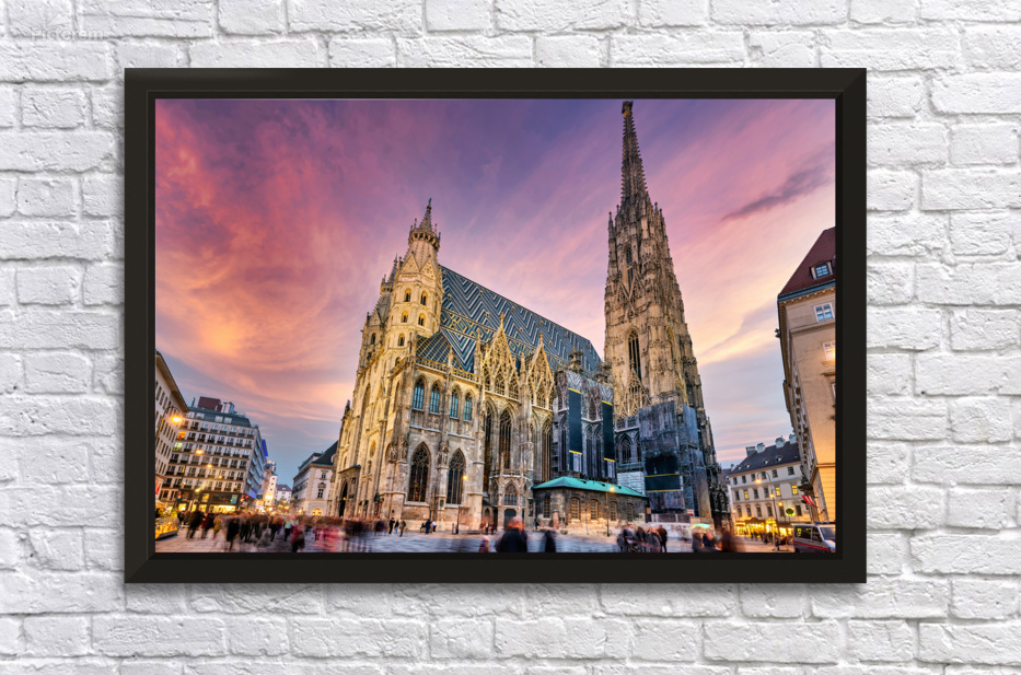 "Majestic St. Stephens Cathedral in Vienna under a colorful sky." in a framed print.