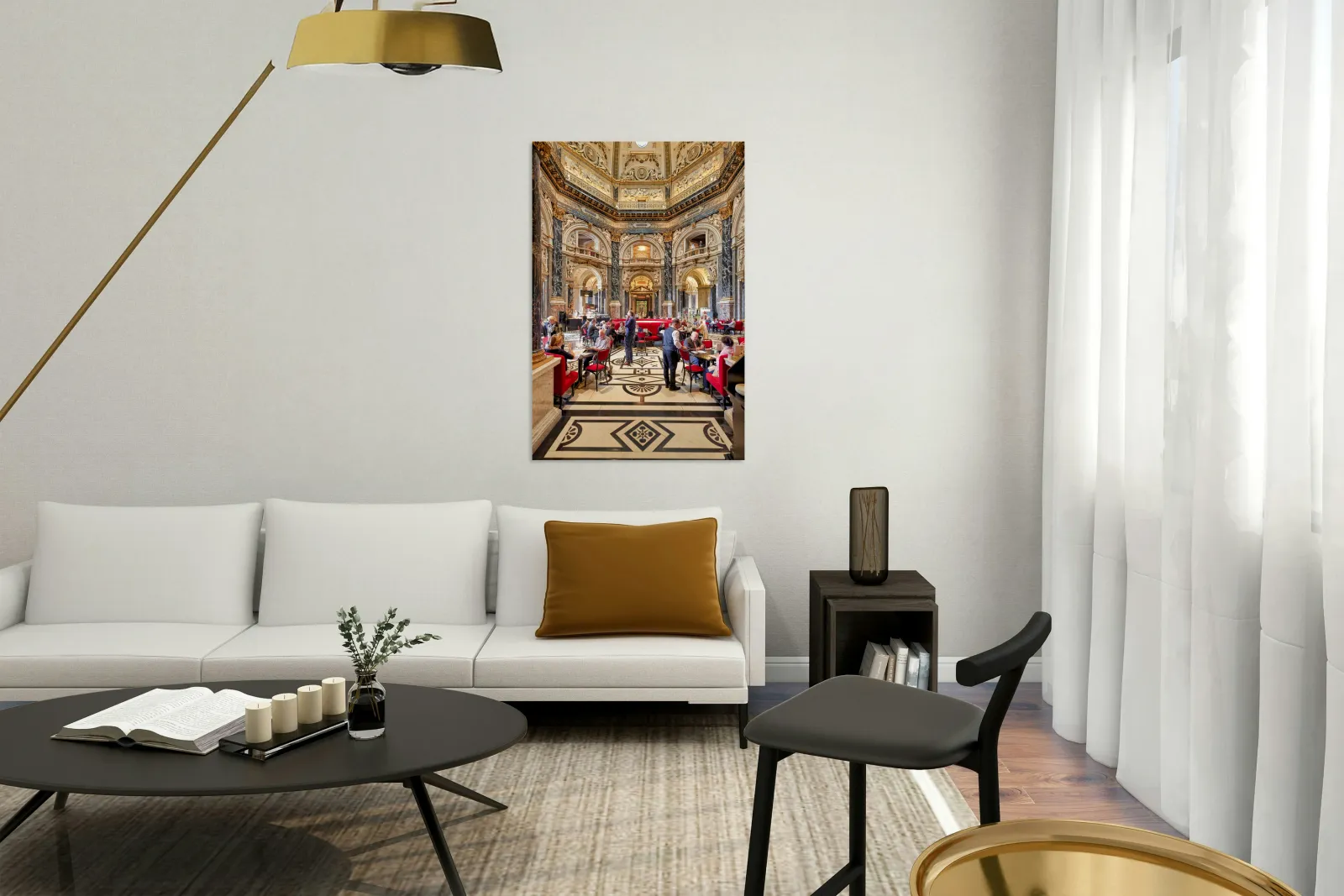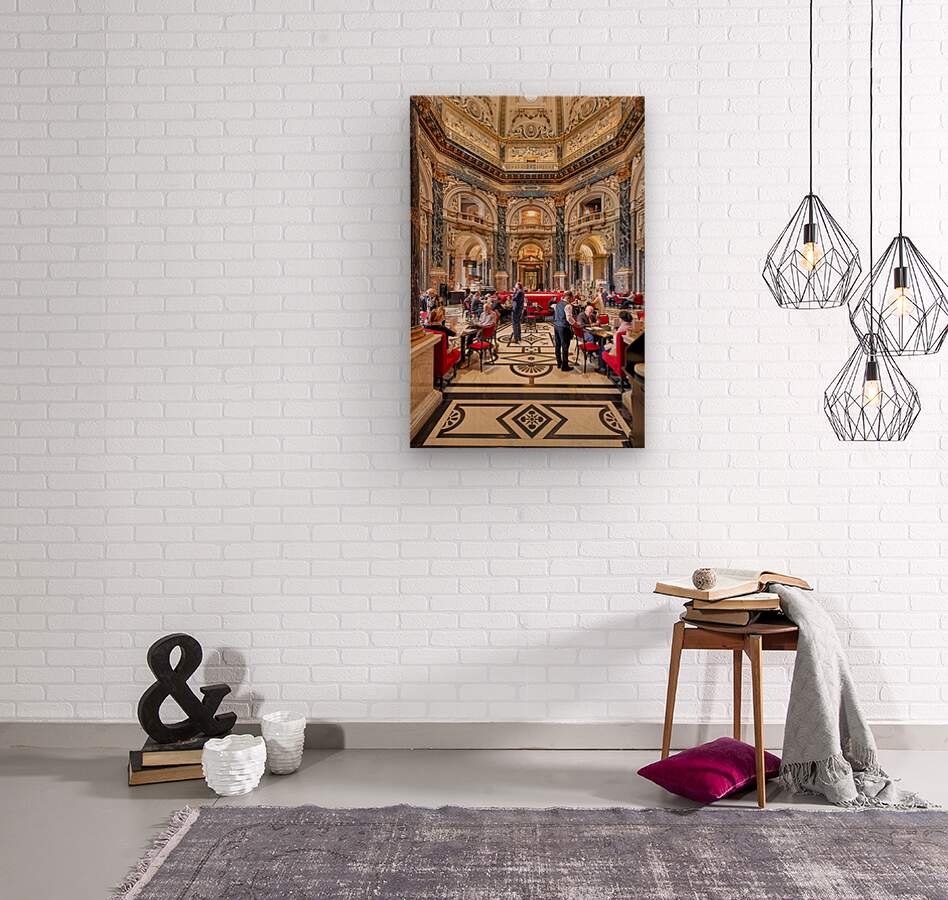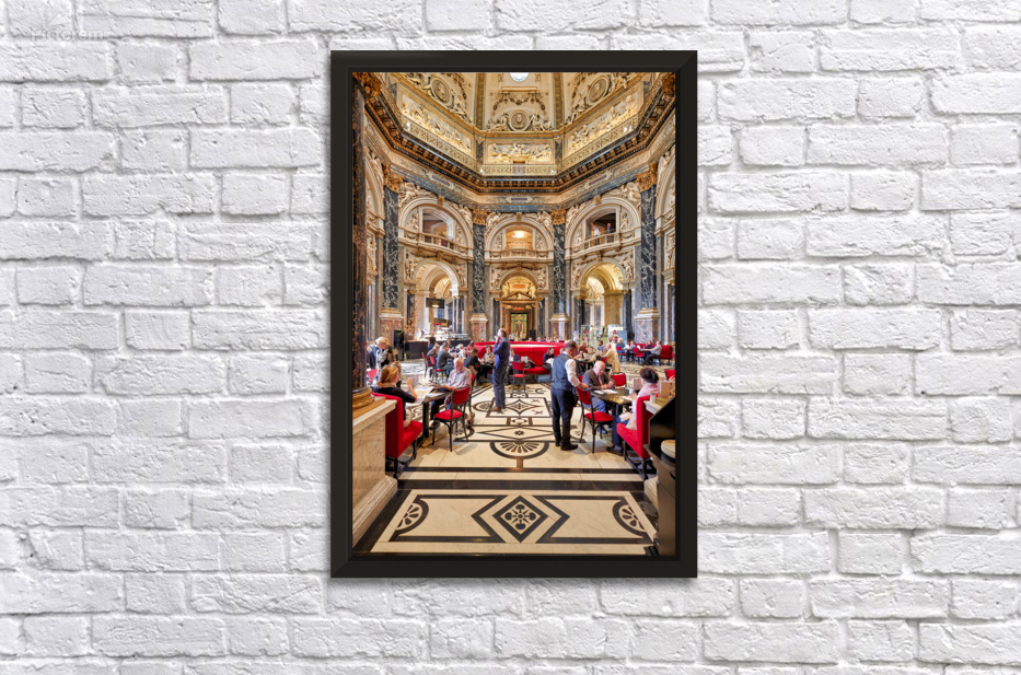 "People dining in a grand ornate museum cafe." in a framed print.