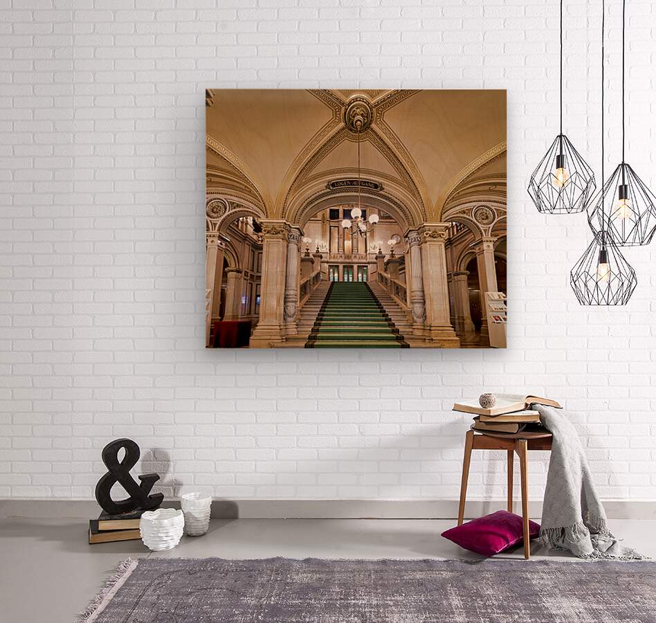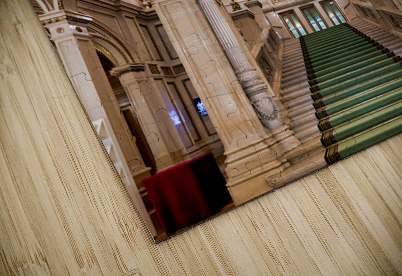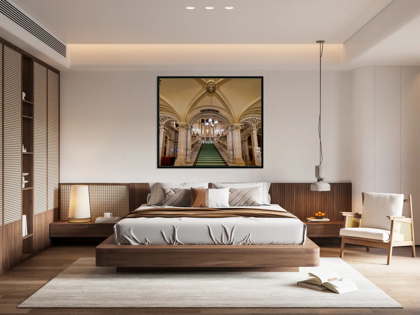 "Majestic staircase with green carpet in an ornate hall." in a framed print.