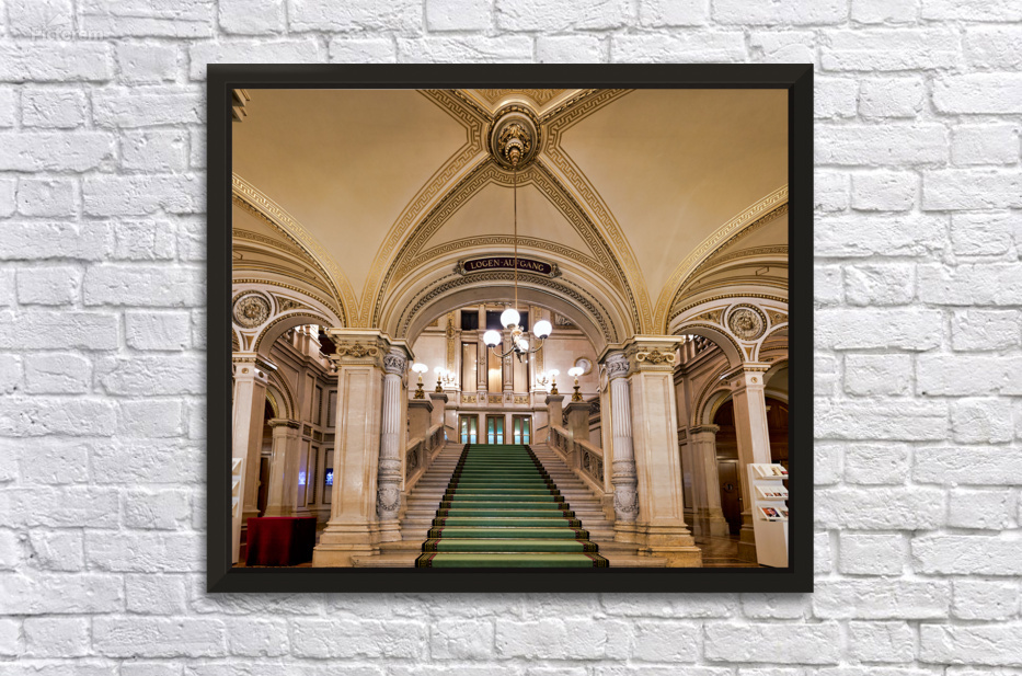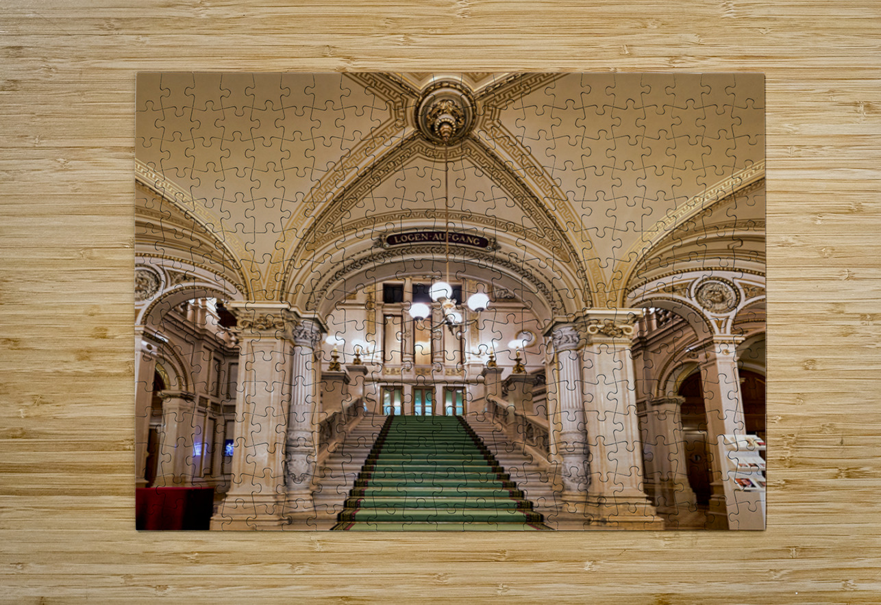 The opulent grand staircase with a green carpet and gilded details inside the Vienna State Opera House Austria leading to the Logen boxes.