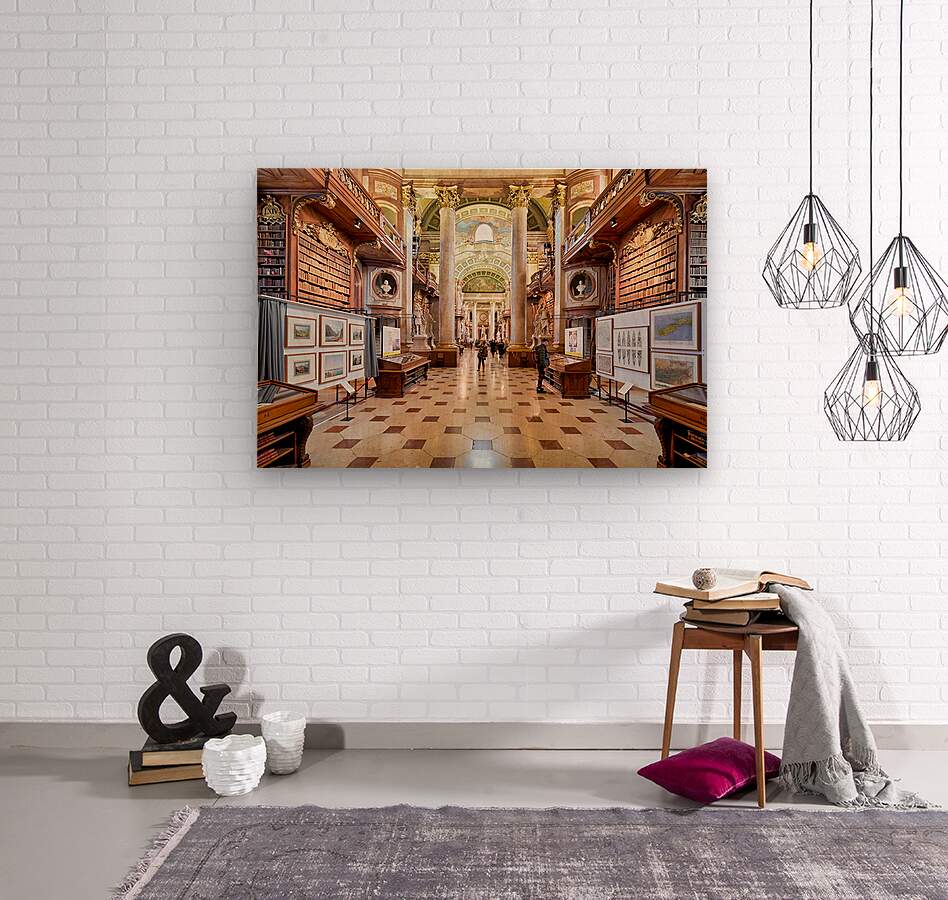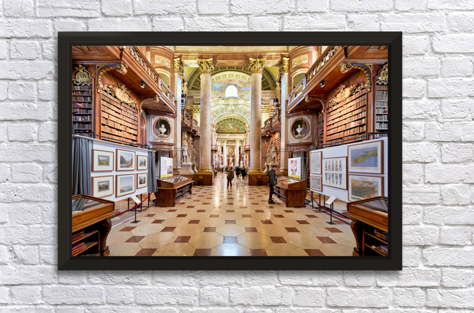 "Grand ornate library interior with books columns and visitors" in a framed print.