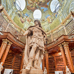 Emperor Charles VIs statue dominates the opulent State Hall of the Austrian National Library in Vienna Austria a Baroque masterpiece housing vast coll