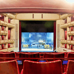"Grand opera house interior with stage crew working." in a framed print.