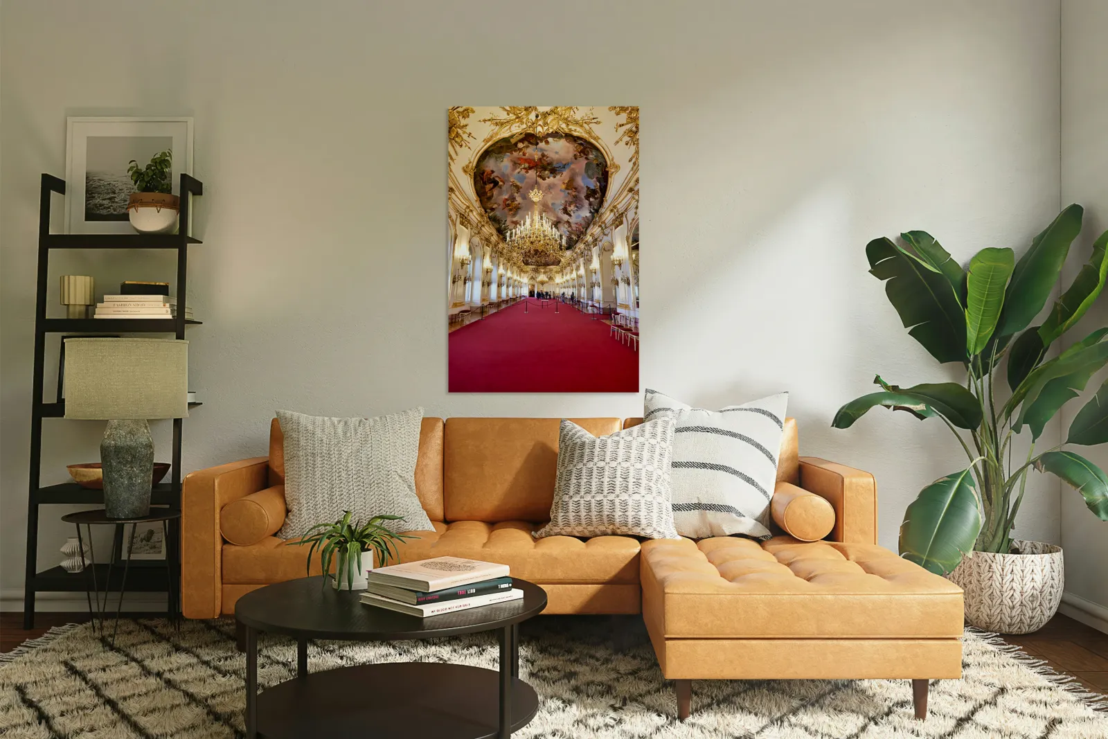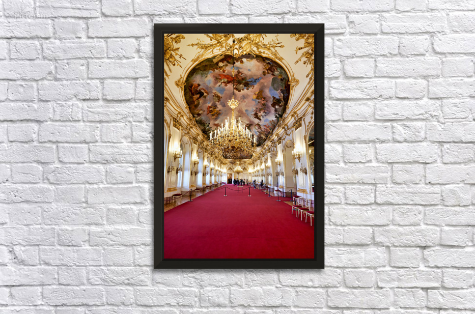 "Ornate palace hall with chandeliers painted ceiling and red ca" in a framed print.