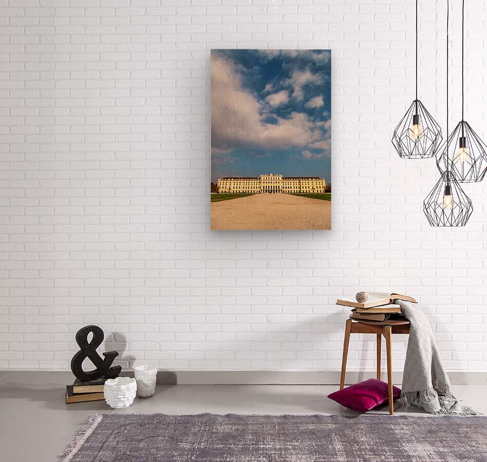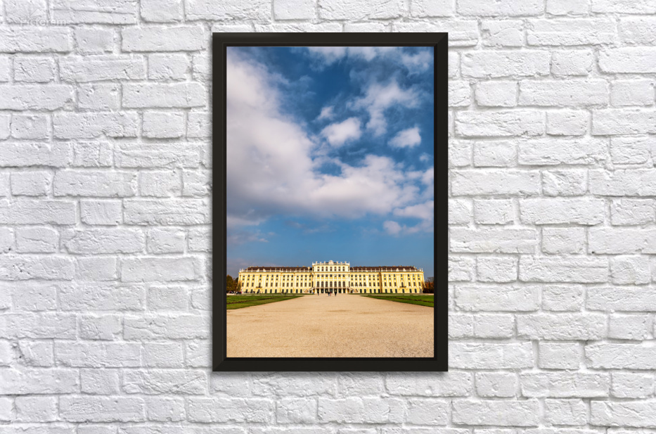 "Schönbrunn Palace and gardens under a beautiful cloudy sky." in a framed print.