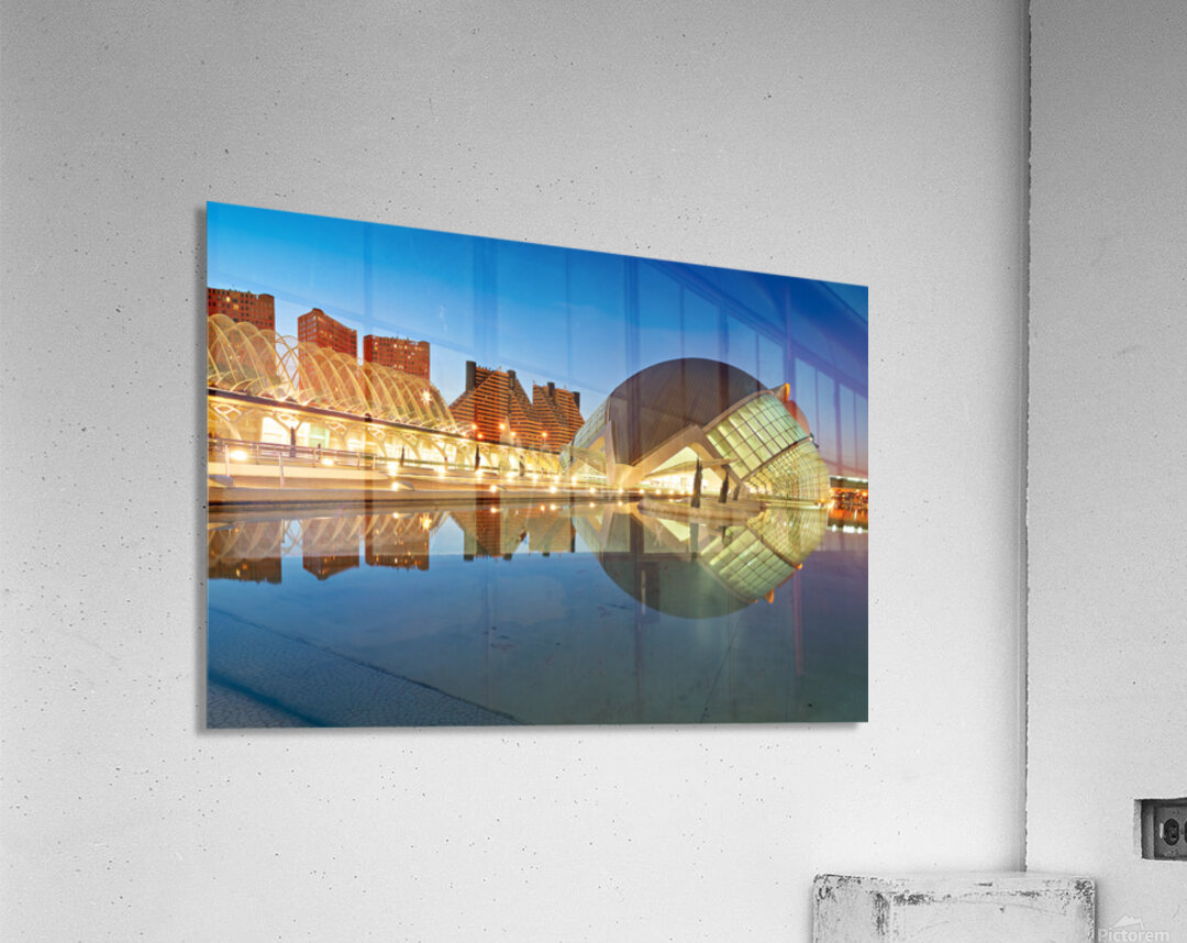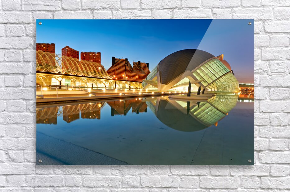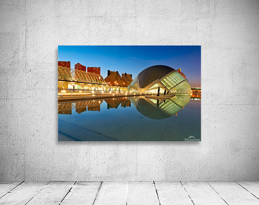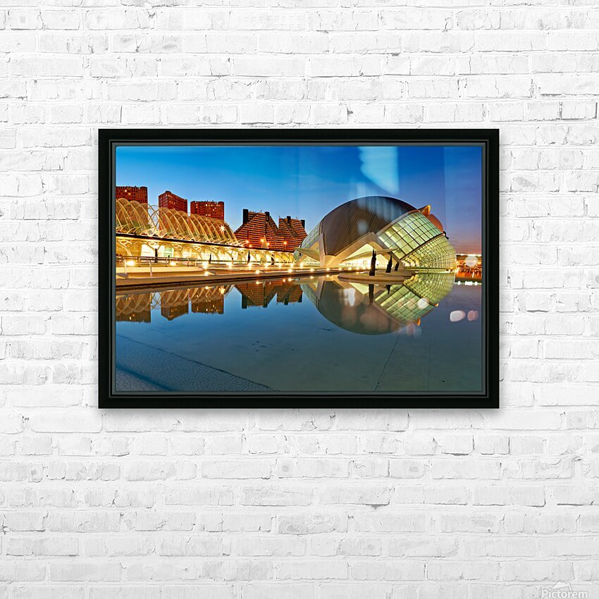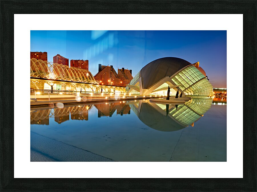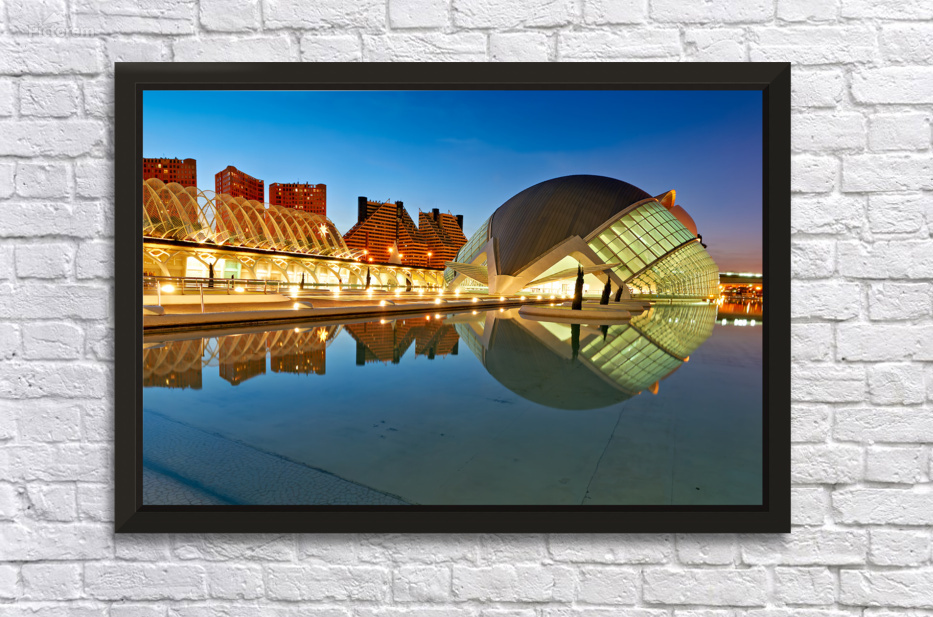 "View of Hemisferic in Valencia Spain during night time" in a framed print.
