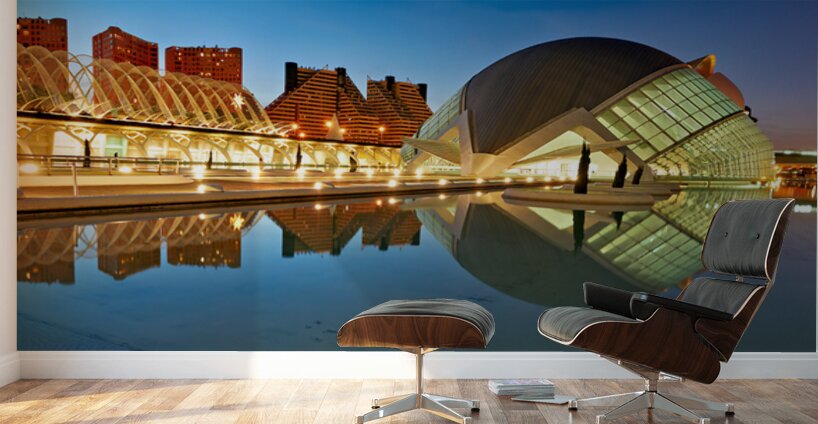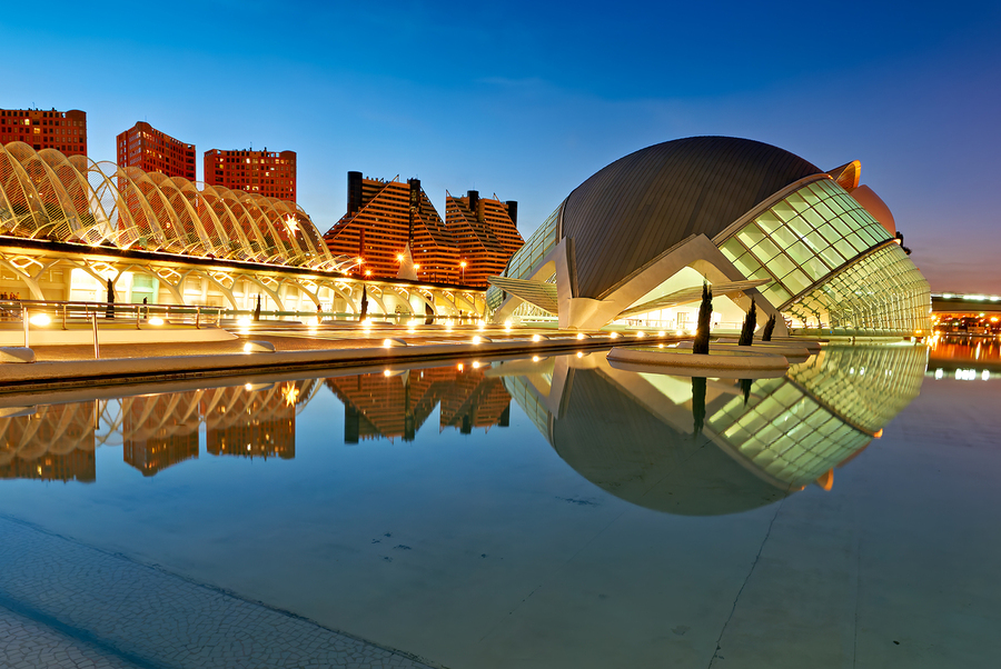 Hemisferic stands in Valencia Spain reflecting in water as lights illuminate the evening. Visitors explore the area and enjoy the view.