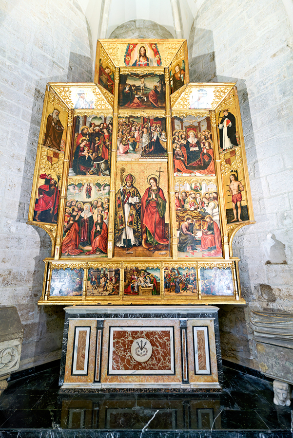 Visitors view the altarpiece in Capilla de San Dionisio at Valencia Cathedral. The artwork features many figures and religious scenes.
