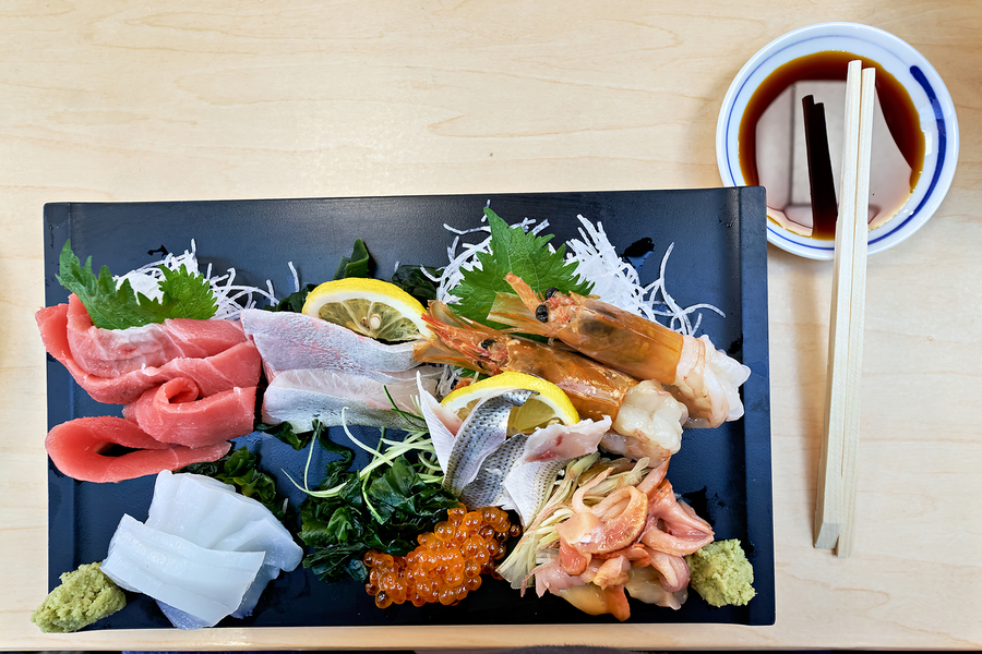 A plate of sashimi is served with fresh fish and garnishments in Tokyo Japan. It awaits tasting alongside chopsticks and dipping sauce.