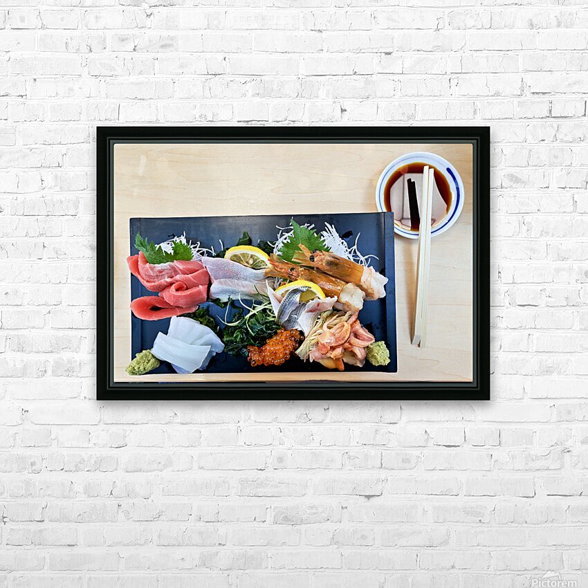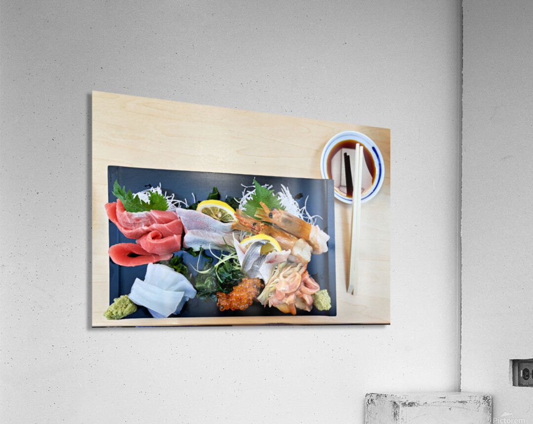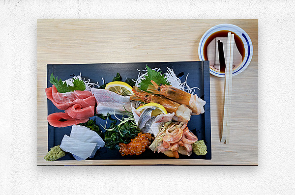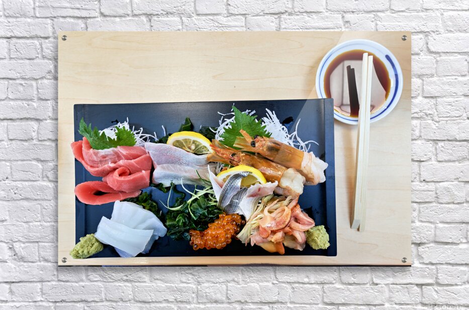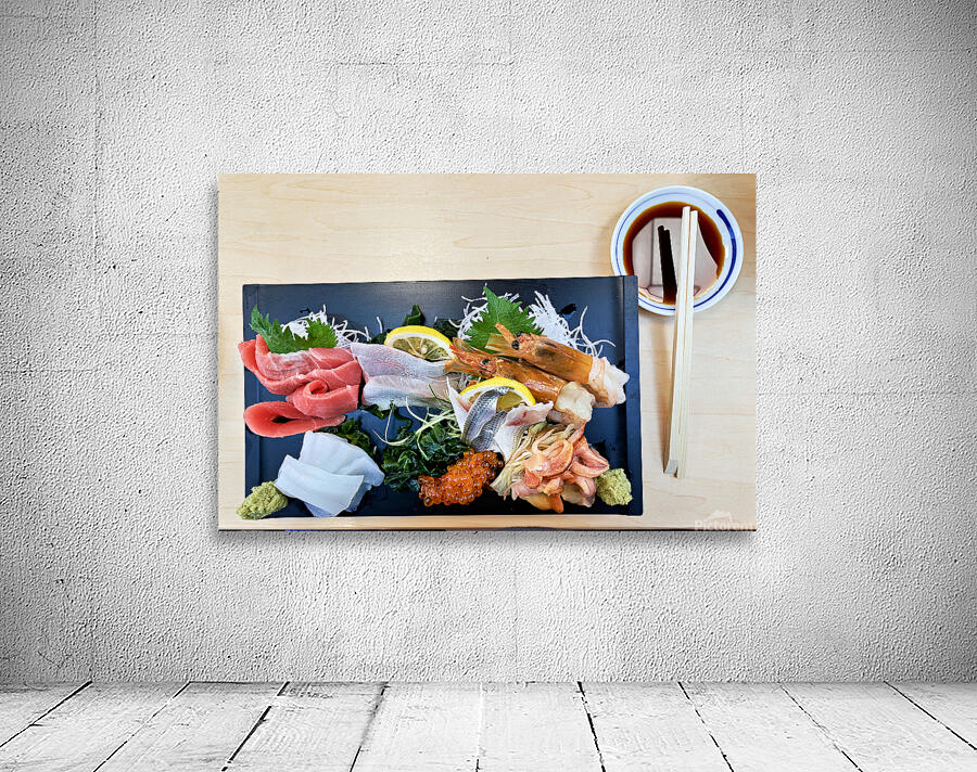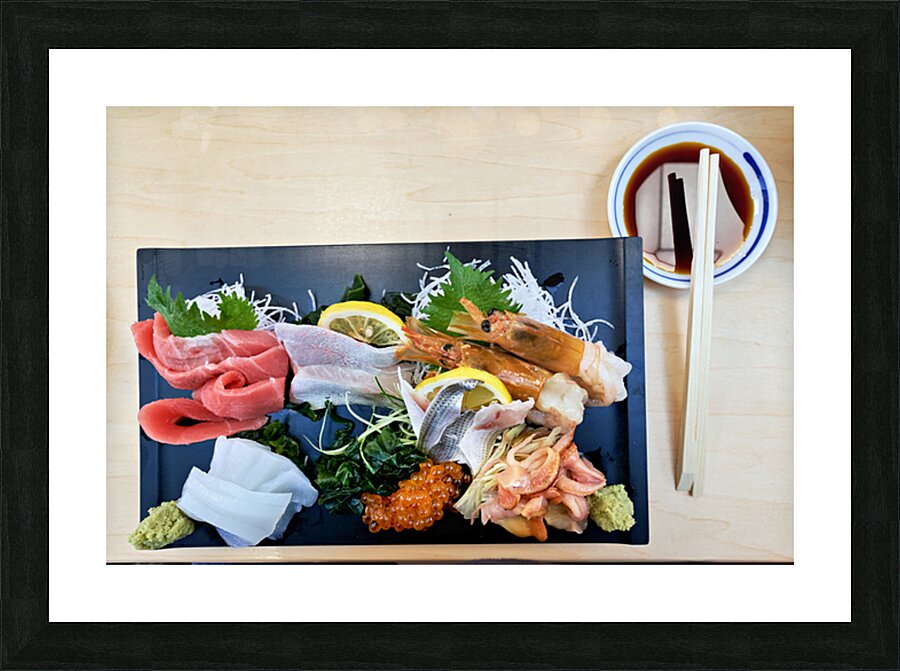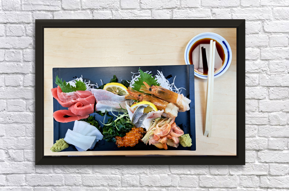 "Sashimi plate prepared for tasting in Tokyo Japan at a restaura" in a framed print.