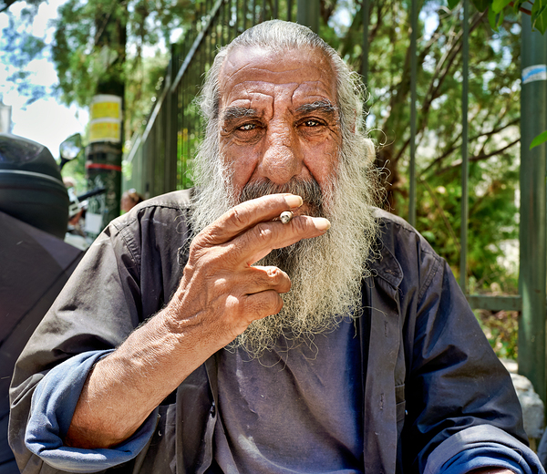 A man with a beard sits outside holding a cigarette. He looks directly at the viewer with an expression that shows life experience.