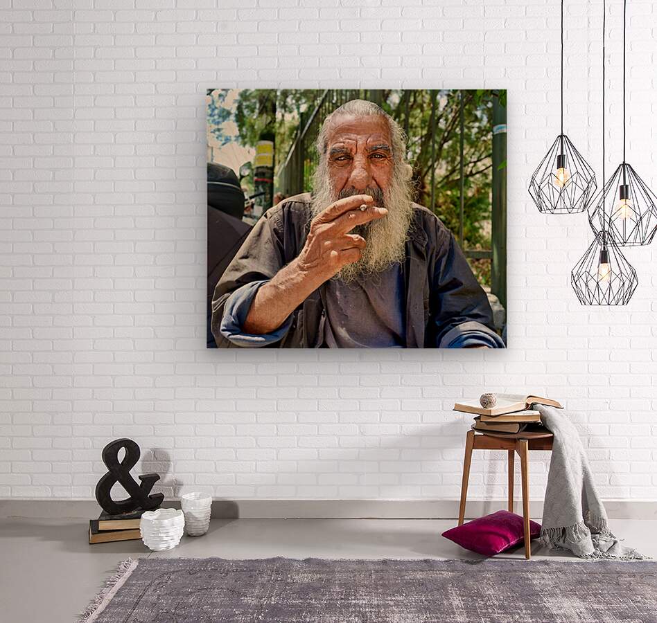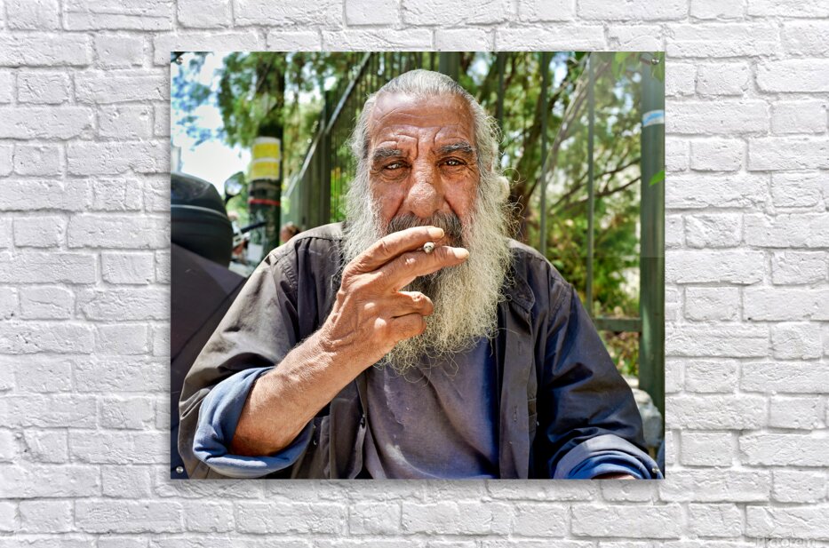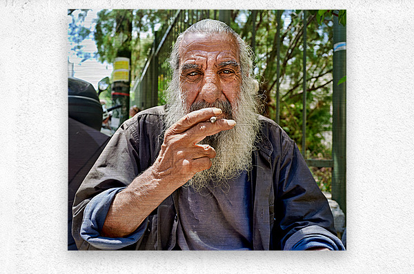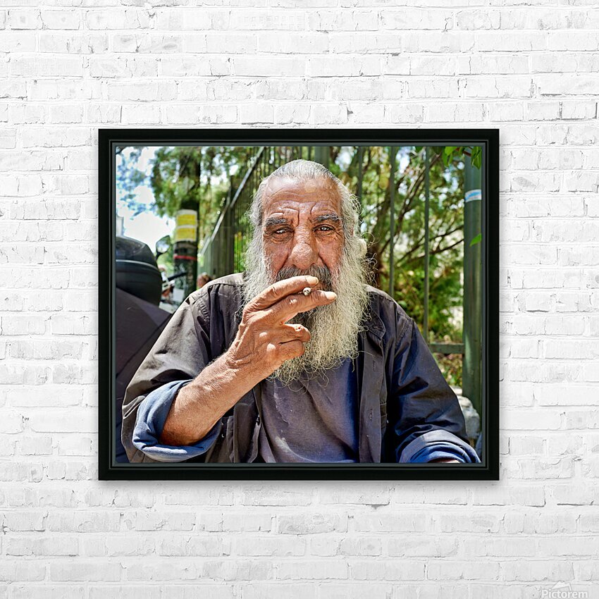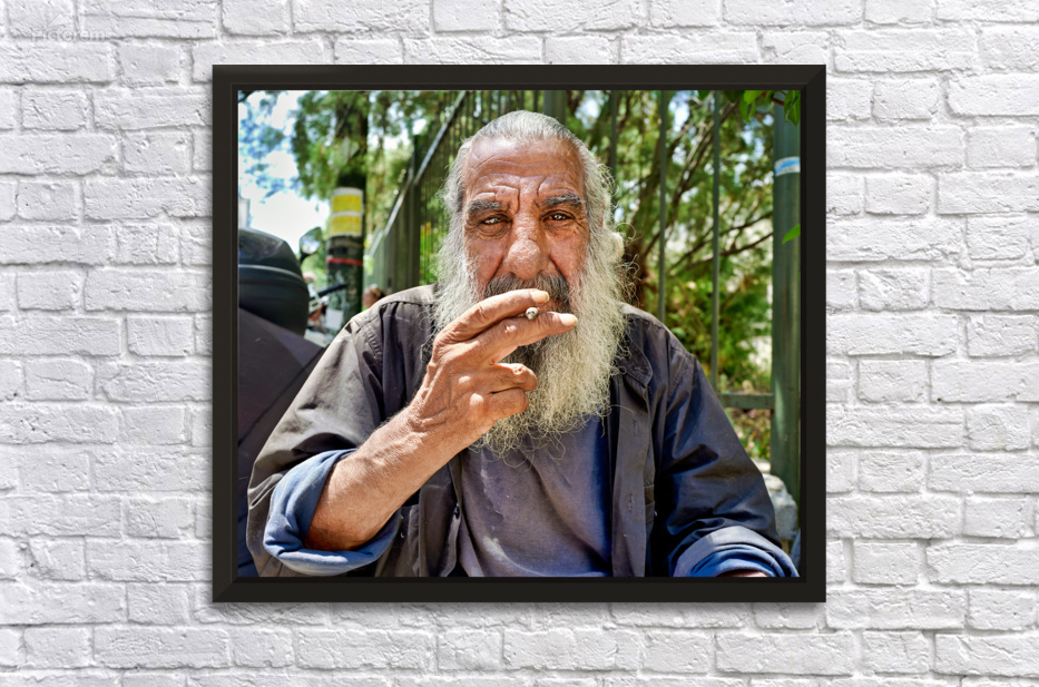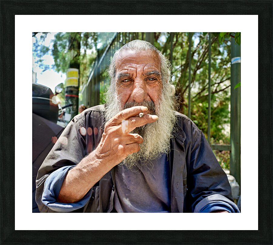 "Man sitting outside with a cigarette and a beard" in a framed print.