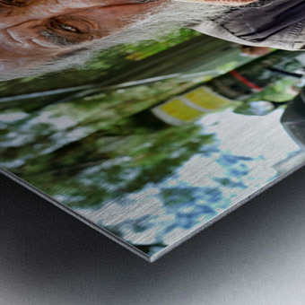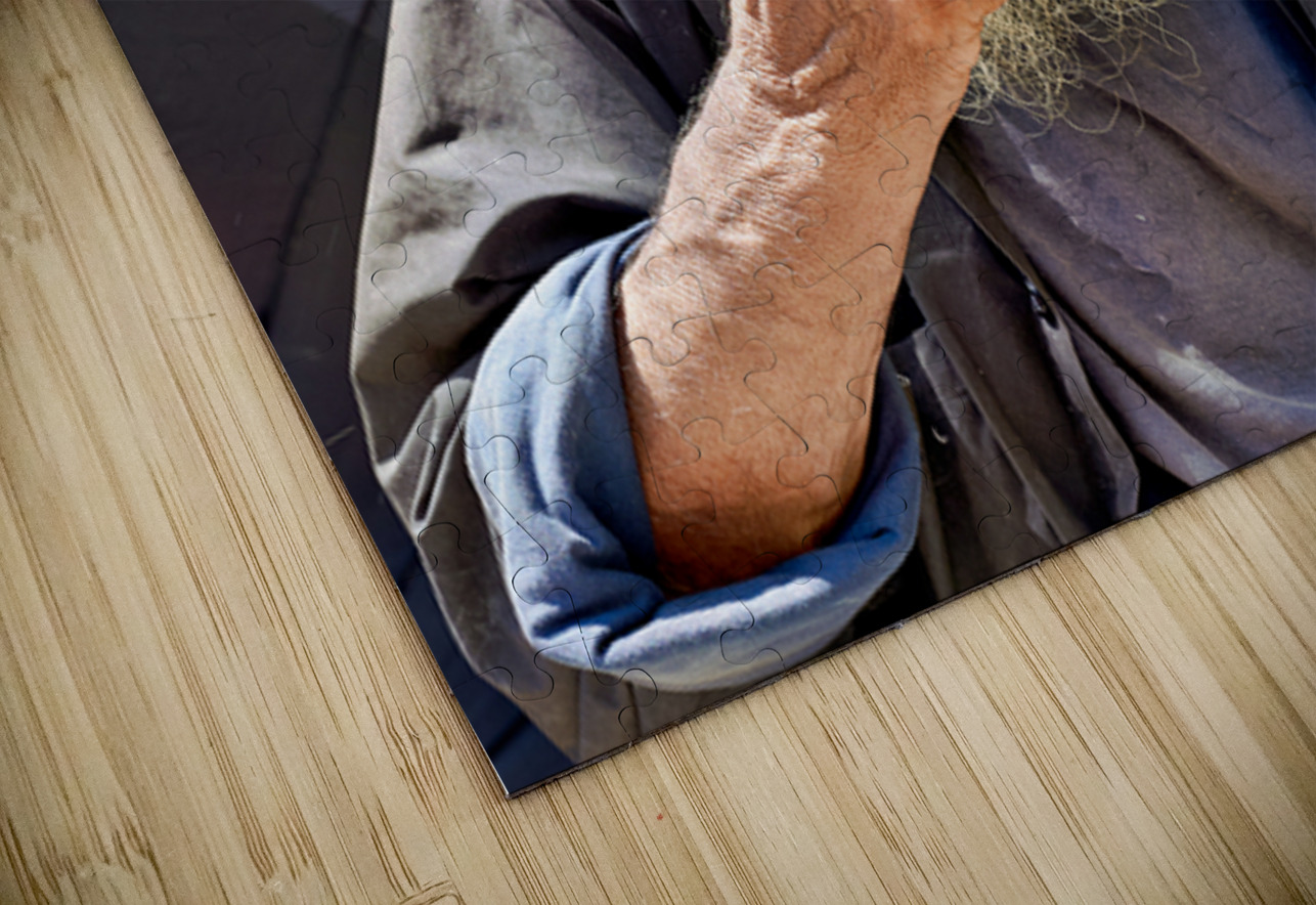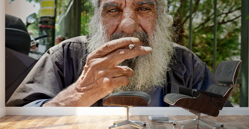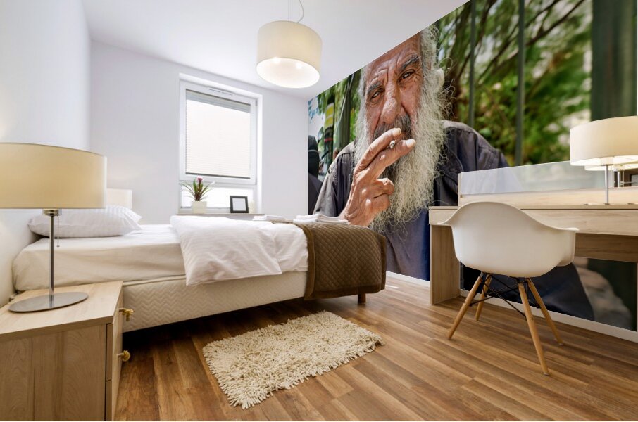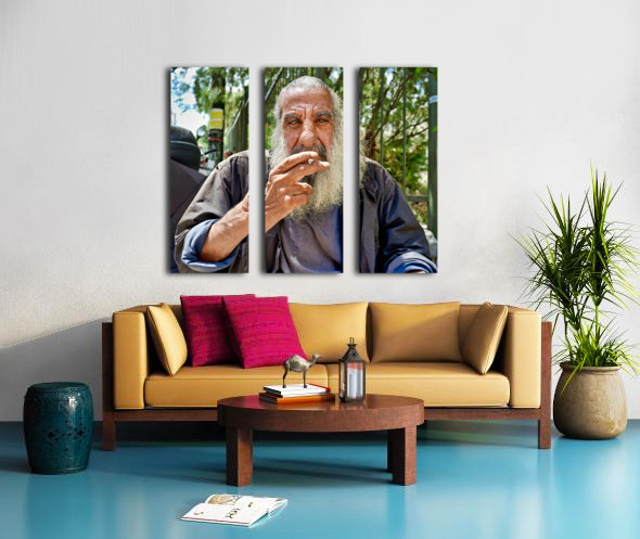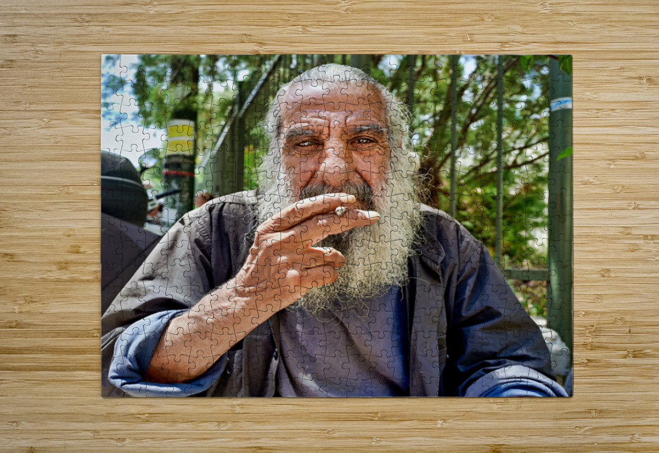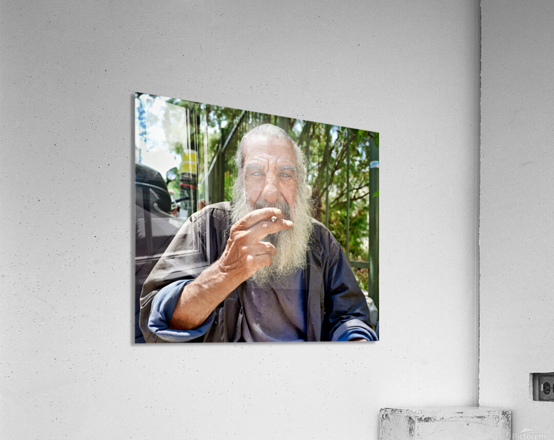 "Man sitting outside with a cigarette and a beard" in a framed print.
