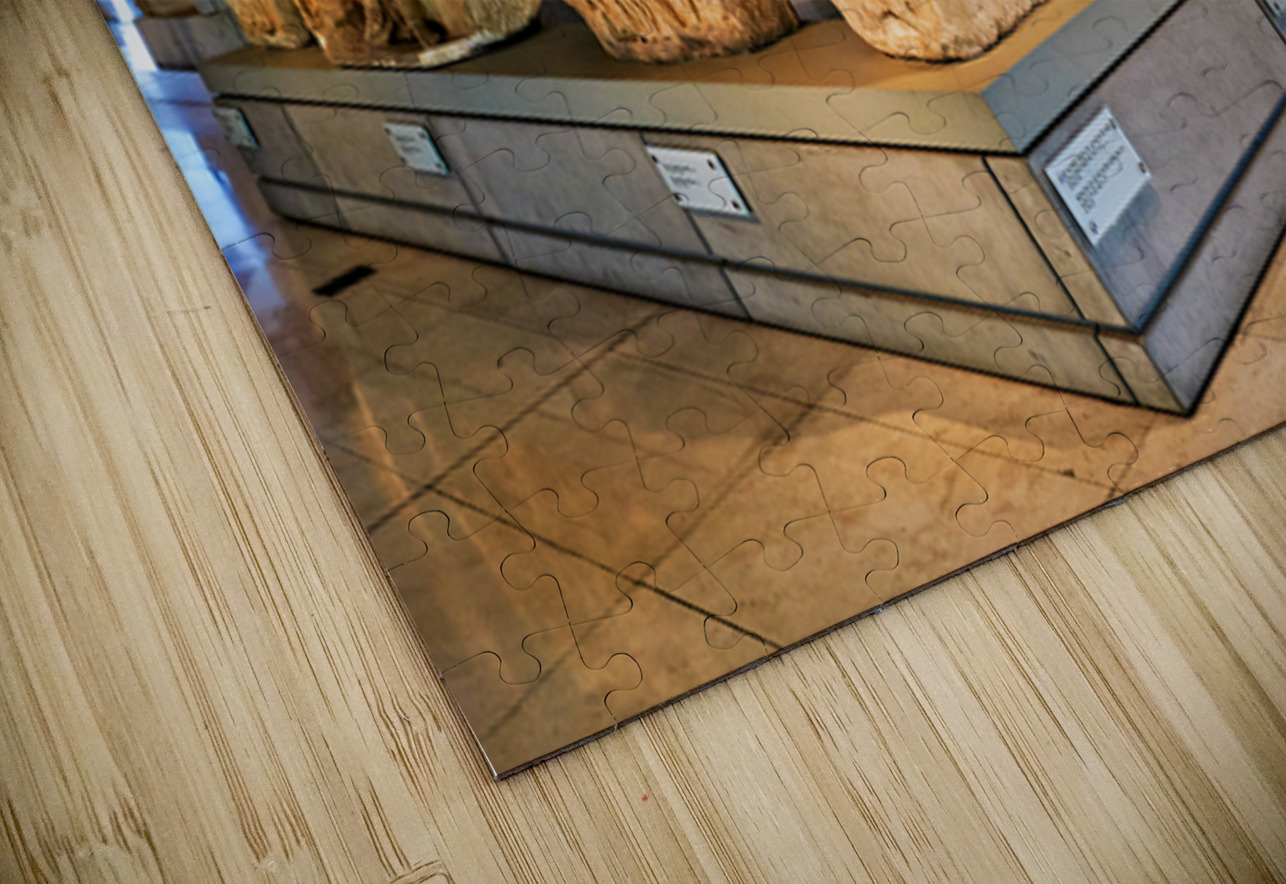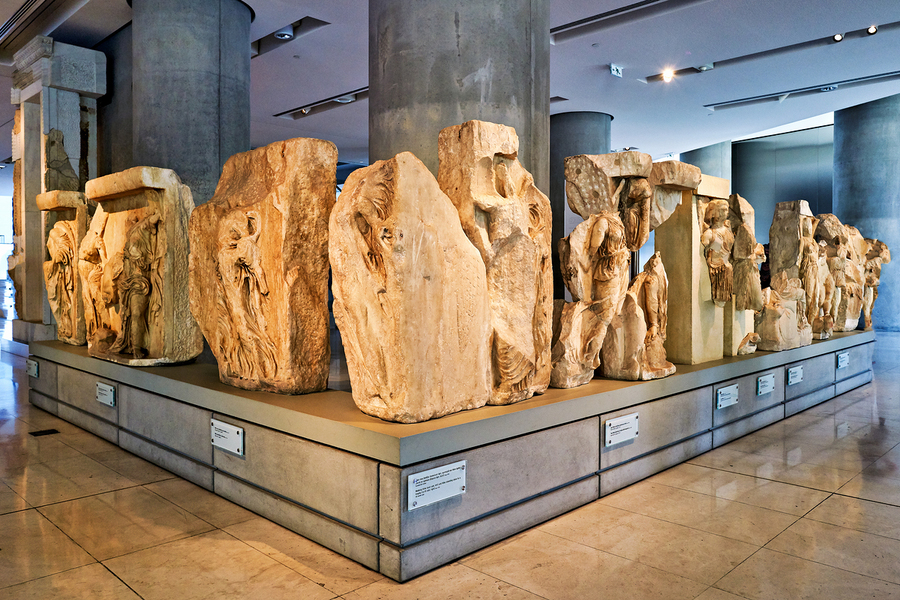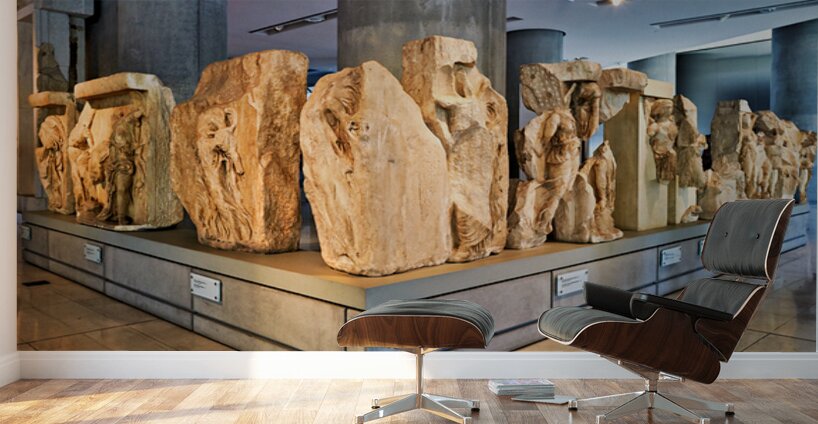 Visitors explore the Acropolis Museum in Athens Greece. The area showcases ancient sculptures and historical artifacts gathered from the Acropolis.