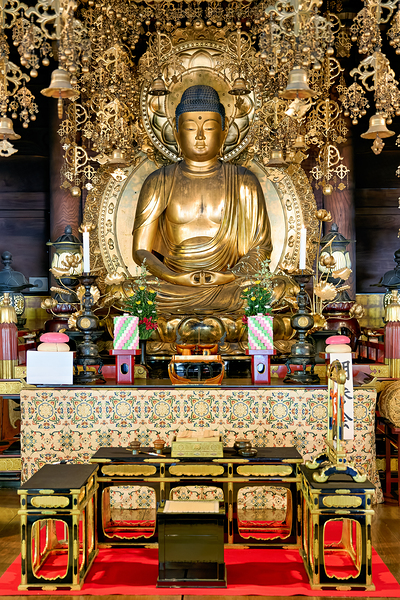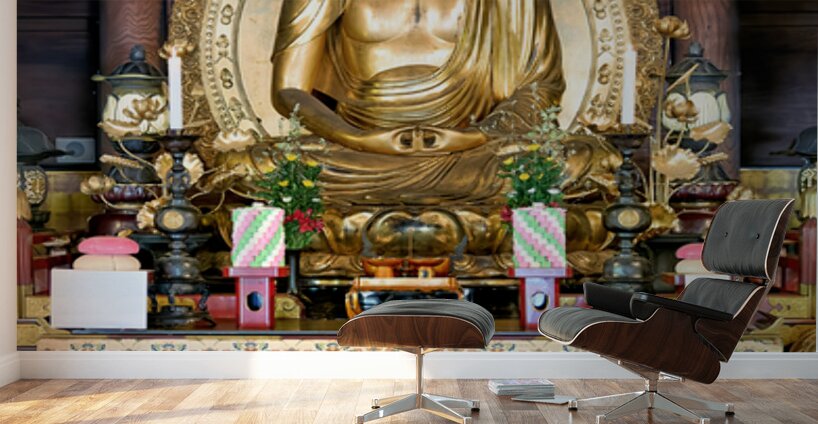 Visitors view a golden Buddha statue inside Chion-in temple in Kyoto. The statue is surrounded by decorations and offerings.