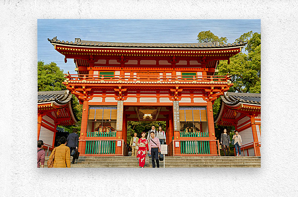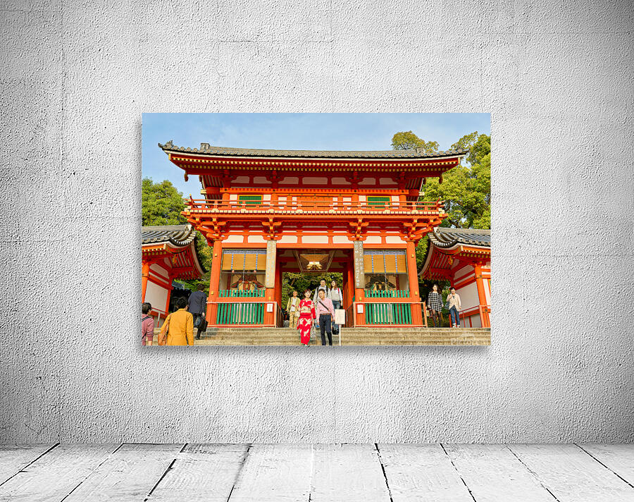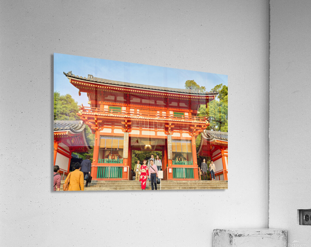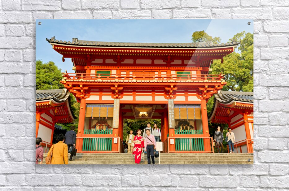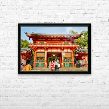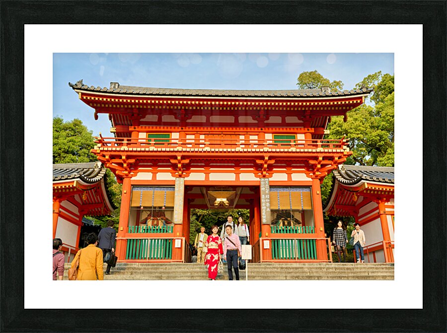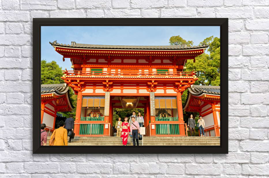 "Yasaka shrine temple in Kyoto during a sunny day with visitors" in a framed print.