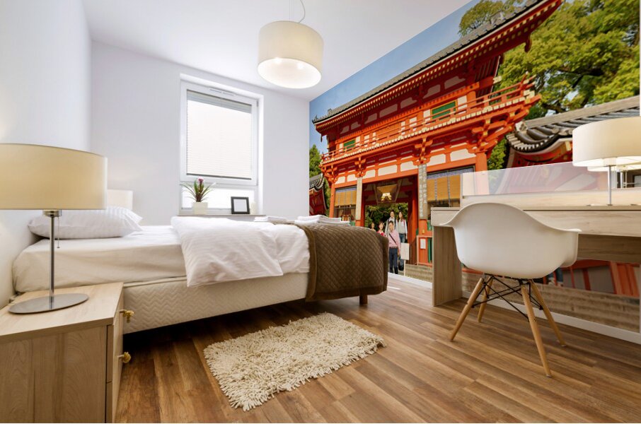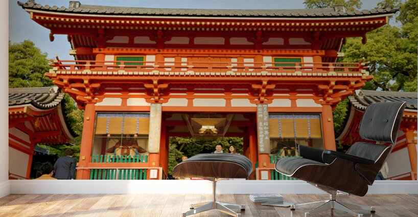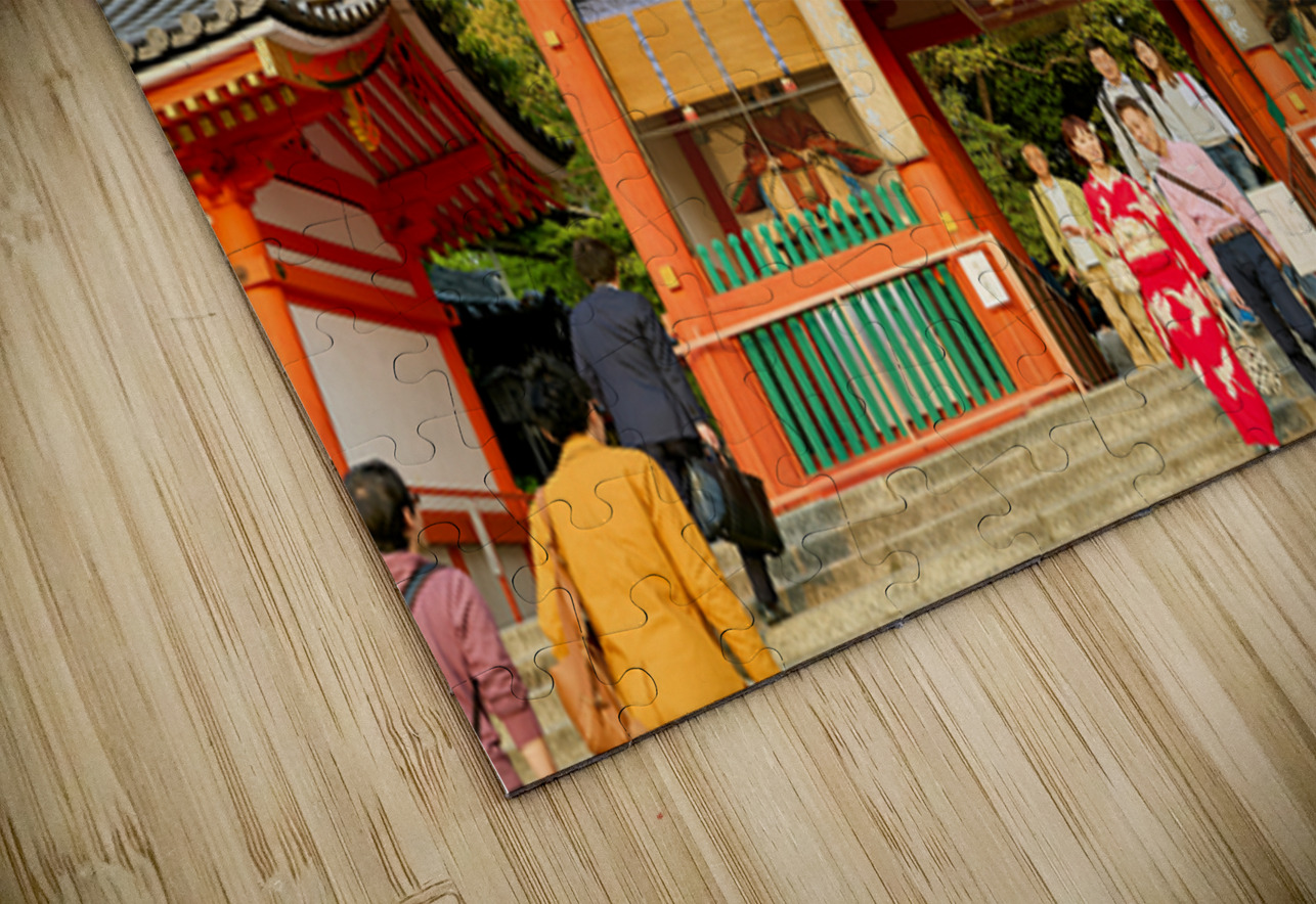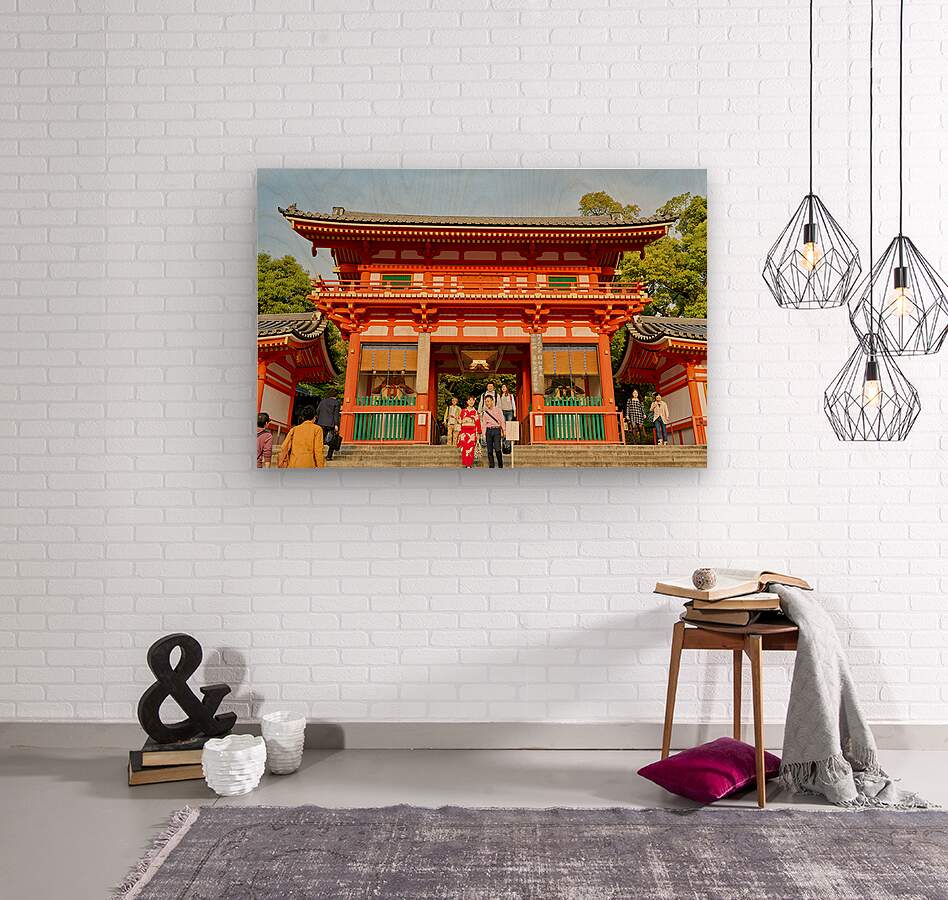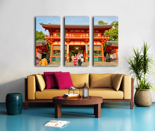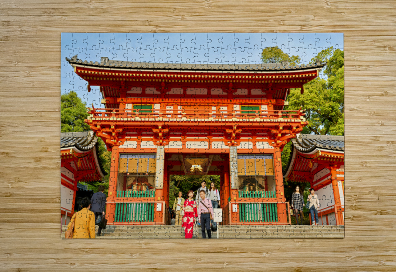 "Yasaka shrine temple in Kyoto during a sunny day with visitors" in a framed print.