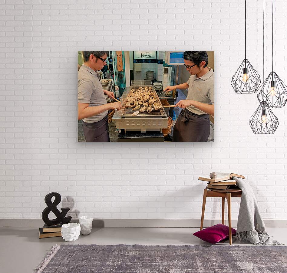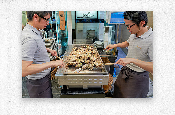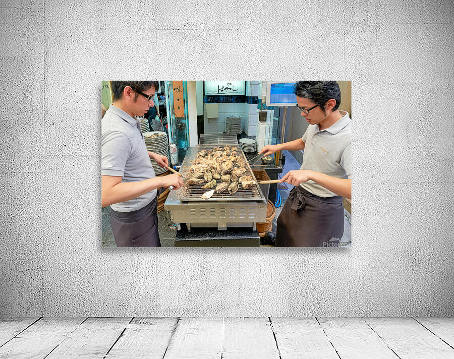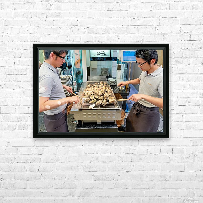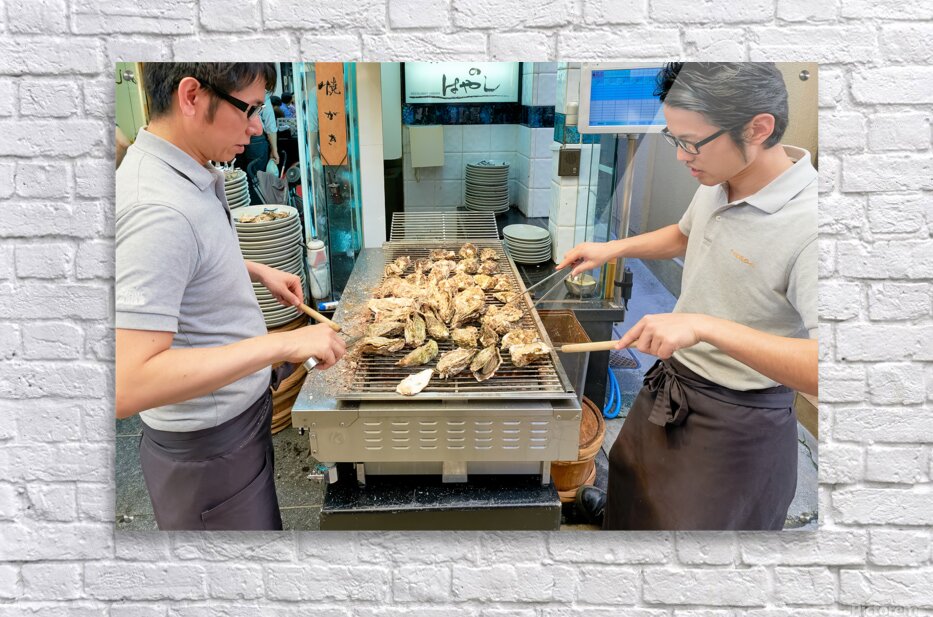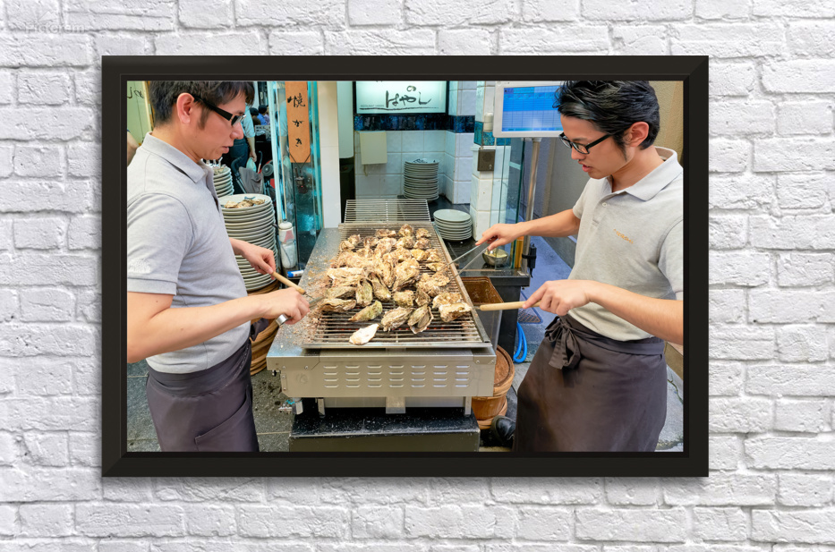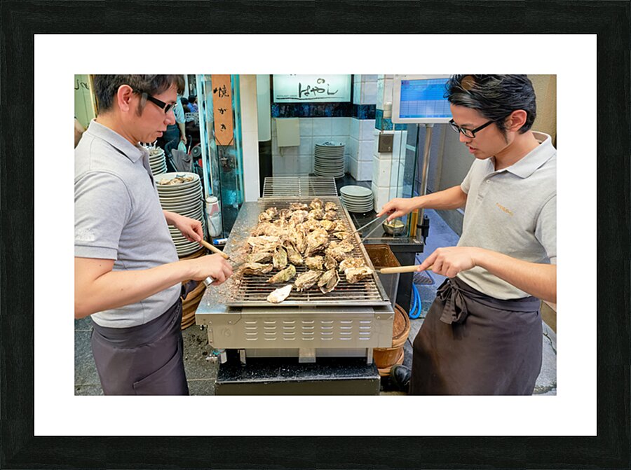 "Grilling oysters at a restaurant in Miyajima Hiroshima Japan" in a framed print.
