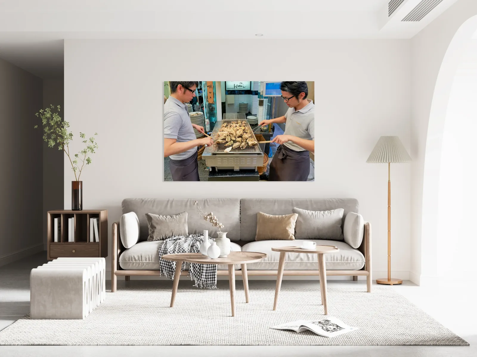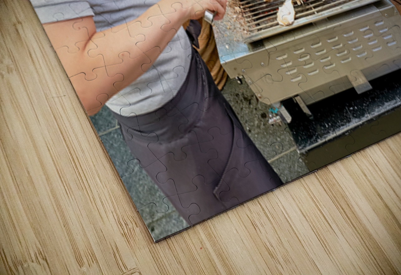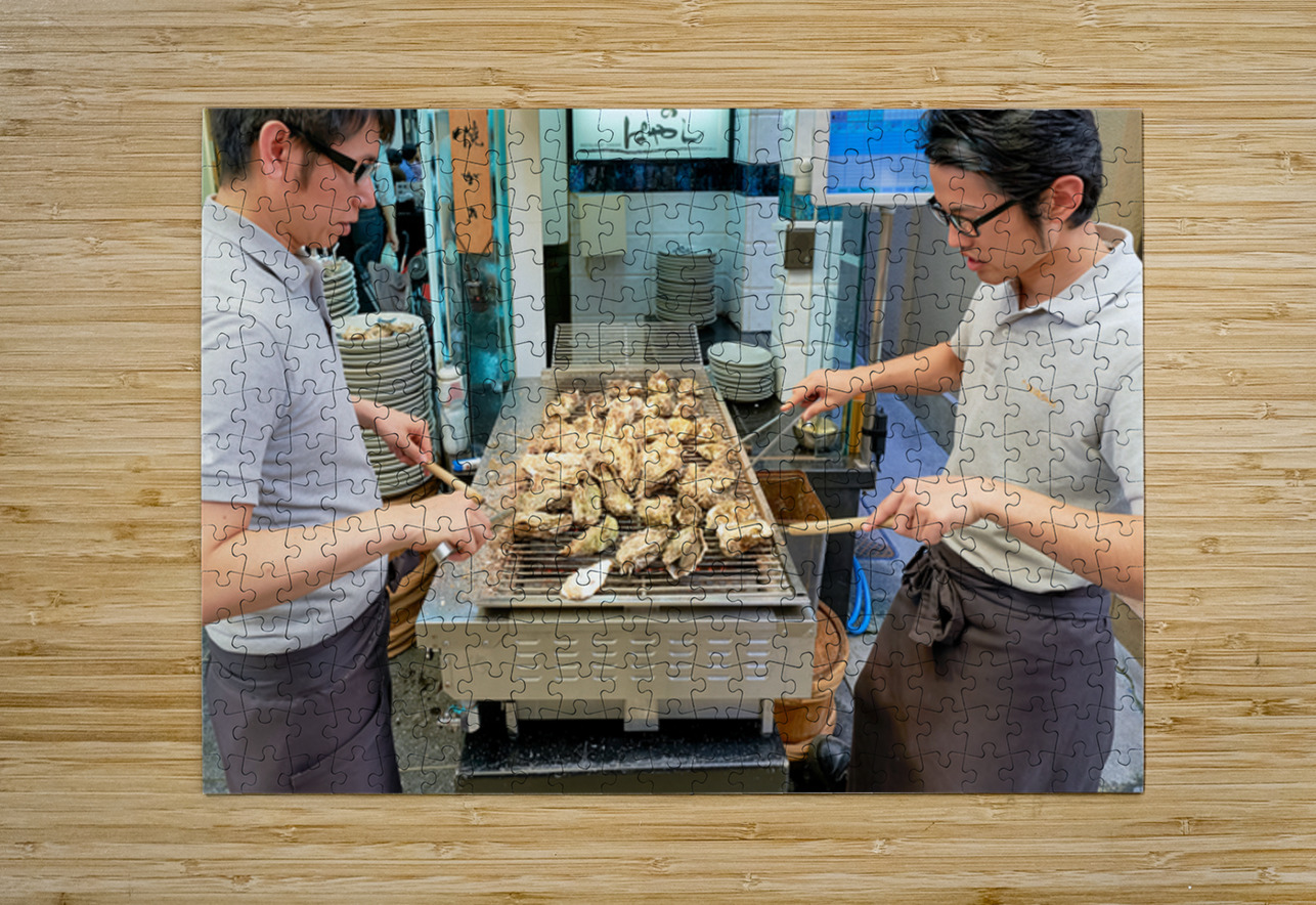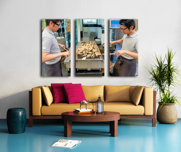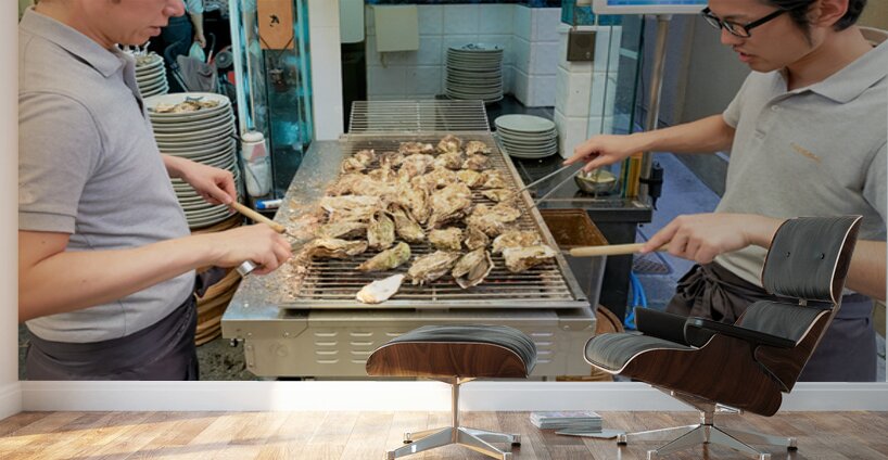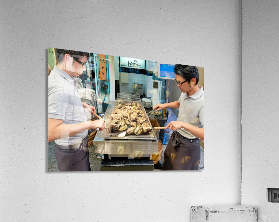 "Grilling oysters at a restaurant in Miyajima Hiroshima Japan" in a framed print.